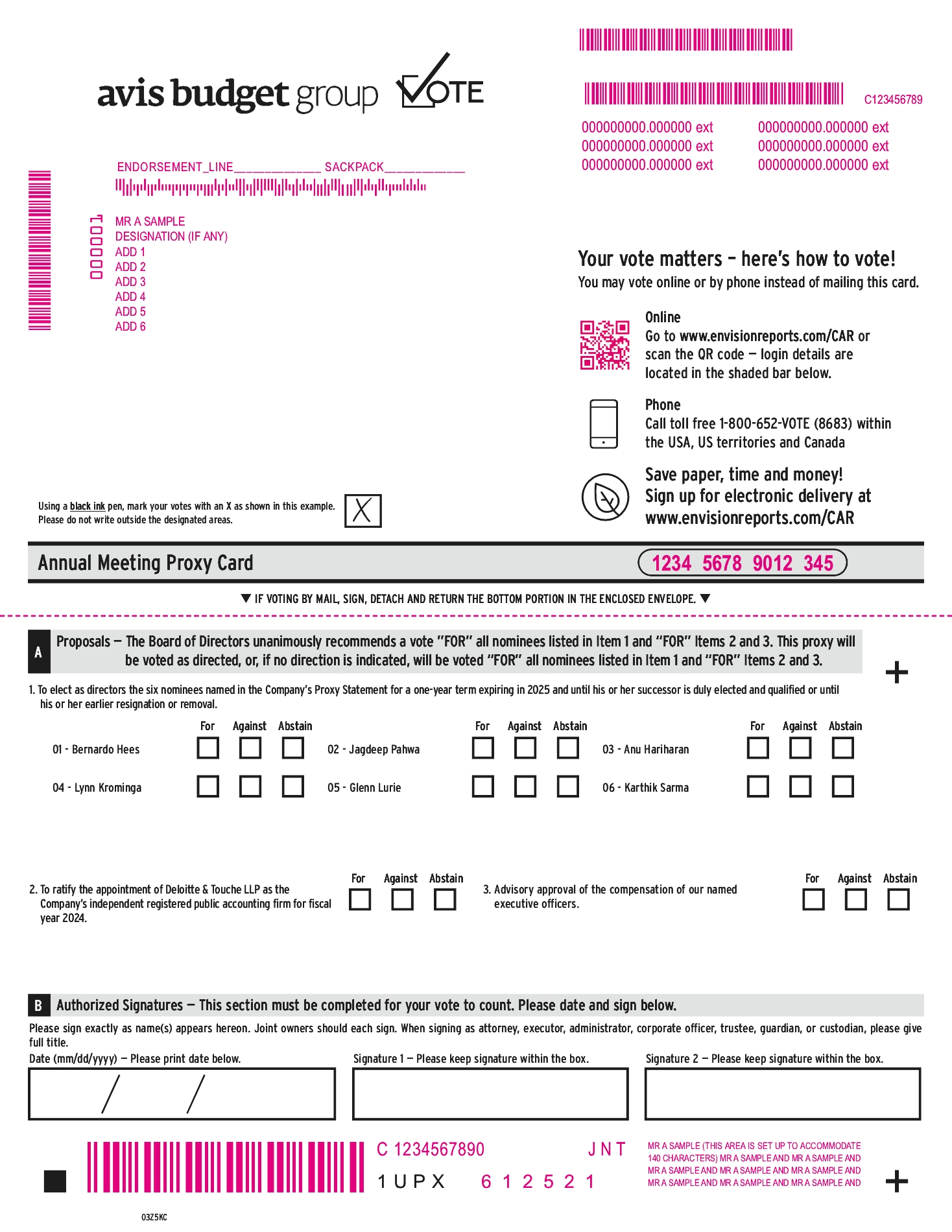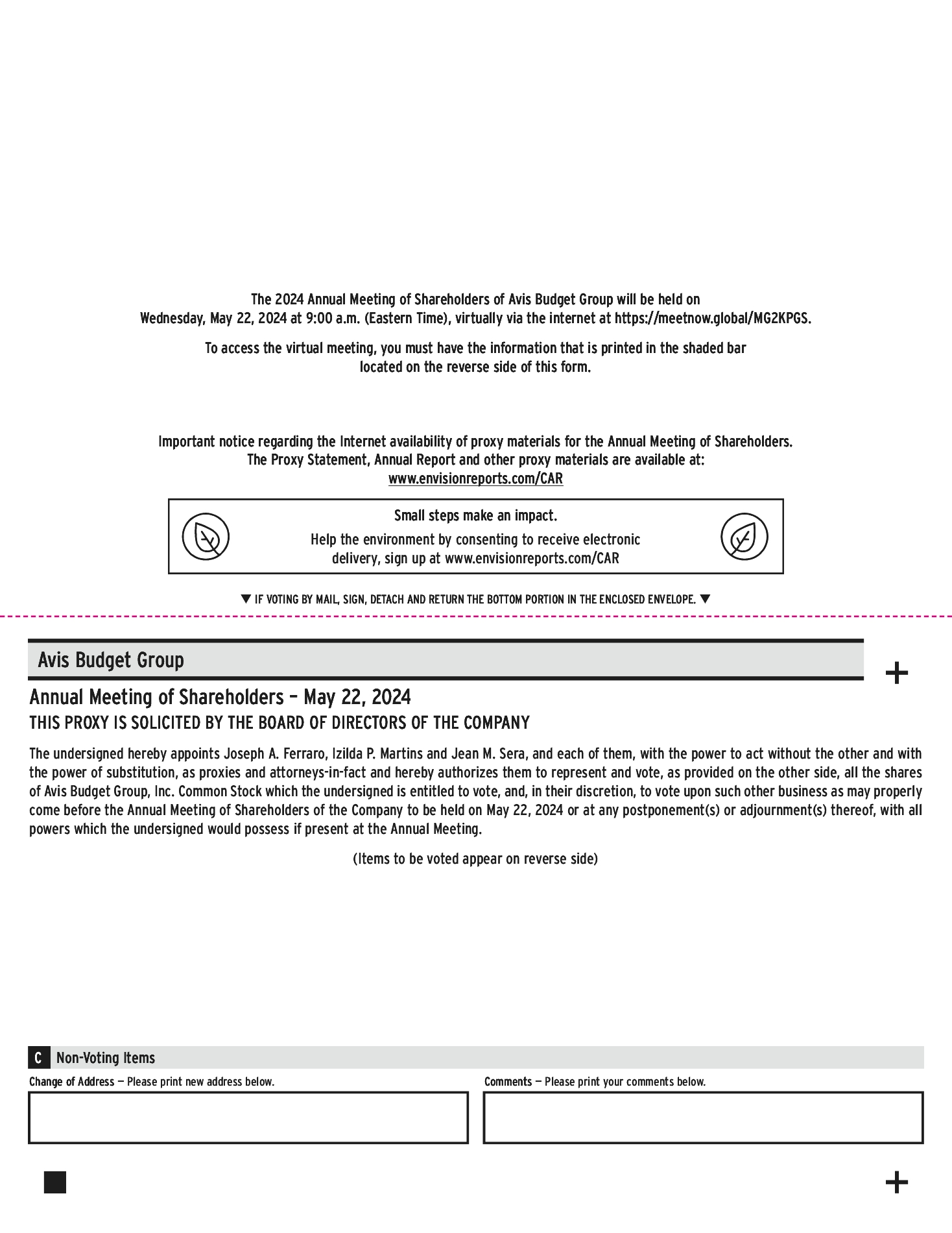 The Board of Directors (the “Board”) of Avis Budget Group, Inc. (the “Company” or “Avis Budget”) is soliciting your vote at the 2024 Annual Meeting of Shareholders, and any adjournment or postponement thereof (the “Meeting”), to be held virtually on May 22, 2024 at 9:00 a.m. Eastern Time, for the purposes set forth in this Proxy Statement.