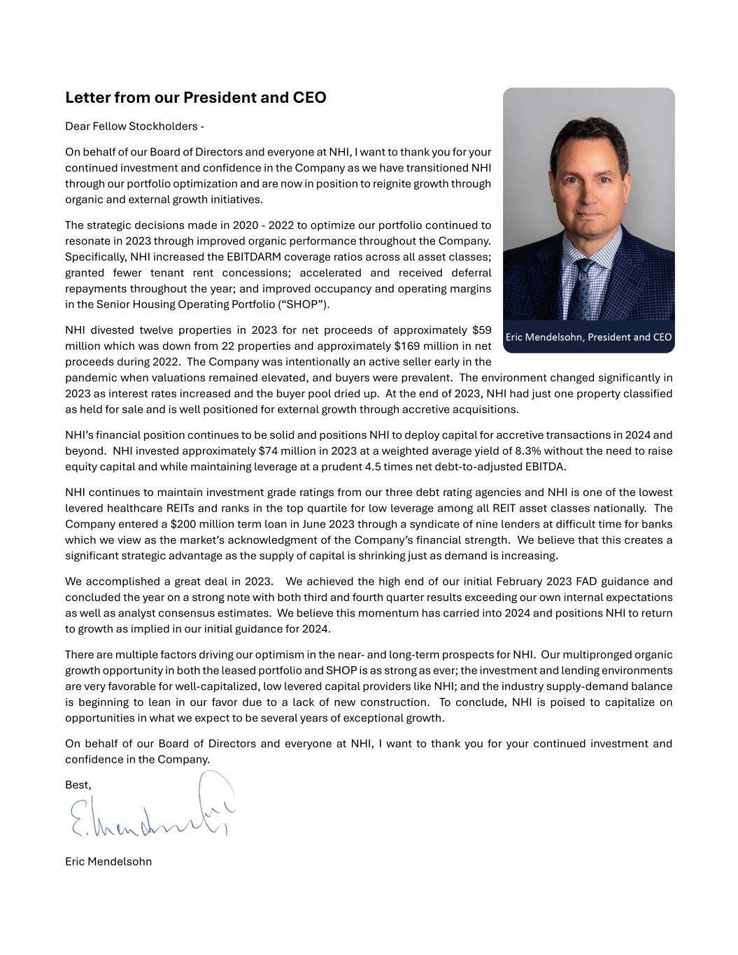 Letter from our President and CEO Dear Fellow Stockholders - On behalf of our Board of Directors and everyone at NHI, I want to thank you for your continued investment and confidence in the Company as we have transitioned NHI through our portfolio optimization and are now in position to reignite growth through organic and external growth initiatives. The strategic decisions made in 2020 - 2022 to optimize our portfolio continued to resonate in 2023 through improved organic performance throughout the Company. Specifically, NHI increased the EBITDARM coverage ratios across all asset classes; granted fewer tenant rent concessions; accelerated and received deferral repayments throughout the year; and improved occupancy and operating margins in the Senior Housing Operating Portfolio (“SHOP”). NHI divested twelve properties in 2023 for net proceeds of approximately $59 million which was down from 22 properties and approximately $169 million in net proceeds during 2022. The Company was intentionally an active seller early in the pandemic when valuations remained elevated, and buyers were prevalent. The environment changed significantly in 2023 as interest rates increased and the buyer pool dried up. At the end of 2023, NHI had just one property classified as held for sale and is well positioned for external growth through accretive acquisitions. NHI’s financial position continues to be solid and positions NHI to deploy capital for accretive transactions in 2024 and beyond. NHI invested approximately $74 million in 2023 at a weighted average yield of 8.3% without the need to raise equity capital and while maintaining leverage at a prudent 4.5 times net debt-to-adjusted EBITDA. NHI continues to maintain investment grade ratings from our three debt rating agencies and NHI is one of the lowest levered healthcare REITs and ranks in the top quartile for low leverage among all REIT asset classes nationally. The Company entered a $200 million term loan in June 2023 through a syndicate of nine lenders at difficult time for banks which we view as the market’s acknowledgment of the Company’s financial strength. We believe that this creates a significant strategic advantage as the supply of capital is shrinking just as demand is increasing. We accomplished a great deal in 2023. We achieved the high end of our initial February 2023 FAD guidance and concluded the year on a strong note with both third and fourth quarter results exceeding our own internal expectations as well as analyst consensus estimates. We believe this momentum has carried into 2024 and positions NHI to return to growth as implied in our initial guidance for 2024. There are multiple factors driving our optimism in the near- and long-term prospects for NHI. Our multipronged organic growth opportunity in both the leased portfolio and SHOP is as strong as ever; the investment and lending environments are very favorable for well-capitalized, low levered capital providers like NHI; and the industry supply-demand balance is beginning to lean in our favor due to a lack of new construction. To conclude, NHI is poised to capitalize on opportunities in what we expect to be several years of exceptional growth. On behalf of our Board of Directors and everyone at NHI, I want to thank you for your continued investment and confidence in the Company. Best, Eric Mendelsohn
