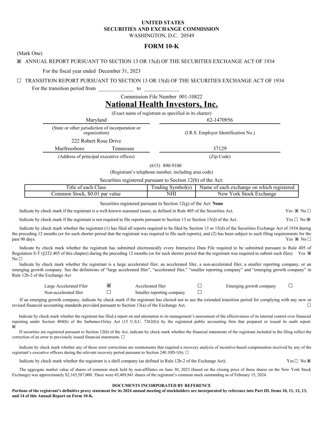 UNITED STATES SECURITIES AND EXCHANGE COMMISSION WASHINGTON, D.C. 20549 FORM 10-K (Mark One) ☒ ANNUAL REPORT PURSUANT TO SECTION 13 OR 15(d) OF THE SECURITIES EXCHANGE ACT OF 1934 For the fiscal year ended December 31, 2023 ☐ TRANSITION REPORT PURSUANT TO SECTION 13 OR 15(d) OF THE SECURITIES EXCHANGE ACT OF 1934 For the transition period from _____________ to _____________ Commission File Number 001-10822 National Health Investors, Inc. (Exact name of registrant as specified in its charter) Maryland 62-1470956 (State or other jurisdiction of incorporation or organization) (I.R.S. Employer Identification No.) 222 Robert Rose Drive Murfreesboro Tennessee 37129 (Address of principal executive offices) (Zip Code) (615) 890-9100 (Registrant’s telephone number, including area code) Securities registered pursuant to Section 12(b) of the Act: Title of each Class Trading Symbol(s) Name of each exchange on which registered Common Stock, $0.01 par value NHI New York Stock Exchange Securities registered pursuant to Section 12(g) of the Act: None Indicate by check mark if the registrant is a well-known seasoned issuer, as defined in Rule 405 of the Securities Act. Yes ☒ No ☐ Indicate by check mark if the registrant is not required to file reports pursuant to Section 13 or Section 15(d) of the Act. Yes ☐ No ☒ Indicate by check mark whether the registrant (1) has filed all reports required to be filed by Section 13 or 15(d) of the Securities Exchange Act of 1934 during the preceding 12 months (or for such shorter period that the registrant was required to file such reports), and (2) has been subject to such filing requirements for the past 90 days. Yes ☒ No ☐ Indicate by check mark whether the registrant has submitted electronically every Interactive Data File required to be submitted pursuant to Rule 405 of Regulation S-T (§232.405 of this chapter) during the preceding 12 months (or for such shorter period that the registrant was required to submit such files) Yes ☒ No ☐ Indicate by check mark whether the registrant is a large accelerated filer, an accelerated filer, a non-accelerated filer, a smaller reporting company, or an emerging growth company. See the definitions of “large accelerated filer”, “accelerated filer,” “smaller reporting company” and “emerging growth company” in Rule 12b-2 of the Exchange Act Large Accelerated Filer ☒ Accelerated filer ☐ Emerging growth company ☐ Non-accelerated filer ☐ Smaller reporting company ☐ If an emerging growth company, indicate by check mark if the registrant has elected not to use the extended transition period for complying with any new or revised financial accounting standards provided pursuant to Section 13(a) of the Exchange Act. ☐ Indicate by check mark whether the registrant has filed a report on and attestation to its management’s assessment of the effectiveness of its internal control over financial reporting under Section 404(b) of the Sarbanes-Oxley Act (15 U.S.C. 7262(b)) by the registered public accounting firm that prepared or issued its audit report. ☒ If securities are registered pursuant to Section 12(b) of the Act, indicate by check mark whether the financial statements of the registrant included in the filing reflect the correction of an error to previously issued financial statements. ☐ Indicate by check mark whether any of those error corrections are restatements that required a recovery analysis of incentive-based compensation received by any of the registrant’s executive officers during the relevant recovery period pursuant to Section 240.10D-1(b). ☐ Indicate by check mark whether the registrant is a shell company (as defined in Rule 12b-2 of the Exchange Act). Yes ☐ No ☒ The aggregate market value of shares of common stock held by non-affiliates on June 30, 2023 (based on the closing price of these shares on the New York Stock Exchange) was approximately $2,165,587,000. There were 43,409,841 shares of the registrant’s common stock outstanding as of February 15, 2024. DOCUMENTS INCORPORATED BY REFERENCE Portions of the registrant’s definitive proxy statement for its 2024 annual meeting of stockholders are incorporated by reference into Part III, Items 10, 11, 12, 13, and 14 of this Annual Report on Form 10-K.