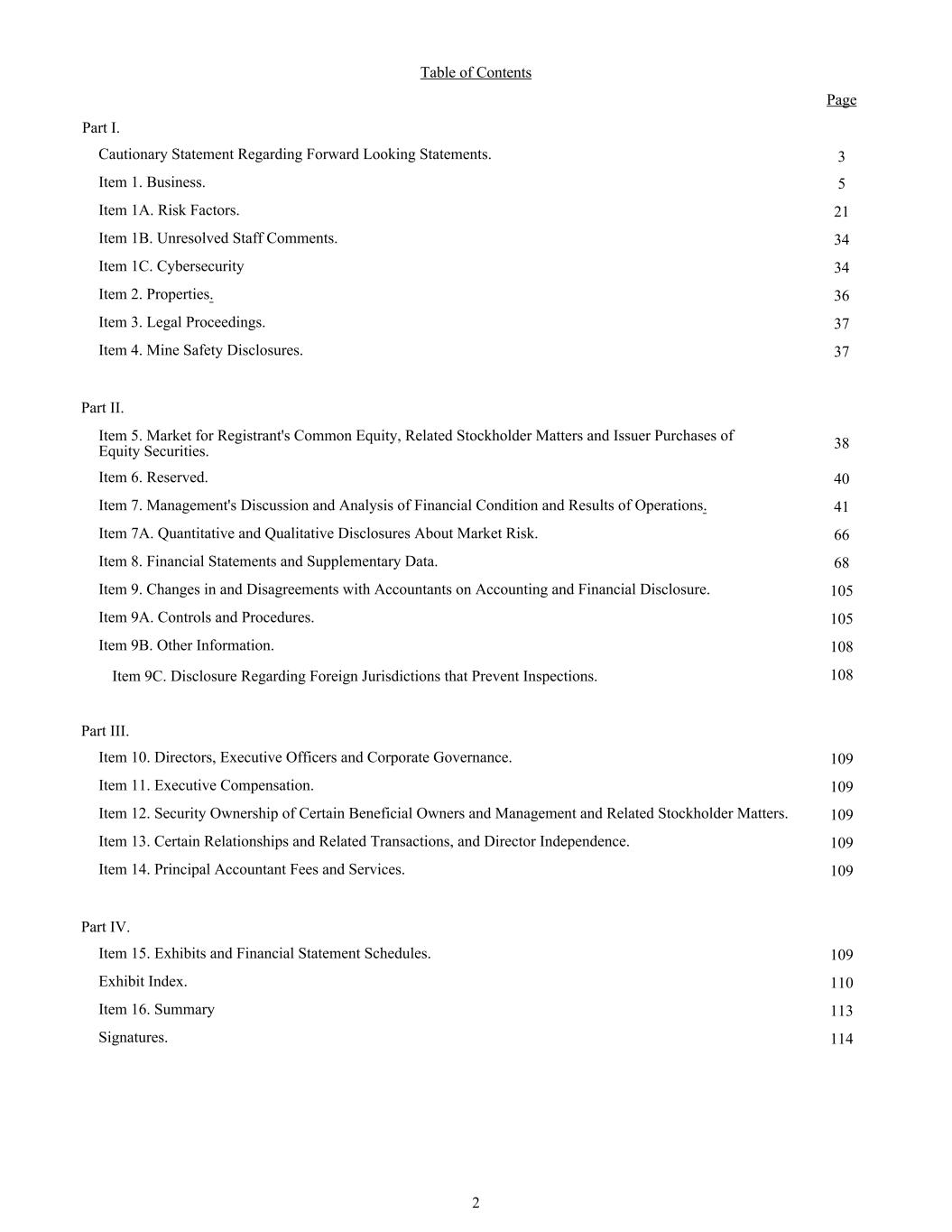 Table of Contents Page Part I. 3 5 21 34 34 36 37 Cautionary Statement Regarding Forward Looking Statements. Item 1. Business. Item 1A. Risk Factors. Item 1B. Unresolved Staff Comments. Item 1C. Cybersecurity Item 2. Properties. Item 3. Legal Proceedings. Item 4. Mine Safety Disclosures. 37 Part II. 38 40 41 66 68 105 105 108 Item 5. Market for Registrant's Common Equity, Related Stockholder Matters and Issuer Purchases of Equity Securities. Item 6. Reserved. Item 7. Management's Discussion and Analysis of Financial Condition and Results of Operations. Item 7A. Quantitative and Qualitative Disclosures About Market Risk. Item 8. Financial Statements and Supplementary Data. Item 9. Changes in and Disagreements with Accountants on Accounting and Financial Disclosure. Item 9A. Controls and Procedures. Item 9B. Other Information. Item 9C. Disclosure Regarding Foreign Jurisdictions that Prevent Inspections. 108 Part III. 109 109 109 109 Item 10. Directors, Executive Officers and Corporate Governance. Item 11. Executive Compensation. Item 12. Security Ownership of Certain Beneficial Owners and Management and Related Stockholder Matters. Item 13. Certain Relationships and Related Transactions, and Director Independence. Item 14. Principal Accountant Fees and Services. 109 Part IV. 109 110 113 Item 15. Exhibits and Financial Statement Schedules. Exhibit Index. Item 16. Summary Signatures. 114 2
