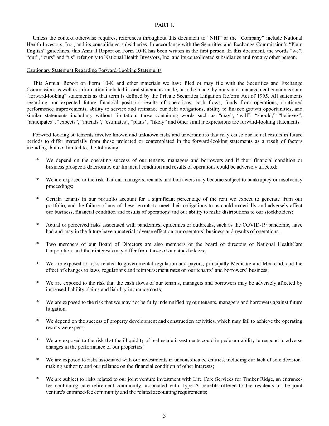 PART I. Unless the context otherwise requires, references throughout this document to “NHI” or the “Company” include National Health Investors, Inc., and its consolidated subsidiaries. In accordance with the Securities and Exchange Commission’s “Plain English” guidelines, this Annual Report on Form 10-K has been written in the first person. In this document, the words “we”, “our”, “ours” and “us” refer only to National Health Investors, Inc. and its consolidated subsidiaries and not any other person. Cautionary Statement Regarding Forward-Looking Statements This Annual Report on Form 10-K and other materials we have filed or may file with the Securities and Exchange Commission, as well as information included in oral statements made, or to be made, by our senior management contain certain “forward-looking” statements as that term is defined by the Private Securities Litigation Reform Act of 1995. All statements regarding our expected future financial position, results of operations, cash flows, funds from operations, continued performance improvements, ability to service and refinance our debt obligations, ability to finance growth opportunities, and similar statements including, without limitation, those containing words such as “may”, “will”, “should,” “believes”, “anticipates”, “expects”, “intends”, “estimates”, “plans”, “likely” and other similar expressions are forward-looking statements. Forward-looking statements involve known and unknown risks and uncertainties that may cause our actual results in future periods to differ materially from those projected or contemplated in the forward-looking statements as a result of factors including, but not limited to, the following: * We depend on the operating success of our tenants, managers and borrowers and if their financial condition or business prospects deteriorate, our financial condition and results of operations could be adversely affected; * We are exposed to the risk that our managers, tenants and borrowers may become subject to bankruptcy or insolvency proceedings; * Certain tenants in our portfolio account for a significant percentage of the rent we expect to generate from our portfolio, and the failure of any of these tenants to meet their obligations to us could materially and adversely affect our business, financial condition and results of operations and our ability to make distributions to our stockholders; * Actual or perceived risks associated with pandemics, epidemics or outbreaks, such as the COVID-19 pandemic, have had and may in the future have a material adverse effect on our operators’ business and results of operations; * Two members of our Board of Directors are also members of the board of directors of National HealthCare Corporation, and their interests may differ from those of our stockholders; * We are exposed to risks related to governmental regulation and payors, principally Medicare and Medicaid, and the effect of changes to laws, regulations and reimbursement rates on our tenants’ and borrowers’ business; * We are exposed to the risk that the cash flows of our tenants, managers and borrowers may be adversely affected by increased liability claims and liability insurance costs; * We are exposed to the risk that we may not be fully indemnified by our tenants, managers and borrowers against future litigation; * We depend on the success of property development and construction activities, which may fail to achieve the operating results we expect; * We are exposed to the risk that the illiquidity of real estate investments could impede our ability to respond to adverse changes in the performance of our properties; * We are exposed to risks associated with our investments in unconsolidated entities, including our lack of sole decision- making authority and our reliance on the financial condition of other interests; * We are subject to risks related to our joint venture investment with Life Care Services for Timber Ridge, an entrance- fee continuing care retirement community, associated with Type A benefits offered to the residents of the joint venture's entrance-fee community and the related accounting requirements; 3