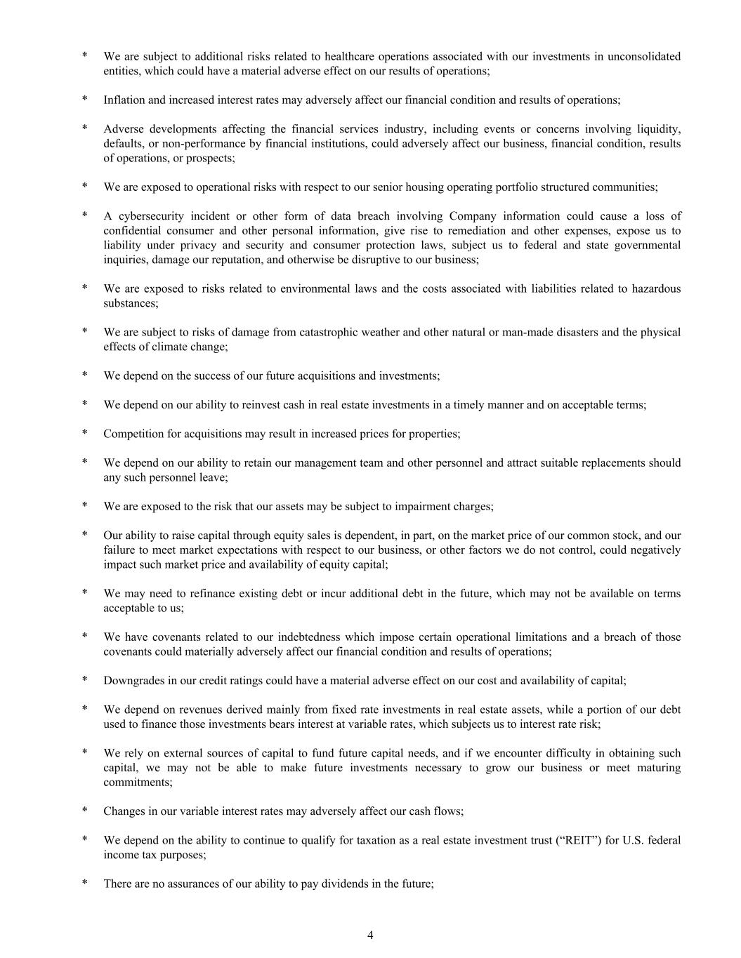 * We are subject to additional risks related to healthcare operations associated with our investments in unconsolidated entities, which could have a material adverse effect on our results of operations; * Inflation and increased interest rates may adversely affect our financial condition and results of operations; * Adverse developments affecting the financial services industry, including events or concerns involving liquidity, defaults, or non-performance by financial institutions, could adversely affect our business, financial condition, results of operations, or prospects; * We are exposed to operational risks with respect to our senior housing operating portfolio structured communities; * A cybersecurity incident or other form of data breach involving Company information could cause a loss of confidential consumer and other personal information, give rise to remediation and other expenses, expose us to liability under privacy and security and consumer protection laws, subject us to federal and state governmental inquiries, damage our reputation, and otherwise be disruptive to our business; * We are exposed to risks related to environmental laws and the costs associated with liabilities related to hazardous substances; * We are subject to risks of damage from catastrophic weather and other natural or man-made disasters and the physical effects of climate change; * We depend on the success of our future acquisitions and investments; * We depend on our ability to reinvest cash in real estate investments in a timely manner and on acceptable terms; * Competition for acquisitions may result in increased prices for properties; * We depend on our ability to retain our management team and other personnel and attract suitable replacements should any such personnel leave; * We are exposed to the risk that our assets may be subject to impairment charges; * Our ability to raise capital through equity sales is dependent, in part, on the market price of our common stock, and our failure to meet market expectations with respect to our business, or other factors we do not control, could negatively impact such market price and availability of equity capital; * We may need to refinance existing debt or incur additional debt in the future, which may not be available on terms acceptable to us; * We have covenants related to our indebtedness which impose certain operational limitations and a breach of those covenants could materially adversely affect our financial condition and results of operations; * Downgrades in our credit ratings could have a material adverse effect on our cost and availability of capital; * We depend on revenues derived mainly from fixed rate investments in real estate assets, while a portion of our debt used to finance those investments bears interest at variable rates, which subjects us to interest rate risk; * We rely on external sources of capital to fund future capital needs, and if we encounter difficulty in obtaining such capital, we may not be able to make future investments necessary to grow our business or meet maturing commitments; * Changes in our variable interest rates may adversely affect our cash flows; * We depend on the ability to continue to qualify for taxation as a real estate investment trust (“REIT”) for U.S. federal income tax purposes; * There are no assurances of our ability to pay dividends in the future; 4
