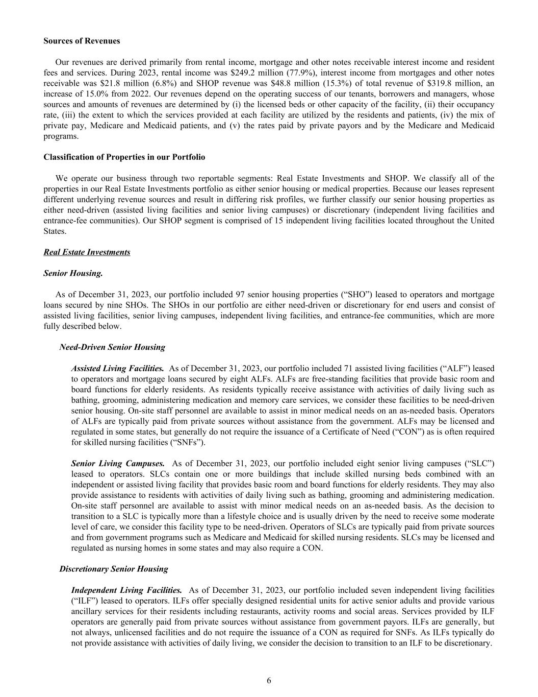 Sources of Revenues Our revenues are derived primarily from rental income, mortgage and other notes receivable interest income and resident fees and services. During 2023, rental income was $249.2 million (77.9%), interest income from mortgages and other notes receivable was $21.8 million (6.8%) and SHOP revenue was $48.8 million (15.3%) of total revenue of $319.8 million, an increase of 15.0% from 2022. Our revenues depend on the operating success of our tenants, borrowers and managers, whose sources and amounts of revenues are determined by (i) the licensed beds or other capacity of the facility, (ii) their occupancy rate, (iii) the extent to which the services provided at each facility are utilized by the residents and patients, (iv) the mix of private pay, Medicare and Medicaid patients, and (v) the rates paid by private payors and by the Medicare and Medicaid programs. Classification of Properties in our Portfolio We operate our business through two reportable segments: Real Estate Investments and SHOP. We classify all of the properties in our Real Estate Investments portfolio as either senior housing or medical properties. Because our leases represent different underlying revenue sources and result in differing risk profiles, we further classify our senior housing properties as either need-driven (assisted living facilities and senior living campuses) or discretionary (independent living facilities and entrance-fee communities). Our SHOP segment is comprised of 15 independent living facilities located throughout the United States. Real Estate Investments Senior Housing. As of December 31, 2023, our portfolio included 97 senior housing properties (“SHO”) leased to operators and mortgage loans secured by nine SHOs. The SHOs in our portfolio are either need-driven or discretionary for end users and consist of assisted living facilities, senior living campuses, independent living facilities, and entrance-fee communities, which are more fully described below. Need-Driven Senior Housing Assisted Living Facilities. As of December 31, 2023, our portfolio included 71 assisted living facilities (“ALF”) leased to operators and mortgage loans secured by eight ALFs. ALFs are free-standing facilities that provide basic room and board functions for elderly residents. As residents typically receive assistance with activities of daily living such as bathing, grooming, administering medication and memory care services, we consider these facilities to be need-driven senior housing. On-site staff personnel are available to assist in minor medical needs on an as-needed basis. Operators of ALFs are typically paid from private sources without assistance from the government. ALFs may be licensed and regulated in some states, but generally do not require the issuance of a Certificate of Need (“CON”) as is often required for skilled nursing facilities (“SNFs”). Senior Living Campuses. As of December 31, 2023, our portfolio included eight senior living campuses (“SLC”) leased to operators. SLCs contain one or more buildings that include skilled nursing beds combined with an independent or assisted living facility that provides basic room and board functions for elderly residents. They may also provide assistance to residents with activities of daily living such as bathing, grooming and administering medication. On-site staff personnel are available to assist with minor medical needs on an as-needed basis. As the decision to transition to a SLC is typically more than a lifestyle choice and is usually driven by the need to receive some moderate level of care, we consider this facility type to be need-driven. Operators of SLCs are typically paid from private sources and from government programs such as Medicare and Medicaid for skilled nursing residents. SLCs may be licensed and regulated as nursing homes in some states and may also require a CON. Discretionary Senior Housing Independent Living Facilities. As of December 31, 2023, our portfolio included seven independent living facilities (“ILF”) leased to operators. ILFs offer specially designed residential units for active senior adults and provide various ancillary services for their residents including restaurants, activity rooms and social areas. Services provided by ILF operators are generally paid from private sources without assistance from government payors. ILFs are generally, but not always, unlicensed facilities and do not require the issuance of a CON as required for SNFs. As ILFs typically do not provide assistance with activities of daily living, we consider the decision to transition to an ILF to be discretionary. 6