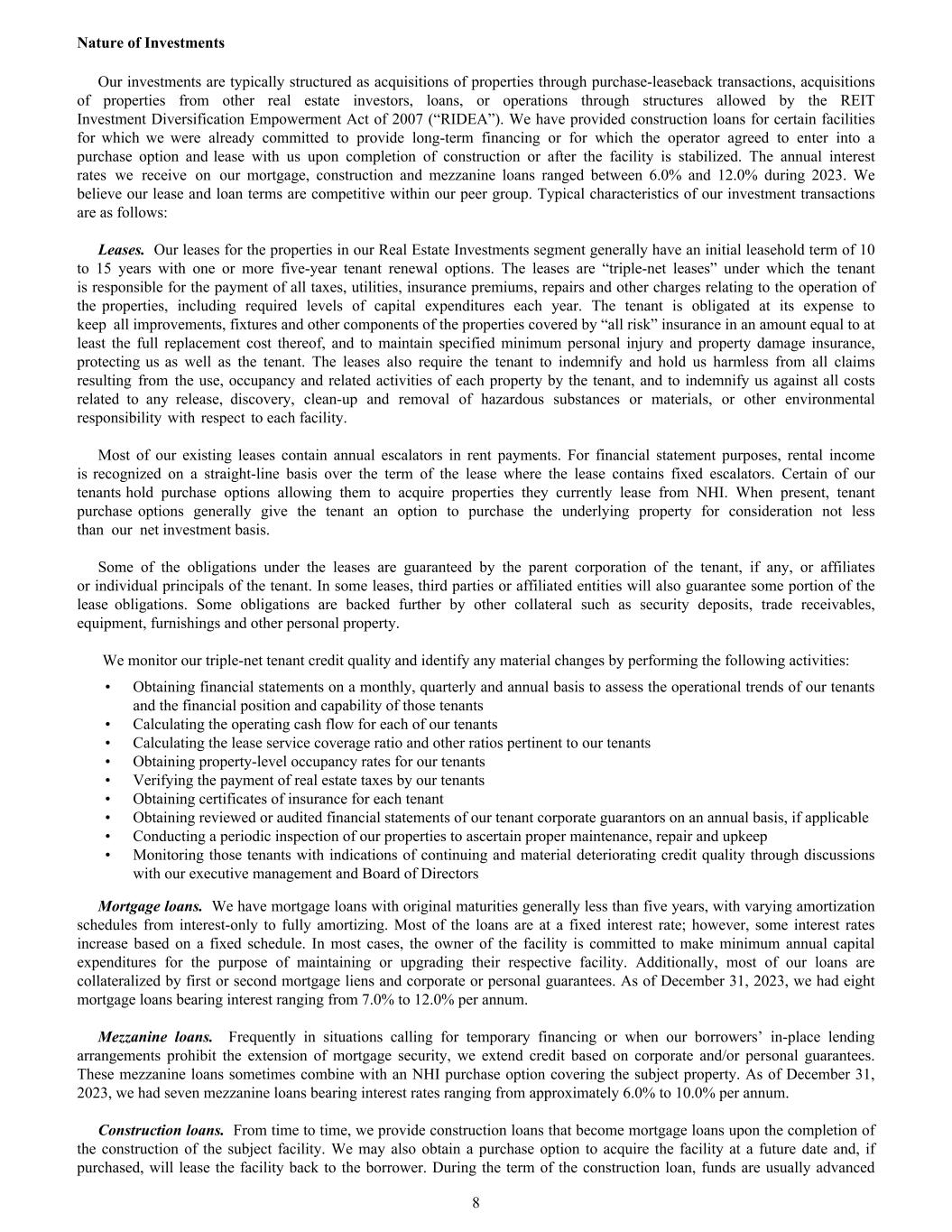Nature of Investments Our investments are typically structured as acquisitions of properties through purchase-leaseback transactions, acquisitions of properties from other real estate investors, loans, or operations through structures allowed by the REIT Investment Diversification Empowerment Act of 2007 (“RIDEA”). We have provided construction loans for certain facilities for which we were already committed to provide long-term financing or for which the operator agreed to enter into a purchase option and lease with us upon completion of construction or after the facility is stabilized. The annual interest rates we receive on our mortgage, construction and mezzanine loans ranged between 6.0% and 12.0% during 2023. We believe our lease and loan terms are competitive within our peer group. Typical characteristics of our investment transactions are as follows: Leases. Our leases for the properties in our Real Estate Investments segment generally have an initial leasehold term of 10 to 15 years with one or more five-year tenant renewal options. The leases are “triple-net leases” under which the tenant is responsible for the payment of all taxes, utilities, insurance premiums, repairs and other charges relating to the operation of the properties, including required levels of capital expenditures each year. The tenant is obligated at its expense to keep all improvements, fixtures and other components of the properties covered by “all risk” insurance in an amount equal to at least the full replacement cost thereof, and to maintain specified minimum personal injury and property damage insurance, protecting us as well as the tenant. The leases also require the tenant to indemnify and hold us harmless from all claims resulting from the use, occupancy and related activities of each property by the tenant, and to indemnify us against all costs related to any release, discovery, clean-up and removal of hazardous substances or materials, or other environmental responsibility with respect to each facility. Most of our existing leases contain annual escalators in rent payments. For financial statement purposes, rental income is recognized on a straight-line basis over the term of the lease where the lease contains fixed escalators. Certain of our tenants hold purchase options allowing them to acquire properties they currently lease from NHI. When present, tenant purchase options generally give the tenant an option to purchase the underlying property for consideration not less than our net investment basis. Some of the obligations under the leases are guaranteed by the parent corporation of the tenant, if any, or affiliates or individual principals of the tenant. In some leases, third parties or affiliated entities will also guarantee some portion of the lease obligations. Some obligations are backed further by other collateral such as security deposits, trade receivables, equipment, furnishings and other personal property. We monitor our triple-net tenant credit quality and identify any material changes by performing the following activities: • Obtaining financial statements on a monthly, quarterly and annual basis to assess the operational trends of our tenants and the financial position and capability of those tenants • Calculating the operating cash flow for each of our tenants • Calculating the lease service coverage ratio and other ratios pertinent to our tenants • Obtaining property-level occupancy rates for our tenants • Verifying the payment of real estate taxes by our tenants • Obtaining certificates of insurance for each tenant • Obtaining reviewed or audited financial statements of our tenant corporate guarantors on an annual basis, if applicable • Conducting a periodic inspection of our properties to ascertain proper maintenance, repair and upkeep • Monitoring those tenants with indications of continuing and material deteriorating credit quality through discussions with our executive management and Board of Directors Mortgage loans. We have mortgage loans with original maturities generally less than five years, with varying amortization schedules from interest-only to fully amortizing. Most of the loans are at a fixed interest rate; however, some interest rates increase based on a fixed schedule. In most cases, the owner of the facility is committed to make minimum annual capital expenditures for the purpose of maintaining or upgrading their respective facility. Additionally, most of our loans are collateralized by first or second mortgage liens and corporate or personal guarantees. As of December 31, 2023, we had eight mortgage loans bearing interest ranging from 7.0% to 12.0% per annum. Mezzanine loans. Frequently in situations calling for temporary financing or when our borrowers’ in-place lending arrangements prohibit the extension of mortgage security, we extend credit based on corporate and/or personal guarantees. These mezzanine loans sometimes combine with an NHI purchase option covering the subject property. As of December 31, 2023, we had seven mezzanine loans bearing interest rates ranging from approximately 6.0% to 10.0% per annum. Construction loans. From time to time, we provide construction loans that become mortgage loans upon the completion of the construction of the subject facility. We may also obtain a purchase option to acquire the facility at a future date and, if purchased, will lease the facility back to the borrower. During the term of the construction loan, funds are usually advanced 8