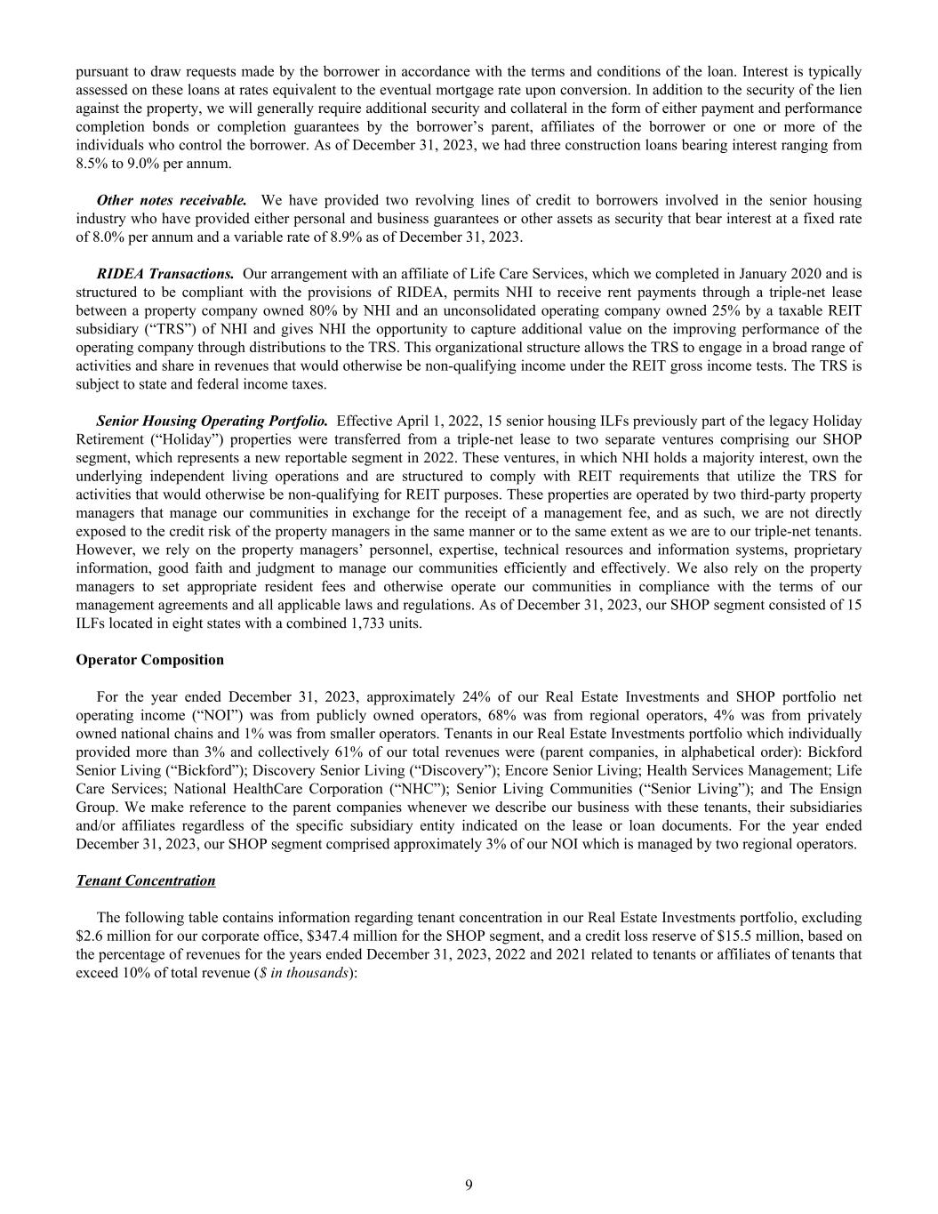 pursuant to draw requests made by the borrower in accordance with the terms and conditions of the loan. Interest is typically assessed on these loans at rates equivalent to the eventual mortgage rate upon conversion. In addition to the security of the lien against the property, we will generally require additional security and collateral in the form of either payment and performance completion bonds or completion guarantees by the borrower’s parent, affiliates of the borrower or one or more of the individuals who control the borrower. As of December 31, 2023, we had three construction loans bearing interest ranging from 8.5% to 9.0% per annum. Other notes receivable. We have provided two revolving lines of credit to borrowers involved in the senior housing industry who have provided either personal and business guarantees or other assets as security that bear interest at a fixed rate of 8.0% per annum and a variable rate of 8.9% as of December 31, 2023. RIDEA Transactions. Our arrangement with an affiliate of Life Care Services, which we completed in January 2020 and is structured to be compliant with the provisions of RIDEA, permits NHI to receive rent payments through a triple-net lease between a property company owned 80% by NHI and an unconsolidated operating company owned 25% by a taxable REIT subsidiary (“TRS”) of NHI and gives NHI the opportunity to capture additional value on the improving performance of the operating company through distributions to the TRS. This organizational structure allows the TRS to engage in a broad range of activities and share in revenues that would otherwise be non-qualifying income under the REIT gross income tests. The TRS is subject to state and federal income taxes. Senior Housing Operating Portfolio. Effective April 1, 2022, 15 senior housing ILFs previously part of the legacy Holiday Retirement (“Holiday”) properties were transferred from a triple-net lease to two separate ventures comprising our SHOP segment, which represents a new reportable segment in 2022. These ventures, in which NHI holds a majority interest, own the underlying independent living operations and are structured to comply with REIT requirements that utilize the TRS for activities that would otherwise be non-qualifying for REIT purposes. These properties are operated by two third-party property managers that manage our communities in exchange for the receipt of a management fee, and as such, we are not directly exposed to the credit risk of the property managers in the same manner or to the same extent as we are to our triple-net tenants. However, we rely on the property managers’ personnel, expertise, technical resources and information systems, proprietary information, good faith and judgment to manage our communities efficiently and effectively. We also rely on the property managers to set appropriate resident fees and otherwise operate our communities in compliance with the terms of our management agreements and all applicable laws and regulations. As of December 31, 2023, our SHOP segment consisted of 15 ILFs located in eight states with a combined 1,733 units. Operator Composition For the year ended December 31, 2023, approximately 24% of our Real Estate Investments and SHOP portfolio net operating income (“NOI”) was from publicly owned operators, 68% was from regional operators, 4% was from privately owned national chains and 1% was from smaller operators. Tenants in our Real Estate Investments portfolio which individually provided more than 3% and collectively 61% of our total revenues were (parent companies, in alphabetical order): Bickford Senior Living (“Bickford”); Discovery Senior Living (“Discovery”); Encore Senior Living; Health Services Management; Life Care Services; National HealthCare Corporation (“NHC”); Senior Living Communities (“Senior Living”); and The Ensign Group. We make reference to the parent companies whenever we describe our business with these tenants, their subsidiaries and/or affiliates regardless of the specific subsidiary entity indicated on the lease or loan documents. For the year ended December 31, 2023, our SHOP segment comprised approximately 3% of our NOI which is managed by two regional operators. Tenant Concentration The following table contains information regarding tenant concentration in our Real Estate Investments portfolio, excluding $2.6 million for our corporate office, $347.4 million for the SHOP segment, and a credit loss reserve of $15.5 million, based on the percentage of revenues for the years ended December 31, 2023, 2022 and 2021 related to tenants or affiliates of tenants that exceed 10% of total revenue ($ in thousands): 9