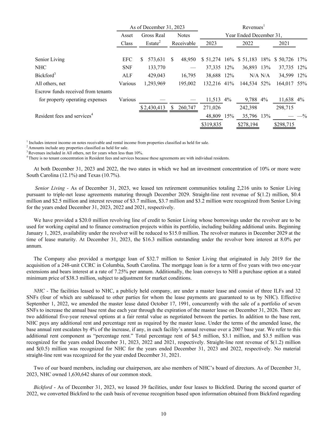 As of December 31, 2023 Revenues1 Asset Gross Real Notes Year Ended December 31, Class Estate2 Receivable 2023 2022 2021 Senior Living EFC $ 573,631 $ 48,950 $ 51,274 16% $ 51,183 18% $ 50,726 17% NHC SNF 133,770 — 37,335 12% 36,893 13% 37,735 12% Bickford3 ALF 429,043 16,795 38,688 12% N/A N/A 34,599 12% All others, net Various 1,293,969 195,002 132,216 41% 144,534 52% 164,017 55% Escrow funds received from tenants for property operating expenses Various — — 11,513 4% 9,788 4% 11,638 4% $ 2,430,413 $ 260,747 271,026 242,398 298,715 Resident fees and services4 48,809 15% 35,796 13% — —% $ 319,835 $ 278,194 $ 298,715 1 Includes interest income on notes receivable and rental income from properties classified as held for sale. 2 Amounts include any properties classified as held for sale. 3 Revenues included in All others, net for years when less than 10%. 4 There is no tenant concentration in Resident fees and services because these agreements are with individual residents. At both December 31, 2023 and 2022, the two states in which we had an investment concentration of 10% or more were South Carolina (12.1%) and Texas (10.7%). Senior Living - As of December 31, 2023, we leased ten retirement communities totaling 2,216 units to Senior Living pursuant to triple-net lease agreements maturing through December 2029. Straight-line rent revenue of $(1.2) million, $0.4 million and $2.5 million and interest revenue of $3.7 million, $3.7 million and $3.2 million were recognized from Senior Living for the years ended December 31, 2023, 2022 and 2021, respectively. We have provided a $20.0 million revolving line of credit to Senior Living whose borrowings under the revolver are to be used for working capital and to finance construction projects within its portfolio, including building additional units. Beginning January 1, 2025, availability under the revolver will be reduced to $15.0 million. The revolver matures in December 2029 at the time of lease maturity. At December 31, 2023, the $16.3 million outstanding under the revolver bore interest at 8.0% per annum. The Company also provided a mortgage loan of $32.7 million to Senior Living that originated in July 2019 for the acquisition of a 248-unit CCRC in Columbia, South Carolina. The mortgage loan is for a term of five years with two one-year extensions and bears interest at a rate of 7.25% per annum. Additionally, the loan conveys to NHI a purchase option at a stated minimum price of $38.3 million, subject to adjustment for market conditions. NHC - The facilities leased to NHC, a publicly held company, are under a master lease and consist of three ILFs and 32 SNFs (four of which are subleased to other parties for whom the lease payments are guaranteed to us by NHC). Effective September 1, 2022, we amended the master lease dated October 17, 1991, concurrently with the sale of a portfolio of seven SNFs to increase the annual base rent due each year through the expiration of the master lease on December 31, 2026. There are two additional five-year renewal options at a fair rental value as negotiated between the parties. In addition to the base rent, NHC pays any additional rent and percentage rent as required by the master lease. Under the terms of the amended lease, the base annual rent escalates by 4% of the increase, if any, in each facility’s annual revenue over a 2007 base year. We refer to this additional rent component as “percentage rent.” Total percentage rent of $4.5 million, $3.1 million, and $3.5 million was recognized for the years ended December 31, 2023, 2022 and 2021, respectively. Straight-line rent revenue of $(1.2) million and $(0.5) million was recognized for NHC for the years ended December 31, 2023 and 2022, respectively. No material straight-line rent was recognized for the year ended December 31, 2021. Two of our board members, including our chairperson, are also members of NHC’s board of directors. As of December 31, 2023, NHC owned 1,630,642 shares of our common stock. Bickford - As of December 31, 2023, we leased 39 facilities, under four leases to Bickford. During the second quarter of 2022, we converted Bickford to the cash basis of revenue recognition based upon information obtained from Bickford regarding 10