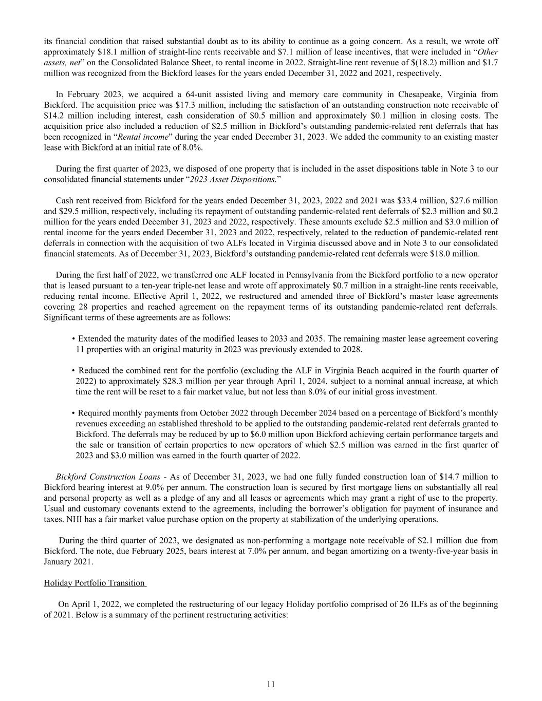 its financial condition that raised substantial doubt as to its ability to continue as a going concern. As a result, we wrote off approximately $18.1 million of straight-line rents receivable and $7.1 million of lease incentives, that were included in “Other assets, net” on the Consolidated Balance Sheet, to rental income in 2022. Straight-line rent revenue of $(18.2) million and $1.7 million was recognized from the Bickford leases for the years ended December 31, 2022 and 2021, respectively. In February 2023, we acquired a 64-unit assisted living and memory care community in Chesapeake, Virginia from Bickford. The acquisition price was $17.3 million, including the satisfaction of an outstanding construction note receivable of $14.2 million including interest, cash consideration of $0.5 million and approximately $0.1 million in closing costs. The acquisition price also included a reduction of $2.5 million in Bickford’s outstanding pandemic-related rent deferrals that has been recognized in “Rental income” during the year ended December 31, 2023. We added the community to an existing master lease with Bickford at an initial rate of 8.0%. During the first quarter of 2023, we disposed of one property that is included in the asset dispositions table in Note 3 to our consolidated financial statements under “2023 Asset Dispositions.” Cash rent received from Bickford for the years ended December 31, 2023, 2022 and 2021 was $33.4 million, $27.6 million and $29.5 million, respectively, including its repayment of outstanding pandemic-related rent deferrals of $2.3 million and $0.2 million for the years ended December 31, 2023 and 2022, respectively. These amounts exclude $2.5 million and $3.0 million of rental income for the years ended December 31, 2023 and 2022, respectively, related to the reduction of pandemic-related rent deferrals in connection with the acquisition of two ALFs located in Virginia discussed above and in Note 3 to our consolidated financial statements. As of December 31, 2023, Bickford’s outstanding pandemic-related rent deferrals were $18.0 million. During the first half of 2022, we transferred one ALF located in Pennsylvania from the Bickford portfolio to a new operator that is leased pursuant to a ten-year triple-net lease and wrote off approximately $0.7 million in a straight-line rents receivable, reducing rental income. Effective April 1, 2022, we restructured and amended three of Bickford’s master lease agreements covering 28 properties and reached agreement on the repayment terms of its outstanding pandemic-related rent deferrals. Significant terms of these agreements are as follows: • Extended the maturity dates of the modified leases to 2033 and 2035. The remaining master lease agreement covering 11 properties with an original maturity in 2023 was previously extended to 2028. • Reduced the combined rent for the portfolio (excluding the ALF in Virginia Beach acquired in the fourth quarter of 2022) to approximately $28.3 million per year through April 1, 2024, subject to a nominal annual increase, at which time the rent will be reset to a fair market value, but not less than 8.0% of our initial gross investment. • Required monthly payments from October 2022 through December 2024 based on a percentage of Bickford’s monthly revenues exceeding an established threshold to be applied to the outstanding pandemic-related rent deferrals granted to Bickford. The deferrals may be reduced by up to $6.0 million upon Bickford achieving certain performance targets and the sale or transition of certain properties to new operators of which $2.5 million was earned in the first quarter of 2023 and $3.0 million was earned in the fourth quarter of 2022. Bickford Construction Loans - As of December 31, 2023, we had one fully funded construction loan of $14.7 million to Bickford bearing interest at 9.0% per annum. The construction loan is secured by first mortgage liens on substantially all real and personal property as well as a pledge of any and all leases or agreements which may grant a right of use to the property. Usual and customary covenants extend to the agreements, including the borrower’s obligation for payment of insurance and taxes. NHI has a fair market value purchase option on the property at stabilization of the underlying operations. During the third quarter of 2023, we designated as non-performing a mortgage note receivable of $2.1 million due from Bickford. The note, due February 2025, bears interest at 7.0% per annum, and began amortizing on a twenty-five-year basis in January 2021. Holiday Portfolio Transition On April 1, 2022, we completed the restructuring of our legacy Holiday portfolio comprised of 26 ILFs as of the beginning of 2021. Below is a summary of the pertinent restructuring activities: 11