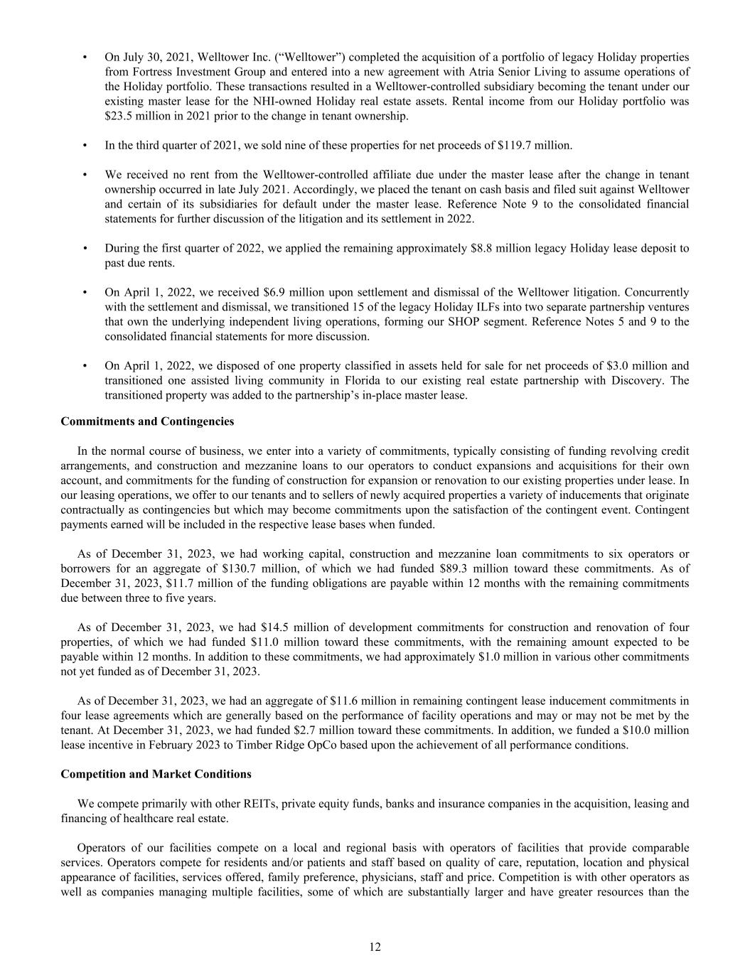 • On July 30, 2021, Welltower Inc. (“Welltower”) completed the acquisition of a portfolio of legacy Holiday properties from Fortress Investment Group and entered into a new agreement with Atria Senior Living to assume operations of the Holiday portfolio. These transactions resulted in a Welltower-controlled subsidiary becoming the tenant under our existing master lease for the NHI-owned Holiday real estate assets. Rental income from our Holiday portfolio was $23.5 million in 2021 prior to the change in tenant ownership. • In the third quarter of 2021, we sold nine of these properties for net proceeds of $119.7 million. • We received no rent from the Welltower-controlled affiliate due under the master lease after the change in tenant ownership occurred in late July 2021. Accordingly, we placed the tenant on cash basis and filed suit against Welltower and certain of its subsidiaries for default under the master lease. Reference Note 9 to the consolidated financial statements for further discussion of the litigation and its settlement in 2022. • During the first quarter of 2022, we applied the remaining approximately $8.8 million legacy Holiday lease deposit to past due rents. • On April 1, 2022, we received $6.9 million upon settlement and dismissal of the Welltower litigation. Concurrently with the settlement and dismissal, we transitioned 15 of the legacy Holiday ILFs into two separate partnership ventures that own the underlying independent living operations, forming our SHOP segment. Reference Notes 5 and 9 to the consolidated financial statements for more discussion. • On April 1, 2022, we disposed of one property classified in assets held for sale for net proceeds of $3.0 million and transitioned one assisted living community in Florida to our existing real estate partnership with Discovery. The transitioned property was added to the partnership’s in-place master lease. Commitments and Contingencies In the normal course of business, we enter into a variety of commitments, typically consisting of funding revolving credit arrangements, and construction and mezzanine loans to our operators to conduct expansions and acquisitions for their own account, and commitments for the funding of construction for expansion or renovation to our existing properties under lease. In our leasing operations, we offer to our tenants and to sellers of newly acquired properties a variety of inducements that originate contractually as contingencies but which may become commitments upon the satisfaction of the contingent event. Contingent payments earned will be included in the respective lease bases when funded. As of December 31, 2023, we had working capital, construction and mezzanine loan commitments to six operators or borrowers for an aggregate of $130.7 million, of which we had funded $89.3 million toward these commitments. As of December 31, 2023, $11.7 million of the funding obligations are payable within 12 months with the remaining commitments due between three to five years. As of December 31, 2023, we had $14.5 million of development commitments for construction and renovation of four properties, of which we had funded $11.0 million toward these commitments, with the remaining amount expected to be payable within 12 months. In addition to these commitments, we had approximately $1.0 million in various other commitments not yet funded as of December 31, 2023. As of December 31, 2023, we had an aggregate of $11.6 million in remaining contingent lease inducement commitments in four lease agreements which are generally based on the performance of facility operations and may or may not be met by the tenant. At December 31, 2023, we had funded $2.7 million toward these commitments. In addition, we funded a $10.0 million lease incentive in February 2023 to Timber Ridge OpCo based upon the achievement of all performance conditions. Competition and Market Conditions We compete primarily with other REITs, private equity funds, banks and insurance companies in the acquisition, leasing and financing of healthcare real estate. Operators of our facilities compete on a local and regional basis with operators of facilities that provide comparable services. Operators compete for residents and/or patients and staff based on quality of care, reputation, location and physical appearance of facilities, services offered, family preference, physicians, staff and price. Competition is with other operators as well as companies managing multiple facilities, some of which are substantially larger and have greater resources than the 12