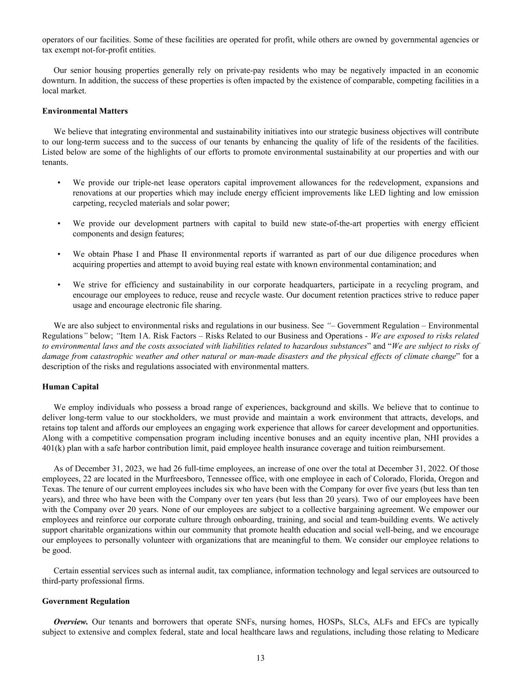 operators of our facilities. Some of these facilities are operated for profit, while others are owned by governmental agencies or tax exempt not-for-profit entities. Our senior housing properties generally rely on private-pay residents who may be negatively impacted in an economic downturn. In addition, the success of these properties is often impacted by the existence of comparable, competing facilities in a local market. Environmental Matters We believe that integrating environmental and sustainability initiatives into our strategic business objectives will contribute to our long-term success and to the success of our tenants by enhancing the quality of life of the residents of the facilities. Listed below are some of the highlights of our efforts to promote environmental sustainability at our properties and with our tenants. • We provide our triple-net lease operators capital improvement allowances for the redevelopment, expansions and renovations at our properties which may include energy efficient improvements like LED lighting and low emission carpeting, recycled materials and solar power; • We provide our development partners with capital to build new state-of-the-art properties with energy efficient components and design features; • We obtain Phase I and Phase II environmental reports if warranted as part of our due diligence procedures when acquiring properties and attempt to avoid buying real estate with known environmental contamination; and • We strive for efficiency and sustainability in our corporate headquarters, participate in a recycling program, and encourage our employees to reduce, reuse and recycle waste. Our document retention practices strive to reduce paper usage and encourage electronic file sharing. We are also subject to environmental risks and regulations in our business. See “– Government Regulation – Environmental Regulations” below; “Item 1A. Risk Factors – Risks Related to our Business and Operations - We are exposed to risks related to environmental laws and the costs associated with liabilities related to hazardous substances” and “We are subject to risks of damage from catastrophic weather and other natural or man-made disasters and the physical effects of climate change” for a description of the risks and regulations associated with environmental matters. Human Capital We employ individuals who possess a broad range of experiences, background and skills. We believe that to continue to deliver long-term value to our stockholders, we must provide and maintain a work environment that attracts, develops, and retains top talent and affords our employees an engaging work experience that allows for career development and opportunities. Along with a competitive compensation program including incentive bonuses and an equity incentive plan, NHI provides a 401(k) plan with a safe harbor contribution limit, paid employee health insurance coverage and tuition reimbursement. As of December 31, 2023, we had 26 full-time employees, an increase of one over the total at December 31, 2022. Of those employees, 22 are located in the Murfreesboro, Tennessee office, with one employee in each of Colorado, Florida, Oregon and Texas. The tenure of our current employees includes six who have been with the Company for over five years (but less than ten years), and three who have been with the Company over ten years (but less than 20 years). Two of our employees have been with the Company over 20 years. None of our employees are subject to a collective bargaining agreement. We empower our employees and reinforce our corporate culture through onboarding, training, and social and team-building events. We actively support charitable organizations within our community that promote health education and social well-being, and we encourage our employees to personally volunteer with organizations that are meaningful to them. We consider our employee relations to be good. Certain essential services such as internal audit, tax compliance, information technology and legal services are outsourced to third-party professional firms. Government Regulation Overview. Our tenants and borrowers that operate SNFs, nursing homes, HOSPs, SLCs, ALFs and EFCs are typically subject to extensive and complex federal, state and local healthcare laws and regulations, including those relating to Medicare 13