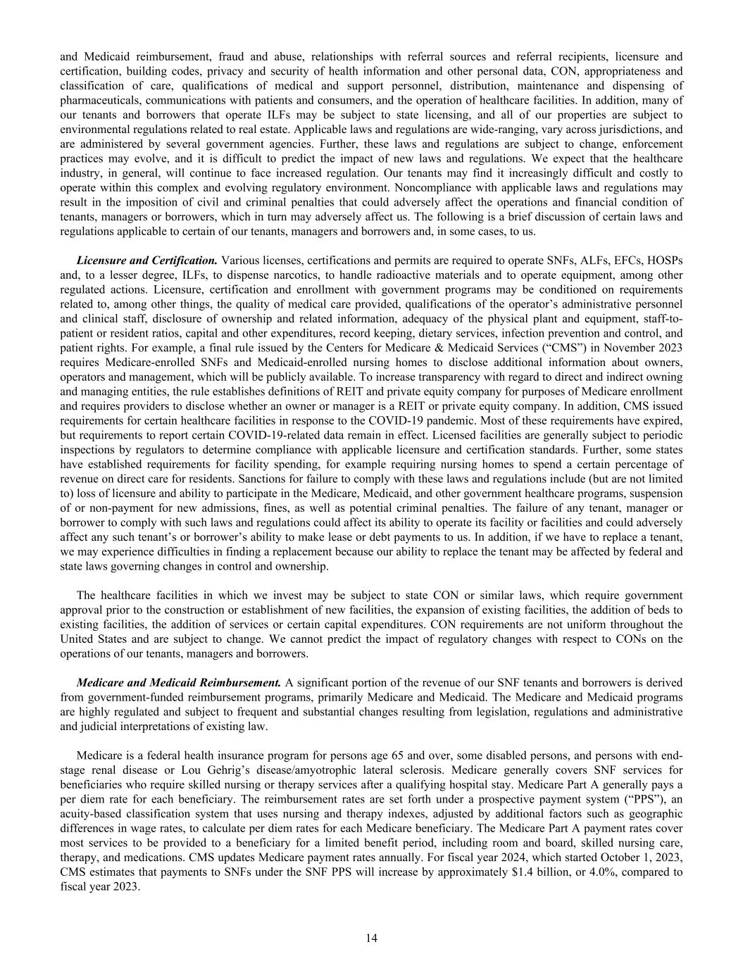 and Medicaid reimbursement, fraud and abuse, relationships with referral sources and referral recipients, licensure and certification, building codes, privacy and security of health information and other personal data, CON, appropriateness and classification of care, qualifications of medical and support personnel, distribution, maintenance and dispensing of pharmaceuticals, communications with patients and consumers, and the operation of healthcare facilities. In addition, many of our tenants and borrowers that operate ILFs may be subject to state licensing, and all of our properties are subject to environmental regulations related to real estate. Applicable laws and regulations are wide-ranging, vary across jurisdictions, and are administered by several government agencies. Further, these laws and regulations are subject to change, enforcement practices may evolve, and it is difficult to predict the impact of new laws and regulations. We expect that the healthcare industry, in general, will continue to face increased regulation. Our tenants may find it increasingly difficult and costly to operate within this complex and evolving regulatory environment. Noncompliance with applicable laws and regulations may result in the imposition of civil and criminal penalties that could adversely affect the operations and financial condition of tenants, managers or borrowers, which in turn may adversely affect us. The following is a brief discussion of certain laws and regulations applicable to certain of our tenants, managers and borrowers and, in some cases, to us. Licensure and Certification. Various licenses, certifications and permits are required to operate SNFs, ALFs, EFCs, HOSPs and, to a lesser degree, ILFs, to dispense narcotics, to handle radioactive materials and to operate equipment, among other regulated actions. Licensure, certification and enrollment with government programs may be conditioned on requirements related to, among other things, the quality of medical care provided, qualifications of the operator’s administrative personnel and clinical staff, disclosure of ownership and related information, adequacy of the physical plant and equipment, staff-to- patient or resident ratios, capital and other expenditures, record keeping, dietary services, infection prevention and control, and patient rights. For example, a final rule issued by the Centers for Medicare & Medicaid Services (“CMS”) in November 2023 requires Medicare-enrolled SNFs and Medicaid-enrolled nursing homes to disclose additional information about owners, operators and management, which will be publicly available. To increase transparency with regard to direct and indirect owning and managing entities, the rule establishes definitions of REIT and private equity company for purposes of Medicare enrollment and requires providers to disclose whether an owner or manager is a REIT or private equity company. In addition, CMS issued requirements for certain healthcare facilities in response to the COVID-19 pandemic. Most of these requirements have expired, but requirements to report certain COVID-19-related data remain in effect. Licensed facilities are generally subject to periodic inspections by regulators to determine compliance with applicable licensure and certification standards. Further, some states have established requirements for facility spending, for example requiring nursing homes to spend a certain percentage of revenue on direct care for residents. Sanctions for failure to comply with these laws and regulations include (but are not limited to) loss of licensure and ability to participate in the Medicare, Medicaid, and other government healthcare programs, suspension of or non-payment for new admissions, fines, as well as potential criminal penalties. The failure of any tenant, manager or borrower to comply with such laws and regulations could affect its ability to operate its facility or facilities and could adversely affect any such tenant’s or borrower’s ability to make lease or debt payments to us. In addition, if we have to replace a tenant, we may experience difficulties in finding a replacement because our ability to replace the tenant may be affected by federal and state laws governing changes in control and ownership. The healthcare facilities in which we invest may be subject to state CON or similar laws, which require government approval prior to the construction or establishment of new facilities, the expansion of existing facilities, the addition of beds to existing facilities, the addition of services or certain capital expenditures. CON requirements are not uniform throughout the United States and are subject to change. We cannot predict the impact of regulatory changes with respect to CONs on the operations of our tenants, managers and borrowers. Medicare and Medicaid Reimbursement. A significant portion of the revenue of our SNF tenants and borrowers is derived from government-funded reimbursement programs, primarily Medicare and Medicaid. The Medicare and Medicaid programs are highly regulated and subject to frequent and substantial changes resulting from legislation, regulations and administrative and judicial interpretations of existing law. Medicare is a federal health insurance program for persons age 65 and over, some disabled persons, and persons with end- stage renal disease or Lou Gehrig’s disease/amyotrophic lateral sclerosis. Medicare generally covers SNF services for beneficiaries who require skilled nursing or therapy services after a qualifying hospital stay. Medicare Part A generally pays a per diem rate for each beneficiary. The reimbursement rates are set forth under a prospective payment system (“PPS”), an acuity-based classification system that uses nursing and therapy indexes, adjusted by additional factors such as geographic differences in wage rates, to calculate per diem rates for each Medicare beneficiary. The Medicare Part A payment rates cover most serv