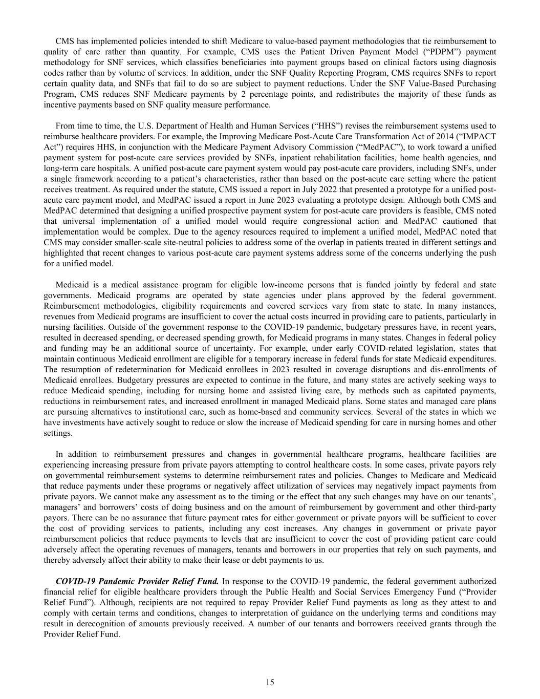 CMS has implemented policies intended to shift Medicare to value-based payment methodologies that tie reimbursement to quality of care rather than quantity. For example, CMS uses the Patient Driven Payment Model (“PDPM”) payment methodology for SNF services, which classifies beneficiaries into payment groups based on clinical factors using diagnosis codes rather than by volume of services. In addition, under the SNF Quality Reporting Program, CMS requires SNFs to report certain quality data, and SNFs that fail to do so are subject to payment reductions. Under the SNF Value-Based Purchasing Program, CMS reduces SNF Medicare payments by 2 percentage points, and redistributes the majority of these funds as incentive payments based on SNF quality measure performance. From time to time, the U.S. Department of Health and Human Services (“HHS”) revises the reimbursement systems used to reimburse healthcare providers. For example, the Improving Medicare Post-Acute Care Transformation Act of 2014 (“IMPACT Act”) requires HHS, in conjunction with the Medicare Payment Advisory Commission (“MedPAC”), to work toward a unified payment system for post-acute care services provided by SNFs, inpatient rehabilitation facilities, home health agencies, and long-term care hospitals. A unified post-acute care payment system would pay post-acute care providers, including SNFs, under a single framework according to a patient’s characteristics, rather than based on the post-acute care setting where the patient receives treatment. As required under the statute, CMS issued a report in July 2022 that presented a prototype for a unified post- acute care payment model, and MedPAC issued a report in June 2023 evaluating a prototype design. Although both CMS and MedPAC determined that designing a unified prospective payment system for post-acute care providers is feasible, CMS noted that universal implementation of a unified model would require congressional action and MedPAC cautioned that implementation would be complex. Due to the agency resources required to implement a unified model, MedPAC noted that CMS may consider smaller-scale site-neutral policies to address some of the overlap in patients treated in different settings and highlighted that recent changes to various post-acute care payment systems address some of the concerns underlying the push for a unified model. Medicaid is a medical assistance program for eligible low-income persons that is funded jointly by federal and state governments. Medicaid programs are operated by state agencies under plans approved by the federal government. Reimbursement methodologies, eligibility requirements and covered services vary from state to state. In many instances, revenues from Medicaid programs are insufficient to cover the actual costs incurred in providing care to patients, particularly in nursing facilities. Outside of the government response to the COVID-19 pandemic, budgetary pressures have, in recent years, resulted in decreased spending, or decreased spending growth, for Medicaid programs in many states. Changes in federal policy and funding may be an additional source of uncertainty. For example, under early COVID-related legislation, states that maintain continuous Medicaid enrollment are eligible for a temporary increase in federal funds for state Medicaid expenditures. The resumption of redetermination for Medicaid enrollees in 2023 resulted in coverage disruptions and dis-enrollments of Medicaid enrollees. Budgetary pressures are expected to continue in the future, and many states are actively seeking ways to reduce Medicaid spending, including for nursing home and assisted living care, by methods such as capitated payments, reductions in reimbursement rates, and increased enrollment in managed Medicaid plans. Some states and managed care plans are pursuing alternatives to institutional care, such as home-based and community services. Several of the states in which we have investments have actively sought to reduce or slow the increase of Medicaid spending for care in nursing homes and other settings. In addition to reimbursement pressures and changes in governmental healthcare programs, healthcare facilities are experiencing increasing pressure from private payors attempting to control healthcare costs. In some cases, private payors rely on governmental reimbursement systems to determine reimbursement rates and policies. Changes to Medicare and Medicaid that reduce payments under these programs or negatively affect utilization of services may negatively impact payments from private payors. We cannot make any assessment as to the timing or the effect that any such changes may have on our tenants’, managers’ and borrowers’ costs of doing business and on the amount of reimbursement by government and other third-party payors. There can be no assurance that future payment rates for either government or private payors will be sufficient to cover the cost of providing services to patients, including any cost increases. Any changes in government or private payor reimbursement policies that reduce payments to levels that are insufficient to cover the cost of providing patient care could adversely affect the operating revenues of managers, tenants and borrowers in our properties that rely on such payments, and thereby adversely affect their ability to make their lease or debt payments to us. COVID-19 Pandemic Provider Relief Fund. In response to the COVID-19 pandemic, the federal government authorized financial relief for eligible healthcare providers through the Public Health and Social Services Emergency Fund (“Provider Relief Fund”). Although, recipients are not required to repay Provider Relief Fund payments as long as they attest to and comply with certain terms and conditions, changes to interpretation of guidance on the underlying terms and conditions may result in derecognition of amounts previously received. A number of our tena