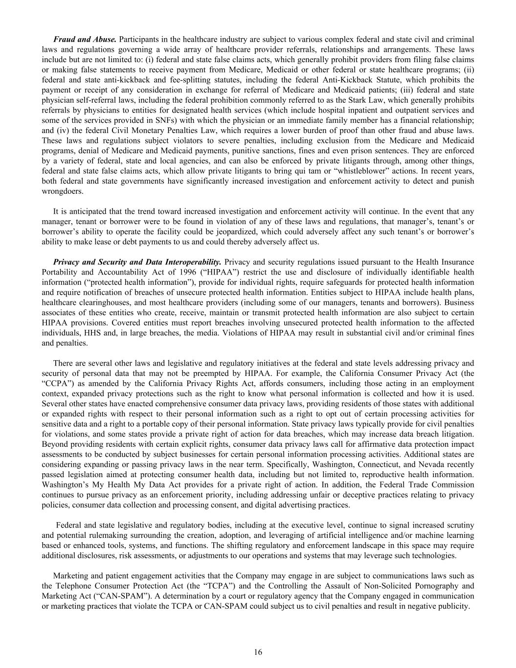 Fraud and Abuse. Participants in the healthcare industry are subject to various complex federal and state civil and criminal laws and regulations governing a wide array of healthcare provider referrals, relationships and arrangements. These laws include but are not limited to: (i) federal and state false claims acts, which generally prohibit providers from filing false claims or making false statements to receive payment from Medicare, Medicaid or other federal or state healthcare programs; (ii) federal and state anti-kickback and fee-splitting statutes, including the federal Anti-Kickback Statute, which prohibits the payment or receipt of any consideration in exchange for referral of Medicare and Medicaid patients; (iii) federal and state physician self-referral laws, including the federal prohibition commonly referred to as the Stark Law, which generally prohibits referrals by physicians to entities for designated health services (which include hospital inpatient and outpatient services and some of the services provided in SNFs) with which the physician or an immediate family member has a financial relationship; and (iv) the federal Civil Monetary Penalties Law, which requires a lower burden of proof than other fraud and abuse laws. These laws and regulations subject violators to severe penalties, including exclusion from the Medicare and Medicaid programs, denial of Medicare and Medicaid payments, punitive sanctions, fines and even prison sentences. They are enforced by a variety of federal, state and local agencies, and can also be enforced by private litigants through, among other things, federal and state false claims acts, which allow private litigants to bring qui tam or “whistleblower” actions. In recent years, both federal and state governments have significantly increased investigation and enforcement activity to detect and punish wrongdoers. It is anticipated that the trend toward increased investigation and enforcement activity will continue. In the event that any manager, tenant or borrower were to be found in violation of any of these laws and regulations, that manager’s, tenant’s or borrower’s ability to operate the facility could be jeopardized, which could adversely affect any such tenant’s or borrower’s ability to make lease or debt payments to us and could thereby adversely affect us. Privacy and Security and Data Interoperability. Privacy and security regulations issued pursuant to the Health Insurance Portability and Accountability Act of 1996 (“HIPAA”) restrict the use and disclosure of individually identifiable health information (“protected health information”), provide for individual rights, require safeguards for protected health information and require notification of breaches of unsecure protected health information. Entities subject to HIPAA include health plans, healthcare clearinghouses, and most healthcare providers (including some of our managers, tenants and borrowers). Business associates of these entities who create, receive, maintain or transmit protected health information are also subject to certain HIPAA provisions. Covered entities must report breaches involving unsecured protected health information to the affected individuals, HHS and, in large breaches, the media. Violations of HIPAA may result in substantial civil and/or criminal fines and penalties. There are several other laws and legislative and regulatory initiatives at the federal and state levels addressing privacy and security of personal data that may not be preempted by HIPAA. For example, the California Consumer Privacy Act (the “CCPA”) as amended by the California Privacy Rights Act, affords consumers, including those acting in an employment context, expanded privacy protections such as the right to know what personal information is collected and how it is used. Several other states have enacted comprehensive consumer data privacy laws, providing residents of those states with additional or expanded rights with respect to their personal information such as a right to opt out of certain processing activities for sensitive data and a right to a portable copy of their personal information. State privacy laws typically provide for civil penalties for violations, and some states provide a private right of action for data breaches, which may increase data breach litigation. Beyond providing residents with certain explicit rights, consumer data privacy laws call for affirmative data protection impact assessments to be conducted by subject businesses for certain personal information processing activities. Additional states are considering expanding or passing privacy laws in the near term. Specifically, Washington, Connecticut, and Nevada recently passed legislation aimed at protecting consumer health data, including but not limited to, reproductive health information. Washington’s My Health My Data Act provides for a private right of action. In addition, the Federal Trade Commission continues to pursue privacy as an enforcement priority, including addressing unfair or deceptive practices relating to privacy policies, consumer data collection and processing consent, and digital advertising practices. Federal and state legislative and regulatory bodies, including at the executive level, continue to signal increased scrutiny and potential rulemaking surrounding the creation, adoption, and leveraging of artificial intelligence and/or machine learning based or enhanced tools, systems, and functions. The shifting regulatory and enforcement landscape in this space may require additional disclosures, risk assessments, or adjustments to our operations and systems that may leverage such technologies. Marketing and patient engagement activities that the Company may engage in are subject to communications laws such as the Telephone Consumer Protection Act (the “TCPA”) and the Controlling the Assault of Non-Solicited Pornography and Marketing Act (“CAN-SPAM”). A det