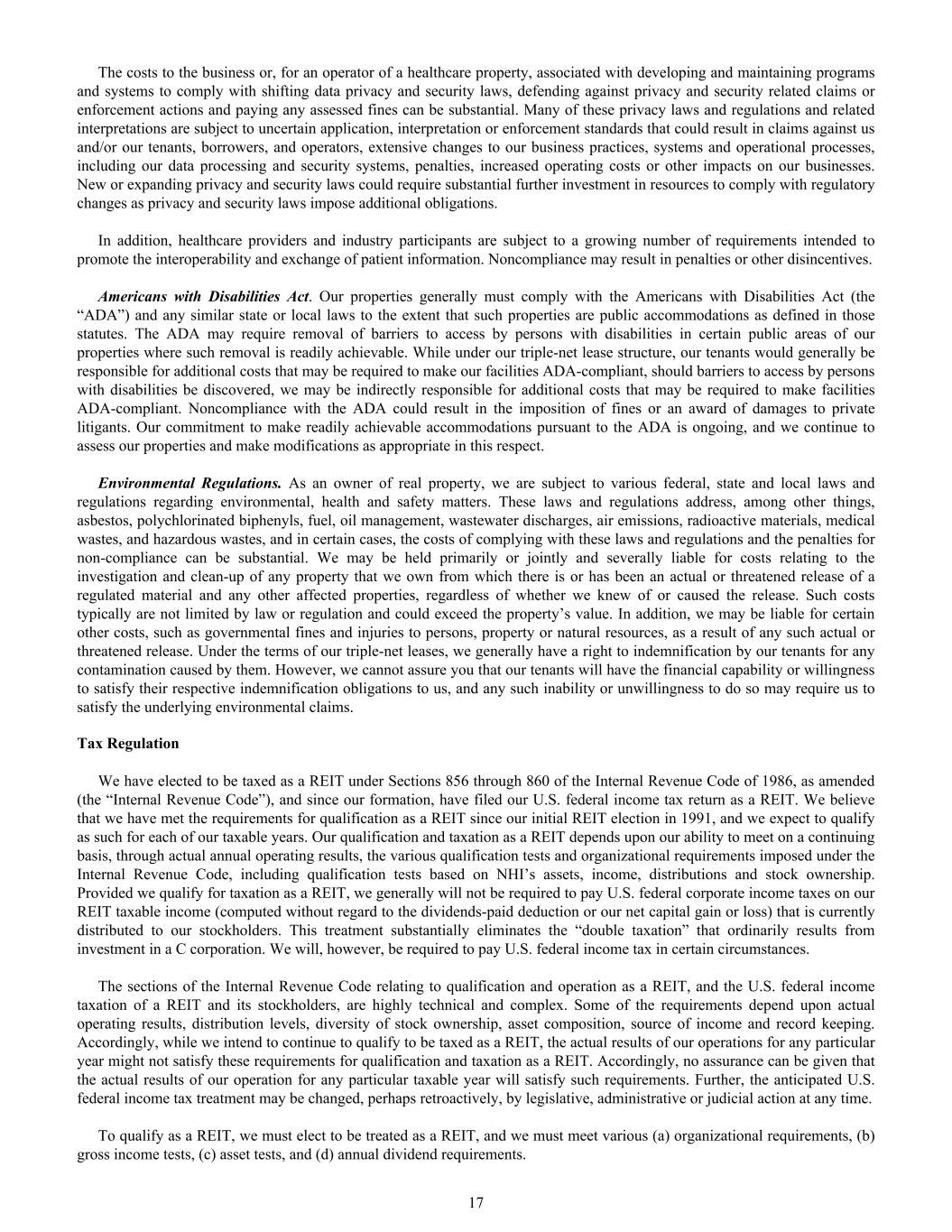 The costs to the business or, for an operator of a healthcare property, associated with developing and maintaining programs and systems to comply with shifting data privacy and security laws, defending against privacy and security related claims or enforcement actions and paying any assessed fines can be substantial. Many of these privacy laws and regulations and related interpretations are subject to uncertain application, interpretation or enforcement standards that could result in claims against us and/or our tenants, borrowers, and operators, extensive changes to our business practices, systems and operational processes, including our data processing and security systems, penalties, increased operating costs or other impacts on our businesses. New or expanding privacy and security laws could require substantial further investment in resources to comply with regulatory changes as privacy and security laws impose additional obligations. In addition, healthcare providers and industry participants are subject to a growing number of requirements intended to promote the interoperability and exchange of patient information. Noncompliance may result in penalties or other disincentives. Americans with Disabilities Act. Our properties generally must comply with the Americans with Disabilities Act (the “ADA”) and any similar state or local laws to the extent that such properties are public accommodations as defined in those statutes. The ADA may require removal of barriers to access by persons with disabilities in certain public areas of our properties where such removal is readily achievable. While under our triple-net lease structure, our tenants would generally be responsible for additional costs that may be required to make our facilities ADA-compliant, should barriers to access by persons with disabilities be discovered, we may be indirectly responsible for additional costs that may be required to make facilities ADA-compliant. Noncompliance with the ADA could result in the imposition of fines or an award of damages to private litigants. Our commitment to make readily achievable accommodations pursuant to the ADA is ongoing, and we continue to assess our properties and make modifications as appropriate in this respect. Environmental Regulations. As an owner of real property, we are subject to various federal, state and local laws and regulations regarding environmental, health and safety matters. These laws and regulations address, among other things, asbestos, polychlorinated biphenyls, fuel, oil management, wastewater discharges, air emissions, radioactive materials, medical wastes, and hazardous wastes, and in certain cases, the costs of complying with these laws and regulations and the penalties for non-compliance can be substantial. We may be held primarily or jointly and severally liable for costs relating to the investigation and clean-up of any property that we own from which there is or has been an actual or threatened release of a regulated material and any other affected properties, regardless of whether we knew of or caused the release. Such costs typically are not limited by law or regulation and could exceed the property’s value. In addition, we may be liable for certain other costs, such as governmental fines and injuries to persons, property or natural resources, as a result of any such actual or threatened release. Under the terms of our triple-net leases, we generally have a right to indemnification by our tenants for any contamination caused by them. However, we cannot assure you that our tenants will have the financial capability or willingness to satisfy their respective indemnification obligations to us, and any such inability or unwillingness to do so may require us to satisfy the underlying environmental claims. Tax Regulation We have elected to be taxed as a REIT under Sections 856 through 860 of the Internal Revenue Code of 1986, as amended (the “Internal Revenue Code”), and since our formation, have filed our U.S. federal income tax return as a REIT. We believe that we have met the requirements for qualification as a REIT since our initial REIT election in 1991, and we expect to qualify as such for each of our taxable years. Our qualification and taxation as a REIT depends upon our ability to meet on a continuing basis, through actual annual operating results, the various qualification tests and organizational requirements imposed under the Internal Revenue Code, including qualification tests based on NHI’s assets, income, distributions and stock ownership. Provided we qualify for taxation as a REIT, we generally will not be required to pay U.S. federal corporate income taxes on our REIT taxable income (computed without regard to the dividends-paid deduction or our net capital gain or loss) that is currently distributed to our stockholders. This treatment substantially eliminates the “double taxation” that ordinarily results from investment in a C corporation. We will, however, be required to pay U.S. federal income tax in certain circumstances. The sections of the Internal Revenue Code relating to qualification and operation as a REIT, and the U.S. federal income taxation of a REIT and its stockholders, are highly technical and complex. Some of the requirements depend upon actual operating results, distribution levels, diversity of stock ownership, asset composition, source of income and record keeping. Accordingly, while we intend to continue to qualify to be taxed as a REIT, the actual results of our operations for any particular year might not satisfy these requirements for qualification and taxation as a REIT. Accordingly, no assurance can be given that the actual results of our operation for any particular taxable year will satisfy such requirements. Further, the anticipated U.S. federal income tax treatment may be changed, perhaps retroactively, by legislative, administrative or judicial action at any time. To qualify as a REIT, we must ele