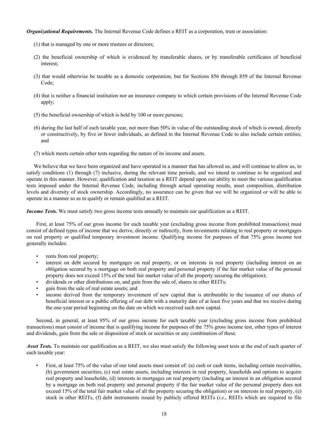 Organizational Requirements. The Internal Revenue Code defines a REIT as a corporation, trust or association: (1) that is managed by one or more trustees or directors; (2) the beneficial ownership of which is evidenced by transferable shares, or by transferable certificates of beneficial interest; (3) that would otherwise be taxable as a domestic corporation, but for Sections 856 through 859 of the Internal Revenue Code; (4) that is neither a financial institution nor an insurance company to which certain provisions of the Internal Revenue Code apply; (5) the beneficial ownership of which is held by 100 or more persons; (6) during the last half of each taxable year, not more than 50% in value of the outstanding stock of which is owned, directly or constructively, by five or fewer individuals, as defined in the Internal Revenue Code to also include certain entities; and (7) which meets certain other tests regarding the nature of its income and assets. We believe that we have been organized and have operated in a manner that has allowed us, and will continue to allow us, to satisfy conditions (1) through (7) inclusive, during the relevant time periods, and we intend to continue to be organized and operate in this manner. However, qualification and taxation as a REIT depend upon our ability to meet the various qualification tests imposed under the Internal Revenue Code, including through actual operating results, asset composition, distribution levels and diversity of stock ownership. Accordingly, no assurance can be given that we will be organized or will be able to operate in a manner so as to qualify or remain qualified as a REIT. Income Tests. We must satisfy two gross income tests annually to maintain our qualification as a REIT. First, at least 75% of our gross income for each taxable year (excluding gross income from prohibited transactions) must consist of defined types of income that we derive, directly or indirectly, from investments relating to real property or mortgages on real property or qualified temporary investment income. Qualifying income for purposes of that 75% gross income test generally includes: • rents from real property; • interest on debt secured by mortgages on real property, or on interests in real property (including interest on an obligation secured by a mortgage on both real property and personal property if the fair market value of the personal property does not exceed 15% of the total fair market value of all the property securing the obligation); • dividends or other distributions on, and gain from the sale of, shares in other REITs; • gain from the sale of real estate assets; and • income derived from the temporary investment of new capital that is attributable to the issuance of our shares of beneficial interest or a public offering of our debt with a maturity date of at least five years and that we receive during the one-year period beginning on the date on which we received such new capital. Second, in general, at least 95% of our gross income for each taxable year (excluding gross income from prohibited transactions) must consist of income that is qualifying income for purposes of the 75% gross income test, other types of interest and dividends, gain from the sale or disposition of stock or securities or any combination of these. Asset Tests. To maintain our qualification as a REIT, we also must satisfy the following asset tests at the end of each quarter of each taxable year: • First, at least 75% of the value of our total assets must consist of: (a) cash or cash items, including certain receivables, (b) government securities, (c) real estate assets, including interests in real property, leaseholds and options to acquire real property and leaseholds, (d) interests in mortgages on real property (including an interest in an obligation secured by a mortgage on both real property and personal property if the fair market value of the personal property does not exceed 15% of the total fair market value of all the property securing the obligation) or on interests in real property, (e) stock in other REITs, (f) debt instruments issued by publicly offered REITs (i.e., REITs which are required to file 18