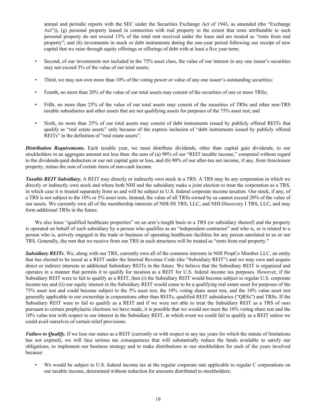 annual and periodic reports with the SEC under the Securities Exchange Act of 1943, as amended (the “Exchange Act”)), (g) personal property leased in connection with real property to the extent that rents attributable to such personal property do not exceed 15% of the total rent received under the lease and are treated as “rents from real property”; and (h) investments in stock or debt instruments during the one-year period following our receipt of new capital that we raise through equity offerings or offerings of debt with at least a five year term; • Second, of our investments not included in the 75% asset class, the value of our interest in any one issuer’s securities may not exceed 5% of the value of our total assets; • Third, we may not own more than 10% of the voting power or value of any one issuer’s outstanding securities; • Fourth, no more than 20% of the value of our total assets may consist of the securities of one or more TRSs; • Fifth, no more than 25% of the value of our total assets may consist of the securities of TRSs and other non-TRS taxable subsidiaries and other assets that are not qualifying assets for purposes of the 75% asset test; and • Sixth, no more than 25% of our total assets may consist of debt instruments issued by publicly offered REITs that qualify as “real estate assets” only because of the express inclusion of “debt instruments issued by publicly offered REITs” in the definition of “real estate assets”. Distribution Requirements. Each taxable year, we must distribute dividends, other than capital gain dividends, to our stockholders in an aggregate amount not less than: the sum of (a) 90% of our “REIT taxable income,” computed without regard to the dividends-paid deduction or our net capital gain or loss, and (b) 90% of our after-tax net income, if any, from foreclosure property, minus the sum of certain items of non-cash income. Taxable REIT Subsidiary. A REIT may directly or indirectly own stock in a TRS. A TRS may be any corporation in which we directly or indirectly own stock and where both NHI and the subsidiary make a joint election to treat the corporation as a TRS, in which case it is treated separately from us and will be subject to U.S. federal corporate income taxation. Our stock, if any, of a TRS is not subject to the 10% or 5% asset tests. Instead, the value of all TRSs owned by us cannot exceed 20% of the value of our assets. We currently own all of the membership interests of NHI-SS TRS, LLC, and NHI-Discovery I TRS, LLC, and may form additional TRSs in the future. We also lease “qualified healthcare properties” on an arm’s-length basis to a TRS (or subsidiary thereof) and the property is operated on behalf of such subsidiary by a person who qualifies as an “independent contractor” and who is, or is related to a person who is, actively engaged in the trade or business of operating healthcare facilities for any person unrelated to us or our TRS. Generally, the rent that we receive from our TRS in such structures will be treated as “rents from real property.” Subsidiary REITs. We, along with our TRS, currently own all of the common interests in NHI PropCo Member LLC, an entity that has elected to be taxed as a REIT under the Internal Revenue Code (the “Subsidiary REIT”) and we may own and acquire direct or indirect interests in additional Subsidiary REITs in the future. We believe that the Subsidiary REIT is organized and operates in a manner that permits it to qualify for taxation as a REIT for U.S. federal income tax purposes. However, if the Subsidiary REIT were to fail to qualify as a REIT, then (i) the Subsidiary REIT would become subject to regular U.S. corporate income tax and (ii) our equity interest in the Subsidiary REIT would cease to be a qualifying real estate asset for purposes of the 75% asset test and could become subject to the 5% asset test, the 10% voting share asset test, and the 10% value asset test generally applicable to our ownership in corporations other than REITs, qualified REIT subsidiaries (“QRSs”) and TRSs. If the Subsidiary REIT were to fail to qualify as a REIT and if we were not able to treat the Subsidiary REIT as a TRS of ours pursuant to certain prophylactic elections we have made, it is possible that we would not meet the 10% voting share test and the 10% value test with respect to our interest in the Subsidiary REIT, in which event we could fail to qualify as a REIT unless we could avail ourselves of certain relief provisions. Failure to Qualify. If we lose our status as a REIT (currently or with respect to any tax years for which the statute of limitations has not expired), we will face serious tax consequences that will substantially reduce the funds available to satisfy our obligations, to implement our business strategy and to make distributions to our stockholders for each of the years involved because: • We would be subject to U.S. federal income tax at the regular corporate rate applicable to regular C corporations on our taxable income, determined without reduction for amounts distributed to stockholders; 19