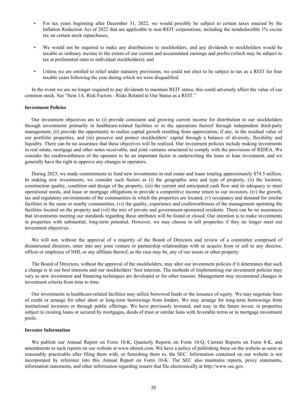 • For tax years beginning after December 31, 2022, we would possibly be subject to certain taxes enacted by the Inflation Reduction Act of 2022 that are applicable to non-REIT corporations, including the nondeductible 1% excise tax on certain stock repurchases; • We would not be required to make any distributions to stockholders, and any dividends to stockholders would be taxable as ordinary income to the extent of our current and accumulated earnings and profits (which may be subject to tax at preferential rates to individual stockholders); and • Unless we are entitled to relief under statutory provisions, we could not elect to be subject to tax as a REIT for four taxable years following the year during which we were disqualified. In the event we are no longer required to pay dividends to maintain REIT status, this could adversely affect the value of our common stock. See “Item 1A. Risk Factors - Risks Related to Our Status as a REIT.” Investment Policies Our investment objectives are to (i) provide consistent and growing current income for distribution to our stockholders through investments primarily in healthcare-related facilities or in the operations thereof through independent third-party management, (ii) provide the opportunity to realize capital growth resulting from appreciation, if any, in the residual value of our portfolio properties, and (iii) preserve and protect stockholders’ capital through a balance of diversity, flexibility and liquidity. There can be no assurance that these objectives will be realized. Our investment policies include making investments in real estate, mortgage and other notes receivable, and joint ventures structured to comply with the provisions of RIDEA. We consider the creditworthiness of the operator to be an important factor in underwriting the lease or loan investment, and we generally have the right to approve any changes in operators. During 2023, we made commitments to fund new investments in real estate and loans totaling approximately $74.5 million. In making new investments, we consider such factors as (i) the geographic area and type of property, (ii) the location, construction quality, condition and design of the property, (iii) the current and anticipated cash flow and its adequacy to meet operational needs, and lease or mortgage obligations to provide a competitive income return to our investors, (iv) the growth, tax and regulatory environments of the communities in which the properties are located, (v) occupancy and demand for similar facilities in the same or nearby communities, (vi) the quality, experience and creditworthiness of the management operating the facilities located on the property and (vii) the mix of private and government-sponsored residents. There can be no assurances that investments meeting our standards regarding these attributes will be found or closed. Our intention is to make investments in properties with substantial, long-term potential. However, we may choose to sell properties if they no longer meet our investment objectives. We will not, without the approval of a majority of the Board of Directors and review of a committee comprised of disinterested directors, enter into any joint venture or partnership relationships with or acquire from or sell to any director, officer or employee of NHI, or any affiliate thereof, as the case may be, any of our assets or other property. The Board of Directors, without the approval of the stockholders, may alter our investment policies if it determines that such a change is in our best interests and our stockholders’ best interests. The methods of implementing our investment policies may vary as new investment and financing techniques are developed or for other reasons. Management may recommend changes in investment criteria from time to time. Our investments in healthcare-related facilities may utilize borrowed funds or the issuance of equity. We may negotiate lines of credit or arrange for other short or long-term borrowings from lenders. We may arrange for long-term borrowings from institutional investors or through public offerings. We have previously invested, and may in the future invest, in properties subject to existing loans or secured by mortgages, deeds of trust or similar liens with favorable terms or in mortgage investment pools. Investor Information We publish our Annual Report on Form 10-K, Quarterly Reports on Form 10-Q, Current Reports on Form 8-K, and amendments to such reports on our website at www.nhireit.com. We have a policy of publishing these on the website as soon as reasonably practicable after filing them with, or furnishing them to, the SEC. Information contained on our website is not incorporated by reference into this Annual Report on Form 10-K. The SEC also maintains reports, proxy statements, information statements, and other information regarding issuers that file electronically at http://www.sec.gov. 20