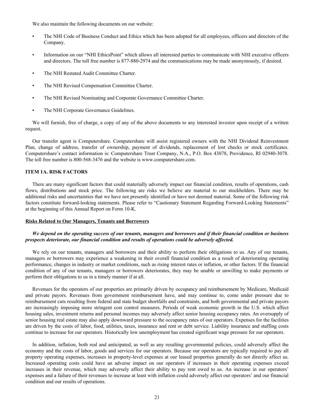 We also maintain the following documents on our website: ▪ The NHI Code of Business Conduct and Ethics which has been adopted for all employees, officers and directors of the Company. ▪ Information on our “NHI EthicsPoint” which allows all interested parties to communicate with NHI executive officers and directors. The toll free number is 877-880-2974 and the communications may be made anonymously, if desired. ▪ The NHI Restated Audit Committee Charter. ▪ The NHI Revised Compensation Committee Charter. ▪ The NHI Revised Nominating and Corporate Governance Committee Charter. ▪ The NHI Corporate Governance Guidelines. We will furnish, free of charge, a copy of any of the above documents to any interested investor upon receipt of a written request. Our transfer agent is Computershare. Computershare will assist registered owners with the NHI Dividend Reinvestment Plan, change of address, transfer of ownership, payment of dividends, replacement of lost checks or stock certificates. Computershare’s contact information is: Computershare Trust Company, N.A., P.O. Box 43078, Providence, RI 02940-3078. The toll free number is 800-568-3476 and the website is www.computershare.com. ITEM 1A. RISK FACTORS There are many significant factors that could materially adversely impact our financial condition, results of operations, cash flows, distributions and stock price. The following are risks we believe are material to our stockholders. There may be additional risks and uncertainties that we have not presently identified or have not deemed material. Some of the following risk factors constitute forward-looking statements. Please refer to “Cautionary Statement Regarding Forward-Looking Statements” at the beginning of this Annual Report on Form 10-K. Risks Related to Our Managers, Tenants and Borrowers We depend on the operating success of our tenants, managers and borrowers and if their financial condition or business prospects deteriorate, our financial condition and results of operations could be adversely affected. We rely on our tenants, managers and borrowers and their ability to perform their obligations to us. Any of our tenants, managers or borrowers may experience a weakening in their overall financial condition as a result of deteriorating operating performance, changes in industry or market conditions, such as rising interest rates or inflation, or other factors. If the financial condition of any of our tenants, managers or borrowers deteriorates, they may be unable or unwilling to make payments or perform their obligations to us in a timely manner if at all. Revenues for the operators of our properties are primarily driven by occupancy and reimbursement by Medicare, Medicaid and private payors. Revenues from government reimbursement have, and may continue to, come under pressure due to reimbursement cuts resulting from federal and state budget shortfalls and constraints, and both governmental and private payors are increasingly imposing more stringent cost control measures. Periods of weak economic growth in the U.S. which affect housing sales, investment returns and personal incomes may adversely affect senior housing occupancy rates. An oversupply of senior housing real estate may also apply downward pressure to the occupancy rates of our operators. Expenses for the facilities are driven by the costs of labor, food, utilities, taxes, insurance and rent or debt service. Liability insurance and staffing costs continue to increase for our operators. Historically low unemployment has created significant wage pressure for our operators. In addition, inflation, both real and anticipated, as well as any resulting governmental policies, could adversely affect the economy and the costs of labor, goods and services for our operators. Because our operators are typically required to pay all property operating expenses, increases in property-level expenses at our leased properties generally do not directly affect us. Increased operating costs could have an adverse impact on our operators if increases in their operating expenses exceed increases in their revenue, which may adversely affect their ability to pay rent owed to us. An increase in our operators’ expenses and a failure of their revenues to increase at least with inflation could adversely affect our operators’ and our financial condition and our results of operations. 21