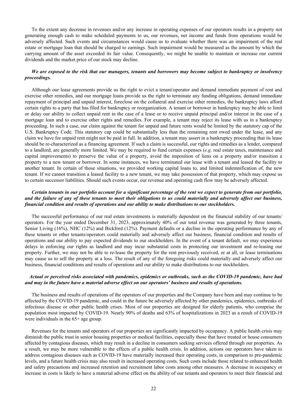 To the extent any decrease in revenues and/or any increase in operating expenses of our operators results in a property not generating enough cash to make scheduled payments to us, our revenues, net income and funds from operations would be adversely affected. Such events and circumstances would cause us to evaluate whether there was an impairment of the real estate or mortgage loan that should be charged to earnings. Such impairment would be measured as the amount by which the carrying amount of the asset exceeded its fair value. Consequently, we might be unable to maintain or increase our current dividends and the market price of our stock may decline. We are exposed to the risk that our managers, tenants and borrowers may become subject to bankruptcy or insolvency proceedings. Although our lease agreements provide us the right to evict a tenant/operator and demand immediate payment of rent and exercise other remedies, and our mortgage loans provide us the right to terminate any funding obligations, demand immediate repayment of principal and unpaid interest, foreclose on the collateral and exercise other remedies, the bankruptcy laws afford certain rights to a party that has filed for bankruptcy or reorganization. A tenant or borrower in bankruptcy may be able to limit or delay our ability to collect unpaid rent in the case of a lease or to receive unpaid principal and/or interest in the case of a mortgage loan and to exercise other rights and remedies. For example, a tenant may reject its lease with us in a bankruptcy proceeding. In such a case, our claim against the tenant for unpaid and future rents would be limited by the statutory cap of the U.S. Bankruptcy Code. This statutory cap could be substantially less than the remaining rent owed under the lease, and any claim we have for unpaid rent might not be paid in full. In addition, a tenant may assert in a bankruptcy proceeding that its lease should be re-characterized as a financing agreement. If such a claim is successful, our rights and remedies as a lender, compared to a landlord, are generally more limited. We may be required to fund certain expenses (e.g. real estate taxes, maintenance and capital improvements) to preserve the value of a property, avoid the imposition of liens on a property and/or transition a property to a new tenant or borrower. In some instances, we have terminated our lease with a tenant and leased the facility to another tenant. In certain of those situations, we provided working capital loans to, and limited indemnification of, the new tenant. If we cannot transition a leased facility to a new tenant, we may take possession of that property, which may expose us to certain successor liabilities. Should such events occur, our revenue and operating cash flow may be adversely affected. Certain tenants in our portfolio account for a significant percentage of the rent we expect to generate from our portfolio, and the failure of any of these tenants to meet their obligations to us could materially and adversely affect our business, financial condition and results of operations and our ability to make distributions to our stockholders. The successful performance of our real estate investments is materially dependent on the financial stability of our tenants/ operators. For the year ended December 31, 2023, approximately 40% of our total revenue was generated by three tenants, Senior Living (16%), NHC (12%) and Bickford (12%). Payment defaults or a decline in the operating performance by any of these tenants or other tenants/operators could materially and adversely affect our business, financial condition and results of operations and our ability to pay expected dividends to our stockholders. In the event of a tenant default, we may experience delays in enforcing our rights as landlord and may incur substantial costs in protecting our investment and re-leasing our property. Further, we may not be able to re-lease the property for the rent previously received, or at all, or lease terminations may cause us to sell the property at a loss. The result of any of the foregoing risks could materially and adversely affect our business, financial conditions and results of operations and our ability to make distributions to our stockholders. Actual or perceived risks associated with pandemics, epidemics or outbreaks, such as the COVID-19 pandemic, have had and may in the future have a material adverse effect on our operators’ business and results of operations. The business and results of operations of the operators of our properties and the Company have been and may continue to be affected by the COVID-19 pandemic, and could in the future be adversely affected by other pandemics, epidemics, outbreaks of infectious disease or other public health crises. Most of our properties are designed for elderly patients, who comprise the population most impacted by COVID-19. Nearly 90% of deaths and 63% of hospitalizations in 2023 as a result of COVID-19 were individuals in the 65+ age group. Revenues for the tenants and operators of our properties are significantly impacted by occupancy. A public health crisis may diminish the public trust in senior housing properties or medical facilities, especially those that have treated or house consumers affected by contagious diseases, which may result in a decline in consumers seeking services offered through our properties. As a result, we may be more vulnerable to the effects of a public health crisis. In addition, actions our operators have taken to address contagious diseases such as COVID-19 have materially increased their operating costs, in comparison to pre-pandemic levels, and a future health crisis may also result in increased operating costs. Such costs include those related to enhanced health and safety precautions and increased retention and recruitment labor costs among other measures. A decrease in occupancy or increase in costs is likely to have a material adverse effect o