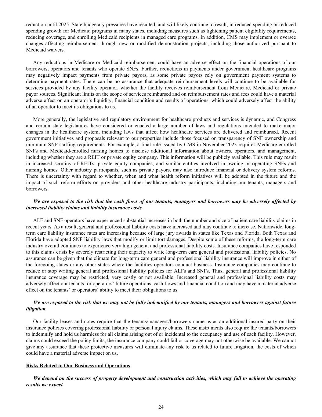 reduction until 2025. State budgetary pressures have resulted, and will likely continue to result, in reduced spending or reduced spending growth for Medicaid programs in many states, including measures such as tightening patient eligibility requirements, reducing coverage, and enrolling Medicaid recipients in managed care programs. In addition, CMS may implement or oversee changes affecting reimbursement through new or modified demonstration projects, including those authorized pursuant to Medicaid waivers. Any reductions in Medicare or Medicaid reimbursement could have an adverse effect on the financial operations of our borrowers, operators and tenants who operate SNFs. Further, reductions in payments under government healthcare programs may negatively impact payments from private payors, as some private payors rely on government payment systems to determine payment rates. There can be no assurance that adequate reimbursement levels will continue to be available for services provided by any facility operator, whether the facility receives reimbursement from Medicare, Medicaid or private payor sources. Significant limits on the scope of services reimbursed and on reimbursement rates and fees could have a material adverse effect on an operator’s liquidity, financial condition and results of operations, which could adversely affect the ability of an operator to meet its obligations to us. More generally, the legislative and regulatory environment for healthcare products and services is dynamic, and Congress and certain state legislatures have considered or enacted a large number of laws and regulations intended to make major changes in the healthcare system, including laws that affect how healthcare services are delivered and reimbursed. Recent government initiatives and proposals relevant to our properties include those focused on transparency of SNF ownership and minimum SNF staffing requirements. For example, a final rule issued by CMS in November 2023 requires Medicare-enrolled SNFs and Medicaid-enrolled nursing homes to disclose additional information about owners, operators, and management, including whether they are a REIT or private equity company. This information will be publicly available. This rule may result in increased scrutiny of REITs, private equity companies, and similar entities involved in owning or operating SNFs and nursing homes. Other industry participants, such as private payors, may also introduce financial or delivery system reforms. There is uncertainty with regard to whether, when and what health reform initiatives will be adopted in the future and the impact of such reform efforts on providers and other healthcare industry participants, including our tenants, managers and borrowers. We are exposed to the risk that the cash flows of our tenants, managers and borrowers may be adversely affected by increased liability claims and liability insurance costs. ALF and SNF operators have experienced substantial increases in both the number and size of patient care liability claims in recent years. As a result, general and professional liability costs have increased and may continue to increase. Nationwide, long- term care liability insurance rates are increasing because of large jury awards in states like Texas and Florida. Both Texas and Florida have adopted SNF liability laws that modify or limit tort damages. Despite some of these reforms, the long-term care industry overall continues to experience very high general and professional liability costs. Insurance companies have responded to this claims crisis by severely restricting their capacity to write long-term care general and professional liability policies. No assurance can be given that the climate for long-term care general and professional liability insurance will improve in either of the foregoing states or any other states where the facilities operators conduct business. Insurance companies may continue to reduce or stop writing general and professional liability policies for ALFs and SNFs. Thus, general and professional liability insurance coverage may be restricted, very costly or not available. Increased general and professional liability costs may adversely affect our tenants’ or operators’ future operations, cash flows and financial condition and may have a material adverse effect on the tenants’ or operators’ ability to meet their obligations to us. We are exposed to the risk that we may not be fully indemnified by our tenants, managers and borrowers against future litigation. Our facility leases and notes require that the tenants/managers/borrowers name us as an additional insured party on their insurance policies covering professional liability or personal injury claims. These instruments also require the tenants/borrowers to indemnify and hold us harmless for all claims arising out of or incidental to the occupancy and use of each facility. However, claims could exceed the policy limits, the insurance company could fail or coverage may not otherwise be available. We cannot give any assurance that these protective measures will eliminate any risk to us related to future litigation, the costs of which could have a material adverse impact on us. Risks Related to Our Business and Operations We depend on the success of property development and construction activities, which may fail to achieve the operating results we expect. 24