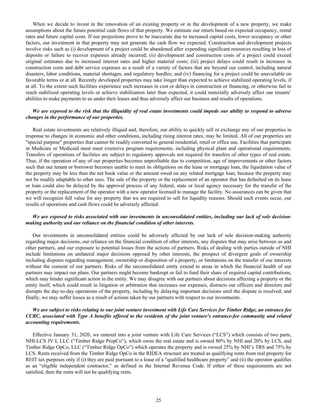 When we decide to invest in the renovation of an existing property or in the development of a new property, we make assumptions about the future potential cash flows of that property. We estimate our return based on expected occupancy, rental rates and future capital costs. If our projections prove to be inaccurate due to increased capital costs, lower occupancy or other factors, our investment in that property may not generate the cash flow we expected. Construction and development projects involve risks such as (i) development of a project could be abandoned after expending significant resources resulting in loss of deposits or failure to recover expenses already incurred; (ii) development and construction costs of a project could exceed original estimates due to increased interest rates and higher material costs; (iii) project delays could result in increases in construction costs and debt service expenses as a result of a variety of factors that are beyond our control, including natural disasters, labor conditions, material shortages, and regulatory hurdles; and (iv) financing for a project could be unavailable on favorable terms or at all. Recently developed properties may take longer than expected to achieve stabilized operating levels, if at all. To the extent such facilities experience such increases in cost or delays in construction or financing, or otherwise fail to reach stabilized operating levels or achieve stabilization later than expected, it could materially adversely affect our tenants’ abilities to make payments to us under their leases and thus adversely affect our business and results of operations. We are exposed to the risk that the illiquidity of real estate investments could impede our ability to respond to adverse changes in the performance of our properties. Real estate investments are relatively illiquid and, therefore, our ability to quickly sell or exchange any of our properties in response to changes in economic and other conditions, including rising interest rates, may be limited. All of our properties are "special purpose" properties that cannot be readily converted to general residential, retail or office use. Facilities that participate in Medicare or Medicaid must meet extensive program requirements, including physical plant and operational requirements. Transfers of operations of facilities are subject to regulatory approvals not required for transfers of other types of real estate. Thus, if the operation of any of our properties becomes unprofitable due to competition, age of improvements or other factors such that our tenant or borrower becomes unable to meet its obligations on the lease or mortgage loan, the liquidation value of the property may be less than the net book value or the amount owed on any related mortgage loan, because the property may not be readily adaptable to other uses. The sale of the property or the replacement of an operator that has defaulted on its lease or loan could also be delayed by the approval process of any federal, state or local agency necessary for the transfer of the property or the replacement of the operator with a new operator licensed to manage the facility. No assurances can be given that we will recognize full value for any property that we are required to sell for liquidity reasons. Should such events occur, our results of operations and cash flows could be adversely affected. We are exposed to risks associated with our investments in unconsolidated entities, including our lack of sole decision- making authority and our reliance on the financial condition of other interests. Our investments in unconsolidated entities could be adversely affected by our lack of sole decision-making authority regarding major decisions, our reliance on the financial condition of other interests, any disputes that may arise between us and other partners, and our exposure to potential losses from the actions of partners. Risks of dealing with parties outside of NHI include limitations on unilateral major decisions opposed by other interests, the prospect of divergent goals of ownership including disputes regarding management, ownership or disposition of a property, or limitations on the transfer of our interests without the consent of our partners. Risks of the unconsolidated entity extend to areas in which the financial health of our partners may impact our plans. Our partners might become bankrupt or fail to fund their share of required capital contributions, which may hinder significant action in the entity. We may disagree with our partners about decisions affecting a property or the entity itself, which could result in litigation or arbitration that increases our expenses, distracts our officers and directors and disrupts the day-to-day operations of the property, including by delaying important decisions until the dispute is resolved; and finally, we may suffer losses as a result of actions taken by our partners with respect to our investments. We are subject to risks relating to our joint venture investment with Life Care Services for Timber Ridge, an entrance fee CCRC, associated with Type A benefits offered to the residents of the joint venture's entrance-fee community and related accounting requirements. Effective January 31, 2020, we entered into a joint venture with Life Care Services (“LCS”) which consists of two parts, NHI-LCS JV I, LLC (“Timber Ridge PropCo”), which owns the real estate and is owned 80% by NHI and 20% by LCS, and Timber Ridge OpCo, LLC (“Timber Ridge OpCo”) which operates the property and is owned 25% by NHI’s TRS and 75% by LCS. Rents received from the Timber Ridge OpCo in the RIDEA structure are treated as qualifying rents from real property for REIT tax purposes only if (i) they are paid pursuant to a lease of a “qualified healthcare property” and (ii) the operator qualifies as an “eligible independent contractor,” as defined in the Internal Revenue Code. If either of thes