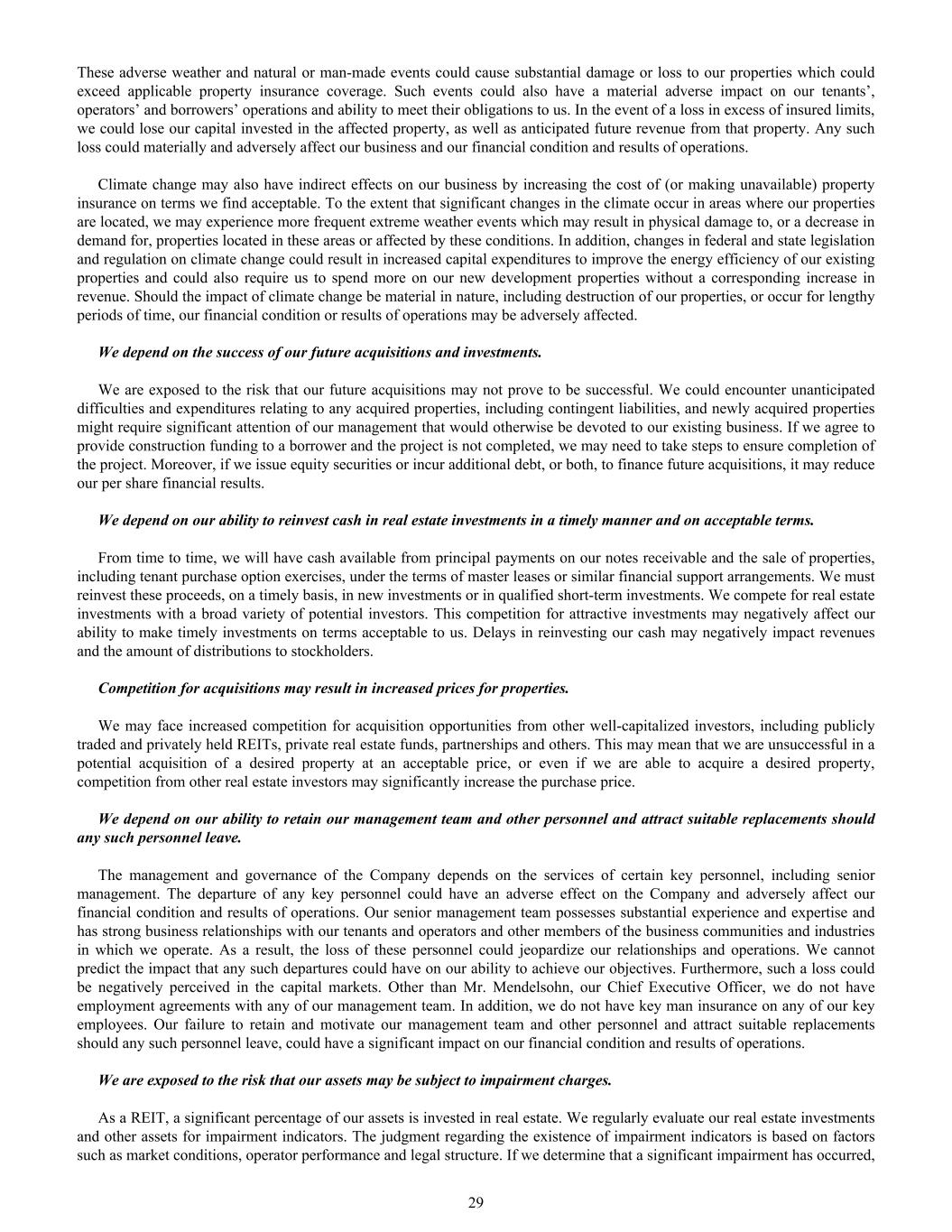 These adverse weather and natural or man-made events could cause substantial damage or loss to our properties which could exceed applicable property insurance coverage. Such events could also have a material adverse impact on our tenants’, operators’ and borrowers’ operations and ability to meet their obligations to us. In the event of a loss in excess of insured limits, we could lose our capital invested in the affected property, as well as anticipated future revenue from that property. Any such loss could materially and adversely affect our business and our financial condition and results of operations. Climate change may also have indirect effects on our business by increasing the cost of (or making unavailable) property insurance on terms we find acceptable. To the extent that significant changes in the climate occur in areas where our properties are located, we may experience more frequent extreme weather events which may result in physical damage to, or a decrease in demand for, properties located in these areas or affected by these conditions. In addition, changes in federal and state legislation and regulation on climate change could result in increased capital expenditures to improve the energy efficiency of our existing properties and could also require us to spend more on our new development properties without a corresponding increase in revenue. Should the impact of climate change be material in nature, including destruction of our properties, or occur for lengthy periods of time, our financial condition or results of operations may be adversely affected. We depend on the success of our future acquisitions and investments. We are exposed to the risk that our future acquisitions may not prove to be successful. We could encounter unanticipated difficulties and expenditures relating to any acquired properties, including contingent liabilities, and newly acquired properties might require significant attention of our management that would otherwise be devoted to our existing business. If we agree to provide construction funding to a borrower and the project is not completed, we may need to take steps to ensure completion of the project. Moreover, if we issue equity securities or incur additional debt, or both, to finance future acquisitions, it may reduce our per share financial results. We depend on our ability to reinvest cash in real estate investments in a timely manner and on acceptable terms. From time to time, we will have cash available from principal payments on our notes receivable and the sale of properties, including tenant purchase option exercises, under the terms of master leases or similar financial support arrangements. We must reinvest these proceeds, on a timely basis, in new investments or in qualified short-term investments. We compete for real estate investments with a broad variety of potential investors. This competition for attractive investments may negatively affect our ability to make timely investments on terms acceptable to us. Delays in reinvesting our cash may negatively impact revenues and the amount of distributions to stockholders. Competition for acquisitions may result in increased prices for properties. We may face increased competition for acquisition opportunities from other well-capitalized investors, including publicly traded and privately held REITs, private real estate funds, partnerships and others. This may mean that we are unsuccessful in a potential acquisition of a desired property at an acceptable price, or even if we are able to acquire a desired property, competition from other real estate investors may significantly increase the purchase price. We depend on our ability to retain our management team and other personnel and attract suitable replacements should any such personnel leave. The management and governance of the Company depends on the services of certain key personnel, including senior management. The departure of any key personnel could have an adverse effect on the Company and adversely affect our financial condition and results of operations. Our senior management team possesses substantial experience and expertise and has strong business relationships with our tenants and operators and other members of the business communities and industries in which we operate. As a result, the loss of these personnel could jeopardize our relationships and operations. We cannot predict the impact that any such departures could have on our ability to achieve our objectives. Furthermore, such a loss could be negatively perceived in the capital markets. Other than Mr. Mendelsohn, our Chief Executive Officer, we do not have employment agreements with any of our management team. In addition, we do not have key man insurance on any of our key employees. Our failure to retain and motivate our management team and other personnel and attract suitable replacements should any such personnel leave, could have a significant impact on our financial condition and results of operations. We are exposed to the risk that our assets may be subject to impairment charges. As a REIT, a significant percentage of our assets is invested in real estate. We regularly evaluate our real estate investments and other assets for impairment indicators. The judgment regarding the existence of impairment indicators is based on factors such as market conditions, operator performance and legal structure. If we determine that a significant impairment has occurred, 29