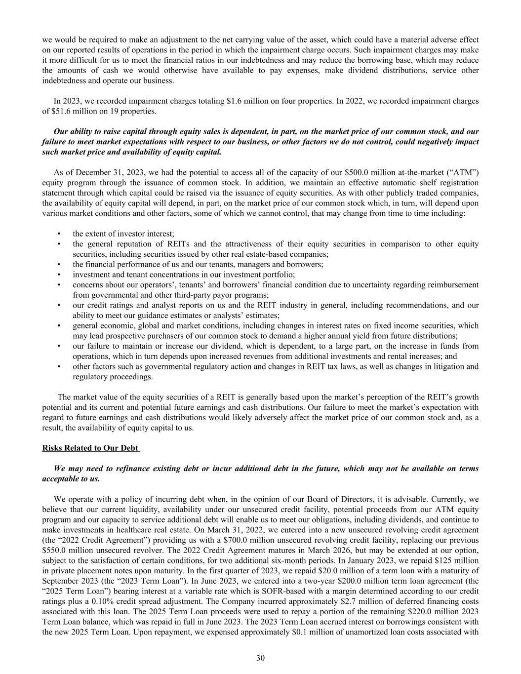 we would be required to make an adjustment to the net carrying value of the asset, which could have a material adverse effect on our reported results of operations in the period in which the impairment charge occurs. Such impairment charges may make it more difficult for us to meet the financial ratios in our indebtedness and may reduce the borrowing base, which may reduce the amounts of cash we would otherwise have available to pay expenses, make dividend distributions, service other indebtedness and operate our business. In 2023, we recorded impairment charges totaling $1.6 million on four properties. In 2022, we recorded impairment charges of $51.6 million on 19 properties. Our ability to raise capital through equity sales is dependent, in part, on the market price of our common stock, and our failure to meet market expectations with respect to our business, or other factors we do not control, could negatively impact such market price and availability of equity capital. As of December 31, 2023, we had the potential to access all of the capacity of our $500.0 million at-the-market (“ATM”) equity program through the issuance of common stock. In addition, we maintain an effective automatic shelf registration statement through which capital could be raised via the issuance of equity securities. As with other publicly traded companies, the availability of equity capital will depend, in part, on the market price of our common stock which, in turn, will depend upon various market conditions and other factors, some of which we cannot control, that may change from time to time including: • the extent of investor interest; • the general reputation of REITs and the attractiveness of their equity securities in comparison to other equity securities, including securities issued by other real estate-based companies; • the financial performance of us and our tenants, managers and borrowers; • investment and tenant concentrations in our investment portfolio; • concerns about our operators’, tenants’ and borrowers’ financial condition due to uncertainty regarding reimbursement from governmental and other third-party payor programs; • our credit ratings and analyst reports on us and the REIT industry in general, including recommendations, and our ability to meet our guidance estimates or analysts’ estimates; • general economic, global and market conditions, including changes in interest rates on fixed income securities, which may lead prospective purchasers of our common stock to demand a higher annual yield from future distributions; • our failure to maintain or increase our dividend, which is dependent, to a large part, on the increase in funds from operations, which in turn depends upon increased revenues from additional investments and rental increases; and • other factors such as governmental regulatory action and changes in REIT tax laws, as well as changes in litigation and regulatory proceedings. The market value of the equity securities of a REIT is generally based upon the market’s perception of the REIT’s growth potential and its current and potential future earnings and cash distributions. Our failure to meet the market’s expectation with regard to future earnings and cash distributions would likely adversely affect the market price of our common stock and, as a result, the availability of equity capital to us. Risks Related to Our Debt We may need to refinance existing debt or incur additional debt in the future, which may not be available on terms acceptable to us. We operate with a policy of incurring debt when, in the opinion of our Board of Directors, it is advisable. Currently, we believe that our current liquidity, availability under our unsecured credit facility, potential proceeds from our ATM equity program and our capacity to service additional debt will enable us to meet our obligations, including dividends, and continue to make investments in healthcare real estate. On March 31, 2022, we entered into a new unsecured revolving credit agreement (the “2022 Credit Agreement”) providing us with a $700.0 million unsecured revolving credit facility, replacing our previous $550.0 million unsecured revolver. The 2022 Credit Agreement matures in March 2026, but may be extended at our option, subject to the satisfaction of certain conditions, for two additional six-month periods. In January 2023, we repaid $125 million in private placement notes upon maturity. In the first quarter of 2023, we repaid $20.0 million of a term loan with a maturity of September 2023 (the “2023 Term Loan”). In June 2023, we entered into a two-year $200.0 million term loan agreement (the “2025 Term Loan”) bearing interest at a variable rate which is SOFR-based with a margin determined according to our credit ratings plus a 0.10% credit spread adjustment. The Company incurred approximately $2.7 million of deferred financing costs associated with this loan. The 2025 Term Loan proceeds were used to repay a portion of the remaining $220.0 million 2023 Term Loan balance, which was repaid in full in June 2023. The 2023 Term Loan accrued interest on borrowings consistent with the new 2025 Term Loan. Upon repayment, we expensed approximately $0.1 million of unamortized loan costs associated with 30