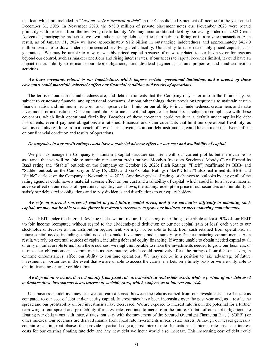 this loan which are included in “Loss on early retirement of debt” in our Consolidated Statement of Income for the year ended December 31, 2023. In November 2023, the $50.0 million of private placement notes due November 2023 were repaid primarily with proceeds from the revolving credit facility. We may incur additional debt by borrowing under our 2022 Credit Agreement, mortgaging properties we own and/or issuing debt securities in a public offering or in a private transaction. As a result, as of January 31, 2024 we have approximately $1.2 billion in outstanding indebtedness and approximately $427.0 million available to draw under our unsecured revolving credit facility. Our ability to raise reasonably priced capital is not guaranteed. We may be unable to raise reasonably priced capital because of reasons related to our business or for reasons beyond our control, such as market conditions and rising interest rates. If our access to capital becomes limited, it could have an impact on our ability to refinance our debt obligations, fund dividend payments, acquire properties and fund acquisition activities. We have covenants related to our indebtedness which impose certain operational limitations and a breach of those covenants could materially adversely affect our financial condition and results of operations. The terms of our current indebtedness are, and debt instruments that the Company may enter into in the future may be, subject to customary financial and operational covenants. Among other things, these provisions require us to maintain certain financial ratios and minimum net worth and impose certain limits on our ability to incur indebtedness, create liens and make investments or acquisitions. Our continued ability to incur debt and operate our business is subject to compliance with these covenants, which limit operational flexibility. Breaches of these covenants could result in a default under applicable debt instruments, even if payment obligations are satisfied. Financial and other covenants that limit our operational flexibility, as well as defaults resulting from a breach of any of these covenants in our debt instruments, could have a material adverse effect on our financial condition and results of operations. Downgrades in our credit ratings could have a material adverse effect on our cost and availability of capital. We plan to manage the Company to maintain a capital structure consistent with our current profile, but there can be no assurance that we will be able to maintain our current credit ratings. Moody's Investors Services (“Moody's”) reaffirmed its Baa3 rating and “Stable” outlook on the Company on October 16, 2023; Fitch Ratings (“Fitch”) reaffirmed its BBB- and “Stable” outlook on the Company on May 15, 2023; and S&P Global Ratings (“S&P Global”) also reaffirmed its BBB- and “Stable” outlook on the Company at November 14, 2023. Any downgrades of ratings or changes to outlooks by any or all of the rating agencies could have a material adverse effect on our cost and availability of capital, which could in turn have a material adverse effect on our results of operations, liquidity, cash flows, the trading/redemption price of our securities and our ability to satisfy our debt service obligations and to pay dividends and distributions to our equity holders. We rely on external sources of capital to fund future capital needs, and if we encounter difficulty in obtaining such capital, we may not be able to make future investments necessary to grow our business or meet maturing commitments. As a REIT under the Internal Revenue Code, we are required to, among other things, distribute at least 90% of our REIT taxable income (computed without regard to the dividends-paid deduction or our net capital gain or loss) each year to our stockholders. Because of this distribution requirement, we may not be able to fund, from cash retained from operations, all future capital needs, including capital needed to make investments and to satisfy or refinance maturing commitments. As a result, we rely on external sources of capital, including debt and equity financing. If we are unable to obtain needed capital at all or only on unfavorable terms from these sources, we might not be able to make the investments needed to grow our business, or to meet our obligations and commitments as they mature, which could negatively affect the ratings of our debt and even, in extreme circumstances, affect our ability to continue operations. We may not be in a position to take advantage of future investment opportunities in the event that we are unable to access the capital markets on a timely basis or we are only able to obtain financing on unfavorable terms. We depend on revenues derived mainly from fixed rate investments in real estate assets, while a portion of our debt used to finance those investments bears interest at variable rates, which subjects us to interest rate risk. Our business model assumes that we can earn a spread between the returns earned from our investments in real estate as compared to our cost of debt and/or equity capital. Interest rates have been increasing over the past year and, as a result, the spread and our profitability on our investments have decreased. We are exposed to interest rate risk in the potential for a further narrowing of our spread and profitability if interest rates continue to increase in the future. Certain of our debt obligations are floating rate obligations with interest rates that vary with the movement of the Secured Overnight Financing Rate (“SOFR”) or other indexes. Our revenues are derived mainly from fixed rate investments in real estate assets. Although our leases generally contain escalating rent clauses that provide a partial hedge against interest rate fluctuations, if interest rates rise, our interest costs for our existing floating rate debt and any new debt we incur would also increase. This increasing cost of de