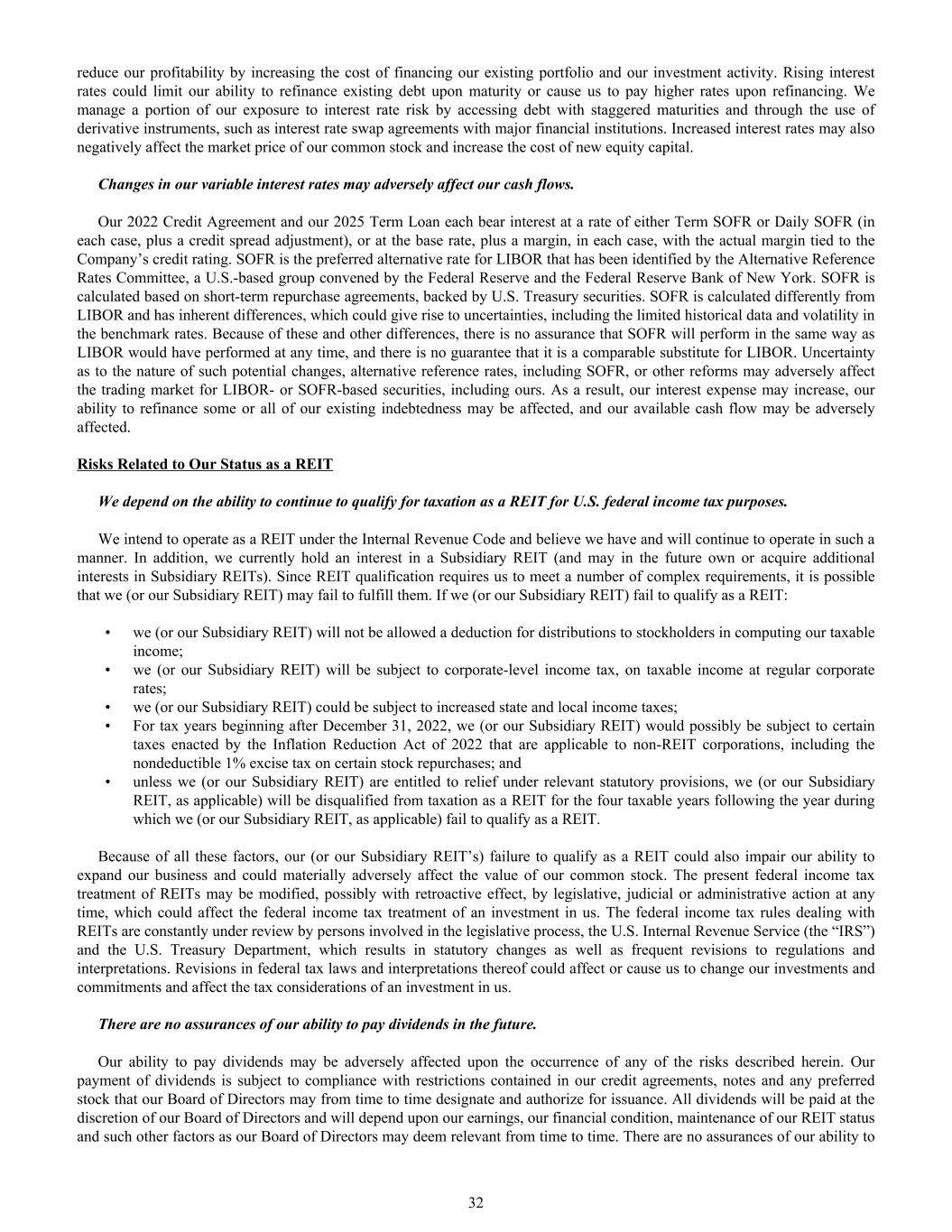 reduce our profitability by increasing the cost of financing our existing portfolio and our investment activity. Rising interest rates could limit our ability to refinance existing debt upon maturity or cause us to pay higher rates upon refinancing. We manage a portion of our exposure to interest rate risk by accessing debt with staggered maturities and through the use of derivative instruments, such as interest rate swap agreements with major financial institutions. Increased interest rates may also negatively affect the market price of our common stock and increase the cost of new equity capital. Changes in our variable interest rates may adversely affect our cash flows. Our 2022 Credit Agreement and our 2025 Term Loan each bear interest at a rate of either Term SOFR or Daily SOFR (in each case, plus a credit spread adjustment), or at the base rate, plus a margin, in each case, with the actual margin tied to the Company’s credit rating. SOFR is the preferred alternative rate for LIBOR that has been identified by the Alternative Reference Rates Committee, a U.S.-based group convened by the Federal Reserve and the Federal Reserve Bank of New York. SOFR is calculated based on short-term repurchase agreements, backed by U.S. Treasury securities. SOFR is calculated differently from LIBOR and has inherent differences, which could give rise to uncertainties, including the limited historical data and volatility in the benchmark rates. Because of these and other differences, there is no assurance that SOFR will perform in the same way as LIBOR would have performed at any time, and there is no guarantee that it is a comparable substitute for LIBOR. Uncertainty as to the nature of such potential changes, alternative reference rates, including SOFR, or other reforms may adversely affect the trading market for LIBOR- or SOFR-based securities, including ours. As a result, our interest expense may increase, our ability to refinance some or all of our existing indebtedness may be affected, and our available cash flow may be adversely affected. Risks Related to Our Status as a REIT We depend on the ability to continue to qualify for taxation as a REIT for U.S. federal income tax purposes. We intend to operate as a REIT under the Internal Revenue Code and believe we have and will continue to operate in such a manner. In addition, we currently hold an interest in a Subsidiary REIT (and may in the future own or acquire additional interests in Subsidiary REITs). Since REIT qualification requires us to meet a number of complex requirements, it is possible that we (or our Subsidiary REIT) may fail to fulfill them. If we (or our Subsidiary REIT) fail to qualify as a REIT: • we (or our Subsidiary REIT) will not be allowed a deduction for distributions to stockholders in computing our taxable income; • we (or our Subsidiary REIT) will be subject to corporate-level income tax, on taxable income at regular corporate rates; • we (or our Subsidiary REIT) could be subject to increased state and local income taxes; • For tax years beginning after December 31, 2022, we (or our Subsidiary REIT) would possibly be subject to certain taxes enacted by the Inflation Reduction Act of 2022 that are applicable to non-REIT corporations, including the nondeductible 1% excise tax on certain stock repurchases; and • unless we (or our Subsidiary REIT) are entitled to relief under relevant statutory provisions, we (or our Subsidiary REIT, as applicable) will be disqualified from taxation as a REIT for the four taxable years following the year during which we (or our Subsidiary REIT, as applicable) fail to qualify as a REIT. Because of all these factors, our (or our Subsidiary REIT’s) failure to qualify as a REIT could also impair our ability to expand our business and could materially adversely affect the value of our common stock. The present federal income tax treatment of REITs may be modified, possibly with retroactive effect, by legislative, judicial or administrative action at any time, which could affect the federal income tax treatment of an investment in us. The federal income tax rules dealing with REITs are constantly under review by persons involved in the legislative process, the U.S. Internal Revenue Service (the “IRS”) and the U.S. Treasury Department, which results in statutory changes as well as frequent revisions to regulations and interpretations. Revisions in federal tax laws and interpretations thereof could affect or cause us to change our investments and commitments and affect the tax considerations of an investment in us. There are no assurances of our ability to pay dividends in the future. Our ability to pay dividends may be adversely affected upon the occurrence of any of the risks described herein. Our payment of dividends is subject to compliance with restrictions contained in our credit agreements, notes and any preferred stock that our Board of Directors may from time to time designate and authorize for issuance. All dividends will be paid at the discretion of our Board of Directors and will depend upon our earnings, our financial condition, maintenance of our REIT status and such other factors as our Board of Directors may deem relevant from time to time. There are no assurances of our ability to 32