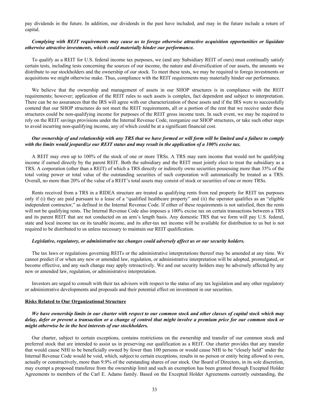 pay dividends in the future. In addition, our dividends in the past have included, and may in the future include a return of capital. Complying with REIT requirements may cause us to forego otherwise attractive acquisition opportunities or liquidate otherwise attractive investments, which could materially hinder our performance. To qualify as a REIT for U.S. federal income tax purposes, we (and any Subsidiary REIT of ours) must continually satisfy certain tests, including tests concerning the sources of our income, the nature and diversification of our assets, the amounts we distribute to our stockholders and the ownership of our stock. To meet these tests, we may be required to forego investments or acquisitions we might otherwise make. Thus, compliance with the REIT requirements may materially hinder our performance. We believe that the ownership and management of assets in our SHOP structures is in compliance with the REIT requirements; however; application of the REIT rules to such assets is complex, fact dependent and subject to interpretation. There can be no assurances that the IRS will agree with our characterization of these assets and if the IRS were to successfully contend that our SHOP structures do not meet the REIT requirements, all or a portion of the rent that we receive under these structures could be non-qualifying income for purposes of the REIT gross income tests. In such event, we may be required to rely on the REIT savings provisions under the Internal Revenue Code, reorganize our SHOP structures, or take such other steps to avoid incurring non-qualifying income, any of which could be at a significant financial cost. Our ownership of and relationship with any TRS that we have formed or will form will be limited and a failure to comply with the limits would jeopardize our REIT status and may result in the application of a 100% excise tax. A REIT may own up to 100% of the stock of one or more TRSs. A TRS may earn income that would not be qualifying income if earned directly by the parent REIT. Both the subsidiary and the REIT must jointly elect to treat the subsidiary as a TRS. A corporation (other than a REIT) of which a TRS directly or indirectly owns securities possessing more than 35% of the total voting power or total value of the outstanding securities of such corporation will automatically be treated as a TRS. Overall, no more than 20% of the value of a REIT’s total assets may consist of stock or securities of one or more TRSs. Rents received from a TRS in a RIDEA structure are treated as qualifying rents from real property for REIT tax purposes only if (i) they are paid pursuant to a lease of a “qualified healthcare property” and (ii) the operator qualifies as an “eligible independent contractor,” as defined in the Internal Revenue Code. If either of these requirements is not satisfied, then the rents will not be qualifying rents. The Internal Revenue Code also imposes a 100% excise tax on certain transactions between a TRS and its parent REIT that are not conducted on an arm’s length basis. Any domestic TRS that we form will pay U.S. federal, state and local income tax on its taxable income, and its after-tax net income will be available for distribution to us but is not required to be distributed to us unless necessary to maintain our REIT qualification. Legislative, regulatory, or administrative tax changes could adversely affect us or our security holders. The tax laws or regulations governing REITs or the administrative interpretations thereof may be amended at any time. We cannot predict if or when any new or amended law, regulation, or administrative interpretation will be adopted, promulgated, or become effective, and any such change may apply retroactively. We and our security holders may be adversely affected by any new or amended law, regulation, or administrative interpretation. Investors are urged to consult with their tax advisors with respect to the status of any tax legislation and any other regulatory or administrative developments and proposals and their potential effect on investment in our securities. Risks Related to Our Organizational Structure We have ownership limits in our charter with respect to our common stock and other classes of capital stock which may delay, defer or prevent a transaction or a change of control that might involve a premium price for our common stock or might otherwise be in the best interests of our stockholders. Our charter, subject to certain exceptions, contains restrictions on the ownership and transfer of our common stock and preferred stock that are intended to assist us in preserving our qualification as a REIT. Our charter provides that any transfer that would cause NHI to be beneficially owned by fewer than 100 persons or would cause NHI to be “closely held” under the Internal Revenue Code would be void, which, subject to certain exceptions, results in no person or entity being allowed to own, actually or constructively, more than 9.9% of the outstanding shares of our stock. Our Board of Directors, in its sole discretion, may exempt a proposed transferee from the ownership limit and such an exemption has been granted through Excepted Holder Agreements to members of the Carl E. Adams family. Based on the Excepted Holder Agreements currently outstanding, the 33