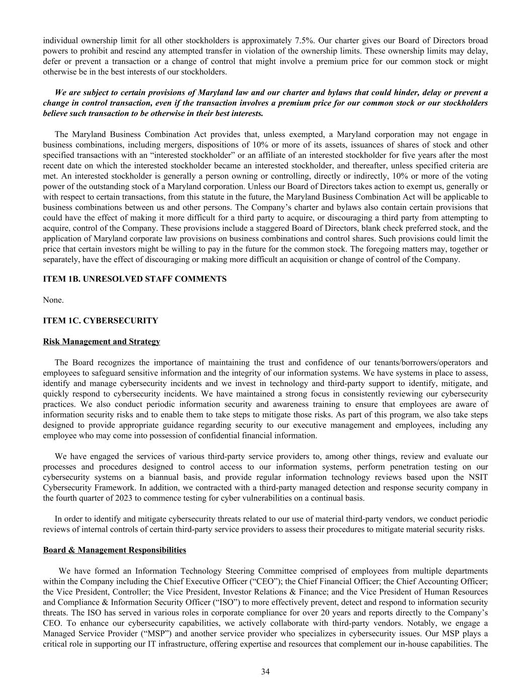 individual ownership limit for all other stockholders is approximately 7.5%. Our charter gives our Board of Directors broad powers to prohibit and rescind any attempted transfer in violation of the ownership limits. These ownership limits may delay, defer or prevent a transaction or a change of control that might involve a premium price for our common stock or might otherwise be in the best interests of our stockholders. We are subject to certain provisions of Maryland law and our charter and bylaws that could hinder, delay or prevent a change in control transaction, even if the transaction involves a premium price for our common stock or our stockholders believe such transaction to be otherwise in their best interests. The Maryland Business Combination Act provides that, unless exempted, a Maryland corporation may not engage in business combinations, including mergers, dispositions of 10% or more of its assets, issuances of shares of stock and other specified transactions with an “interested stockholder” or an affiliate of an interested stockholder for five years after the most recent date on which the interested stockholder became an interested stockholder, and thereafter, unless specified criteria are met. An interested stockholder is generally a person owning or controlling, directly or indirectly, 10% or more of the voting power of the outstanding stock of a Maryland corporation. Unless our Board of Directors takes action to exempt us, generally or with respect to certain transactions, from this statute in the future, the Maryland Business Combination Act will be applicable to business combinations between us and other persons. The Company’s charter and bylaws also contain certain provisions that could have the effect of making it more difficult for a third party to acquire, or discouraging a third party from attempting to acquire, control of the Company. These provisions include a staggered Board of Directors, blank check preferred stock, and the application of Maryland corporate law provisions on business combinations and control shares. Such provisions could limit the price that certain investors might be willing to pay in the future for the common stock. The foregoing matters may, together or separately, have the effect of discouraging or making more difficult an acquisition or change of control of the Company. ITEM 1B. UNRESOLVED STAFF COMMENTS None. ITEM 1C. CYBERSECURITY Risk Management and Strategy The Board recognizes the importance of maintaining the trust and confidence of our tenants/borrowers/operators and employees to safeguard sensitive information and the integrity of our information systems. We have systems in place to assess, identify and manage cybersecurity incidents and we invest in technology and third-party support to identify, mitigate, and quickly respond to cybersecurity incidents. We have maintained a strong focus in consistently reviewing our cybersecurity practices. We also conduct periodic information security and awareness training to ensure that employees are aware of information security risks and to enable them to take steps to mitigate those risks. As part of this program, we also take steps designed to provide appropriate guidance regarding security to our executive management and employees, including any employee who may come into possession of confidential financial information. We have engaged the services of various third-party service providers to, among other things, review and evaluate our processes and procedures designed to control access to our information systems, perform penetration testing on our cybersecurity systems on a biannual basis, and provide regular information technology reviews based upon the NSIT Cybersecurity Framework. In addition, we contracted with a third-party managed detection and response security company in the fourth quarter of 2023 to commence testing for cyber vulnerabilities on a continual basis. In order to identify and mitigate cybersecurity threats related to our use of material third-party vendors, we conduct periodic reviews of internal controls of certain third-party service providers to assess their procedures to mitigate material security risks. Board & Management Responsibilities We have formed an Information Technology Steering Committee comprised of employees from multiple departments within the Company including the Chief Executive Officer (“CEO”); the Chief Financial Officer; the Chief Accounting Officer; the Vice President, Controller; the Vice President, Investor Relations & Finance; and the Vice President of Human Resources and Compliance & Information Security Officer (“ISO”) to more effectively prevent, detect and respond to information security threats. The ISO has served in various roles in corporate compliance for over 20 years and reports directly to the Company’s CEO. To enhance our cybersecurity capabilities, we actively collaborate with third-party vendors. Notably, we engage a Managed Service Provider (“MSP”) and another service provider who specializes in cybersecurity issues. Our MSP plays a critical role in supporting our IT infrastructure, offering expertise and resources that complement our in-house capabilities. The 34