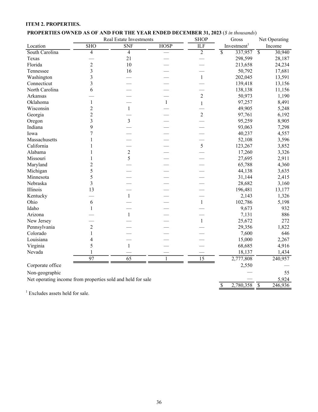ITEM 2. PROPERTIES. PROPERTIES OWNED AS OF AND FOR THE YEAR ENDED DECEMBER 31, 2023 ($ in thousands) Real Estate Investments SHOP Gross Net Operating Location SHO SNF HOSP ILF Investment1 Income South Carolina 4 4 — 2 $ 337,957 $ 30,940 Texas — 21 — — 298,599 28,187 Florida 2 10 — — 213,658 24,234 Tennessee 3 16 — — 50,792 17,681 Washington 3 — — 1 202,045 13,591 Connecticut 3 — — — 139,418 13,156 North Carolina 6 — — — 138,138 11,156 Arkansas — — — 2 50,973 1,190 Oklahoma 1 — 1 1 97,257 8,491 Wisconsin 2 1 — — 49,905 5,248 Georgia 2 — — 2 97,761 6,192 Oregon 3 3 — — 95,259 8,905 Indiana 9 — — — 93,063 7,298 Iowa 7 — — — 40,237 4,557 Massachusetts 1 — — — 52,108 3,596 California 1 — — 5 123,267 3,852 Alabama 1 2 — — 17,260 3,326 Missouri 1 5 — — 27,695 2,911 Maryland 2 — — — 65,788 4,360 Michigan 5 — — — 44,138 3,635 Minnesota 5 — — — 31,144 2,415 Nebraska 3 — — — 28,682 3,160 Illinois 13 — — — 196,481 13,177 Kentucky — 1 — — 2,143 1,326 Ohio 6 — — 1 102,786 5,198 Idaho 1 — — — 9,673 932 Arizona — 1 — — 7,131 886 New Jersey — — — 1 25,672 272 Pennsylvania 2 — — — 29,356 1,822 Colorado 1 — — — 7,600 646 Louisiana 4 — — — 15,000 2,267 Virginia 5 1 — — 68,685 4,916 Nevada 1 — — — 18,137 1,434 97 65 1 15 2,777,808 240,957 Corporate office 2,550 — Non-geographic — 55 Net operating income from properties sold and held for sale — 5,924 $ 2,780,358 $ 246,936 1 Excludes assets held for sale. 36