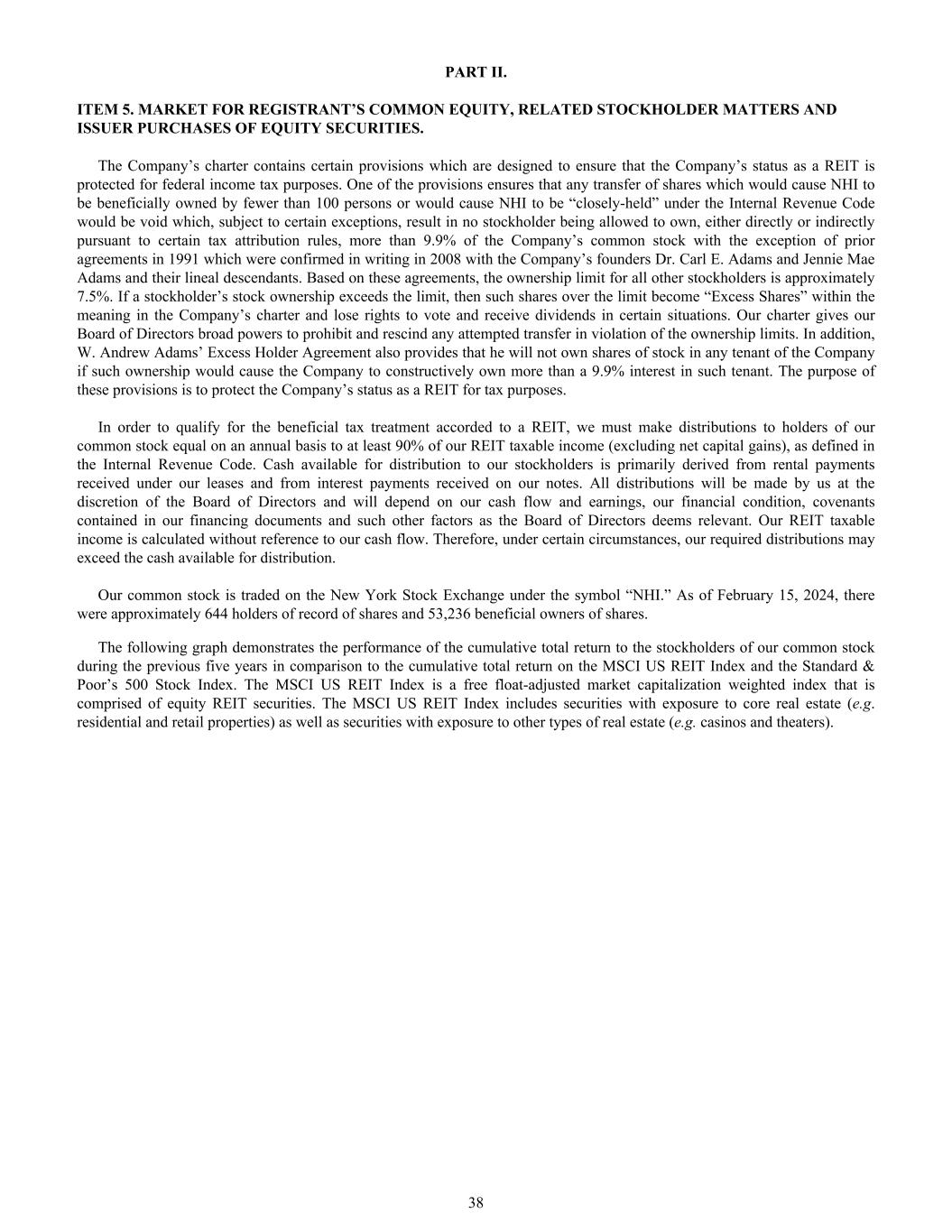PART II. ITEM 5. MARKET FOR REGISTRANT’S COMMON EQUITY, RELATED STOCKHOLDER MATTERS AND ISSUER PURCHASES OF EQUITY SECURITIES. The Company’s charter contains certain provisions which are designed to ensure that the Company’s status as a REIT is protected for federal income tax purposes. One of the provisions ensures that any transfer of shares which would cause NHI to be beneficially owned by fewer than 100 persons or would cause NHI to be “closely-held” under the Internal Revenue Code would be void which, subject to certain exceptions, result in no stockholder being allowed to own, either directly or indirectly pursuant to certain tax attribution rules, more than 9.9% of the Company’s common stock with the exception of prior agreements in 1991 which were confirmed in writing in 2008 with the Company’s founders Dr. Carl E. Adams and Jennie Mae Adams and their lineal descendants. Based on these agreements, the ownership limit for all other stockholders is approximately 7.5%. If a stockholder’s stock ownership exceeds the limit, then such shares over the limit become “Excess Shares” within the meaning in the Company’s charter and lose rights to vote and receive dividends in certain situations. Our charter gives our Board of Directors broad powers to prohibit and rescind any attempted transfer in violation of the ownership limits. In addition, W. Andrew Adams’ Excess Holder Agreement also provides that he will not own shares of stock in any tenant of the Company if such ownership would cause the Company to constructively own more than a 9.9% interest in such tenant. The purpose of these provisions is to protect the Company’s status as a REIT for tax purposes. In order to qualify for the beneficial tax treatment accorded to a REIT, we must make distributions to holders of our common stock equal on an annual basis to at least 90% of our REIT taxable income (excluding net capital gains), as defined in the Internal Revenue Code. Cash available for distribution to our stockholders is primarily derived from rental payments received under our leases and from interest payments received on our notes. All distributions will be made by us at the discretion of the Board of Directors and will depend on our cash flow and earnings, our financial condition, covenants contained in our financing documents and such other factors as the Board of Directors deems relevant. Our REIT taxable income is calculated without reference to our cash flow. Therefore, under certain circumstances, our required distributions may exceed the cash available for distribution. Our common stock is traded on the New York Stock Exchange under the symbol “NHI.” As of February 15, 2024, there were approximately 644 holders of record of shares and 53,236 beneficial owners of shares. The following graph demonstrates the performance of the cumulative total return to the stockholders of our common stock during the previous five years in comparison to the cumulative total return on the MSCI US REIT Index and the Standard & Poor’s 500 Stock Index. The MSCI US REIT Index is a free float-adjusted market capitalization weighted index that is comprised of equity REIT securities. The MSCI US REIT Index includes securities with exposure to core real estate (e.g. residential and retail properties) as well as securities with exposure to other types of real estate (e.g. casinos and theaters). 38