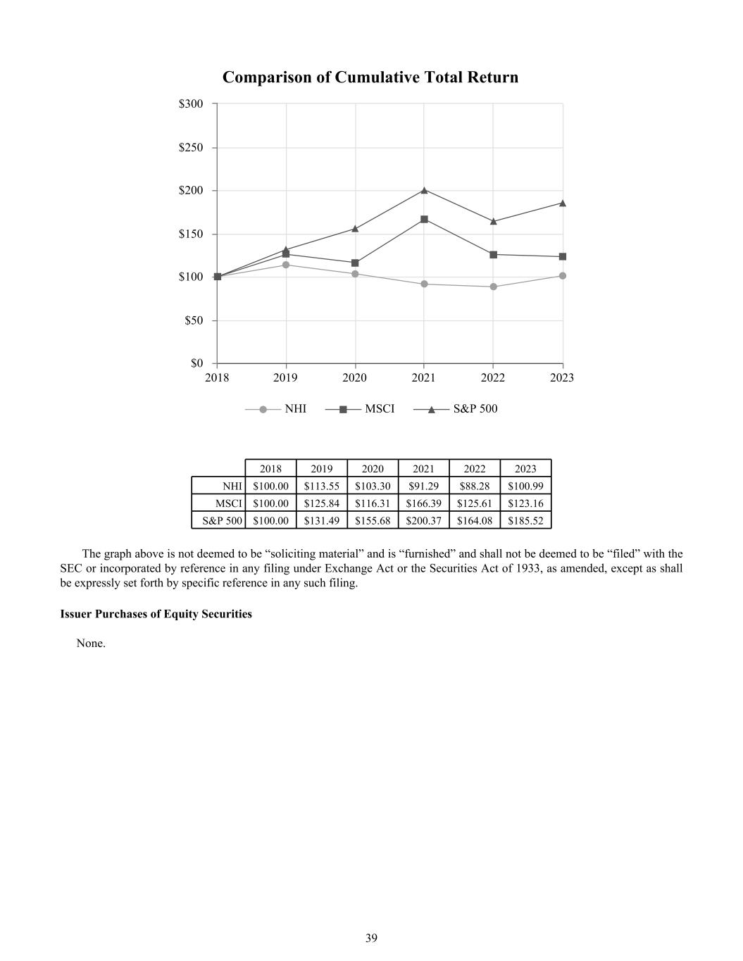 Comparison of Cumulative Total Return NHI MSCI S&P 500 2018 2019 2020 2021 2022 2023 $0 $50 $100 $150 $200 $250 $300 2018 2019 2020 2021 2022 2023 NHI $100.00 $113.55 $103.30 $91.29 $88.28 $100.99 MSCI $100.00 $125.84 $116.31 $166.39 $125.61 $123.16 S&P 500 $100.00 $131.49 $155.68 $200.37 $164.08 $185.52 The graph above is not deemed to be “soliciting material” and is “furnished” and shall not be deemed to be “filed” with the SEC or incorporated by reference in any filing under Exchange Act or the Securities Act of 1933, as amended, except as shall be expressly set forth by specific reference in any such filing. Issuer Purchases of Equity Securities None. 39