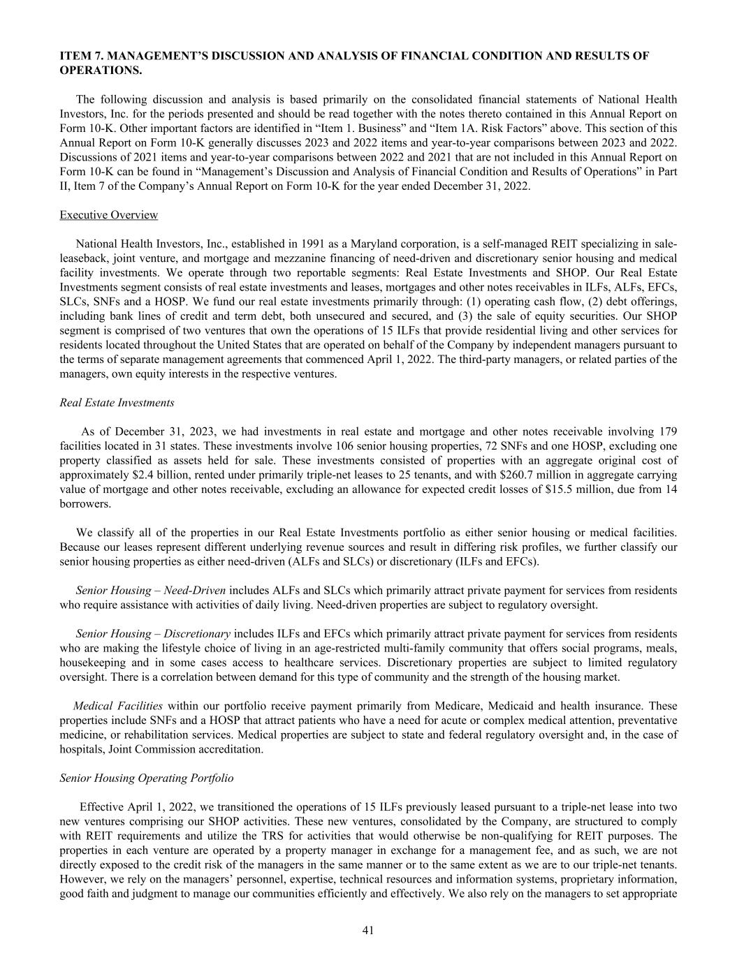 ITEM 7. MANAGEMENT’S DISCUSSION AND ANALYSIS OF FINANCIAL CONDITION AND RESULTS OF OPERATIONS. The following discussion and analysis is based primarily on the consolidated financial statements of National Health Investors, Inc. for the periods presented and should be read together with the notes thereto contained in this Annual Report on Form 10-K. Other important factors are identified in “Item 1. Business” and “Item 1A. Risk Factors” above. This section of this Annual Report on Form 10-K generally discusses 2023 and 2022 items and year-to-year comparisons between 2023 and 2022. Discussions of 2021 items and year-to-year comparisons between 2022 and 2021 that are not included in this Annual Report on Form 10-K can be found in “Management’s Discussion and Analysis of Financial Condition and Results of Operations” in Part II, Item 7 of the Company’s Annual Report on Form 10-K for the year ended December 31, 2022. Executive Overview National Health Investors, Inc., established in 1991 as a Maryland corporation, is a self-managed REIT specializing in sale- leaseback, joint venture, and mortgage and mezzanine financing of need-driven and discretionary senior housing and medical facility investments. We operate through two reportable segments: Real Estate Investments and SHOP. Our Real Estate Investments segment consists of real estate investments and leases, mortgages and other notes receivables in ILFs, ALFs, EFCs, SLCs, SNFs and a HOSP. We fund our real estate investments primarily through: (1) operating cash flow, (2) debt offerings, including bank lines of credit and term debt, both unsecured and secured, and (3) the sale of equity securities. Our SHOP segment is comprised of two ventures that own the operations of 15 ILFs that provide residential living and other services for residents located throughout the United States that are operated on behalf of the Company by independent managers pursuant to the terms of separate management agreements that commenced April 1, 2022. The third-party managers, or related parties of the managers, own equity interests in the respective ventures. Real Estate Investments As of December 31, 2023, we had investments in real estate and mortgage and other notes receivable involving 179 facilities located in 31 states. These investments involve 106 senior housing properties, 72 SNFs and one HOSP, excluding one property classified as assets held for sale. These investments consisted of properties with an aggregate original cost of approximately $2.4 billion, rented under primarily triple-net leases to 25 tenants, and with $260.7 million in aggregate carrying value of mortgage and other notes receivable, excluding an allowance for expected credit losses of $15.5 million, due from 14 borrowers. We classify all of the properties in our Real Estate Investments portfolio as either senior housing or medical facilities. Because our leases represent different underlying revenue sources and result in differing risk profiles, we further classify our senior housing properties as either need-driven (ALFs and SLCs) or discretionary (ILFs and EFCs). Senior Housing – Need-Driven includes ALFs and SLCs which primarily attract private payment for services from residents who require assistance with activities of daily living. Need-driven properties are subject to regulatory oversight. Senior Housing – Discretionary includes ILFs and EFCs which primarily attract private payment for services from residents who are making the lifestyle choice of living in an age-restricted multi-family community that offers social programs, meals, housekeeping and in some cases access to healthcare services. Discretionary properties are subject to limited regulatory oversight. There is a correlation between demand for this type of community and the strength of the housing market. Medical Facilities within our portfolio receive payment primarily from Medicare, Medicaid and health insurance. These properties include SNFs and a HOSP that attract patients who have a need for acute or complex medical attention, preventative medicine, or rehabilitation services. Medical properties are subject to state and federal regulatory oversight and, in the case of hospitals, Joint Commission accreditation. Senior Housing Operating Portfolio Effective April 1, 2022, we transitioned the operations of 15 ILFs previously leased pursuant to a triple-net lease into two new ventures comprising our SHOP activities. These new ventures, consolidated by the Company, are structured to comply with REIT requirements and utilize the TRS for activities that would otherwise be non-qualifying for REIT purposes. The properties in each venture are operated by a property manager in exchange for a management fee, and as such, we are not directly exposed to the credit risk of the managers in the same manner or to the same extent as we are to our triple-net tenants. However, we rely on the managers’ personnel, expertise, technical resources and information systems, proprietary information, good faith and judgment to manage our communities efficiently and effectively. We also rely on the managers to set appropriate 41
