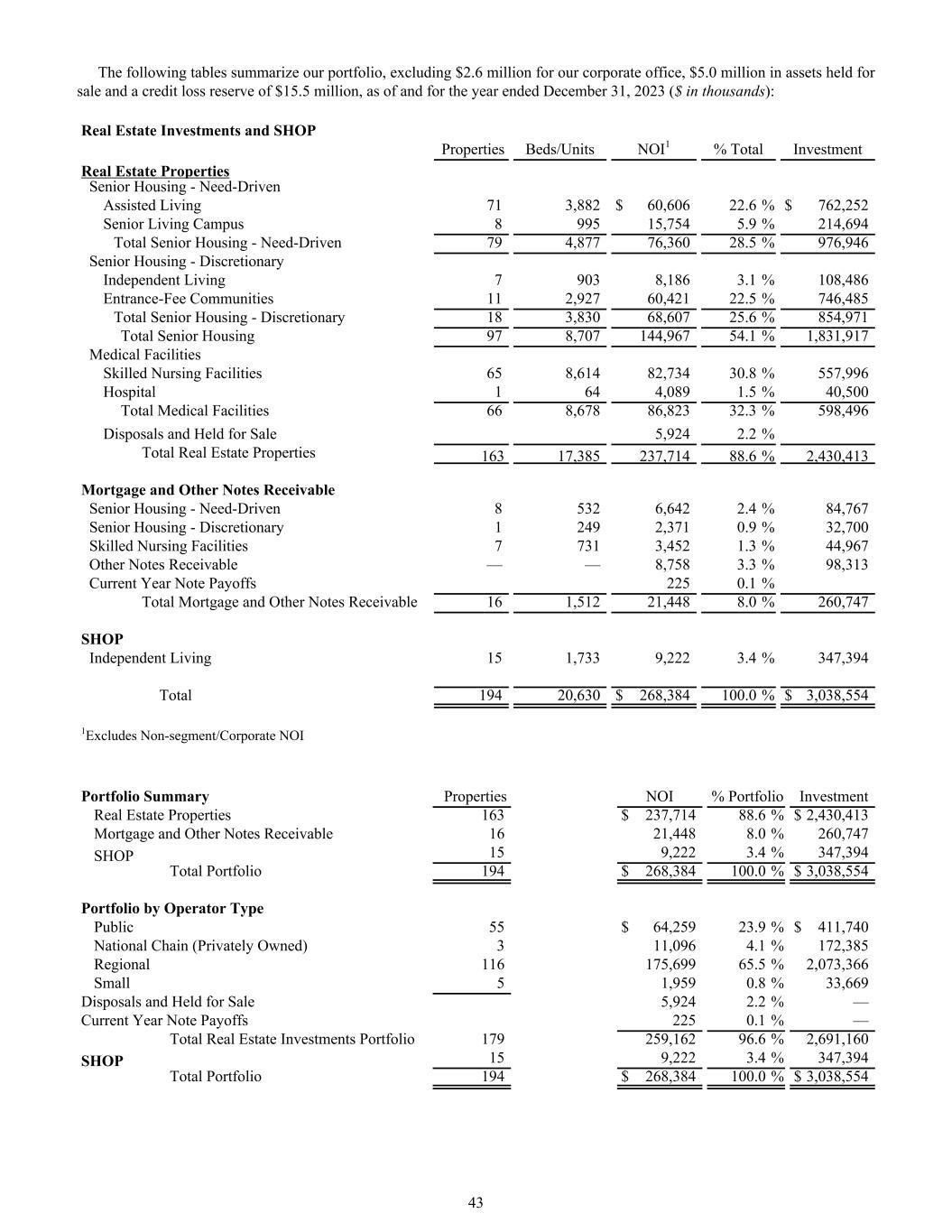 The following tables summarize our portfolio, excluding $2.6 million for our corporate office, $5.0 million in assets held for sale and a credit loss reserve of $15.5 million, as of and for the year ended December 31, 2023 ($ in thousands): Real Estate Investments and SHOP Properties Beds/Units NOI1 % Total Investment Real Estate Properties Senior Housing - Need-Driven Assisted Living 71 3,882 $ 60,606 22.6 % $ 762,252 Senior Living Campus 8 995 15,754 5.9 % 214,694 Total Senior Housing - Need-Driven 79 4,877 76,360 28.5 % 976,946 Senior Housing - Discretionary Independent Living 7 903 8,186 3.1 % 108,486 Entrance-Fee Communities 11 2,927 60,421 22.5 % 746,485 Total Senior Housing - Discretionary 18 3,830 68,607 25.6 % 854,971 Total Senior Housing 97 8,707 144,967 54.1 % 1,831,917 Medical Facilities Skilled Nursing Facilities 65 8,614 82,734 30.8 % 557,996 Hospital 1 64 4,089 1.5 % 40,500 Total Medical Facilities 66 8,678 86,823 32.3 % 598,496 Disposals and Held for Sale 5,924 2.2 % Total Real Estate Properties 163 17,385 237,714 88.6 % 2,430,413 Mortgage and Other Notes Receivable Senior Housing - Need-Driven 8 532 6,642 2.4 % 84,767 Senior Housing - Discretionary 1 249 2,371 0.9 % 32,700 Skilled Nursing Facilities 7 731 3,452 1.3 % 44,967 Other Notes Receivable — — 8,758 3.3 % 98,313 Current Year Note Payoffs 225 0.1 % Total Mortgage and Other Notes Receivable 16 1,512 21,448 8.0 % 260,747 SHOP Independent Living 15 1,733 9,222 3.4 % 347,394 Total 194 20,630 $ 268,384 100.0 % $ 3,038,554 1Excludes Non-segment/Corporate NOI Portfolio Summary Properties NOI % Portfolio Investment Real Estate Properties 163 $ 237,714 88.6 % $ 2,430,413 Mortgage and Other Notes Receivable 16 21,448 8.0 % 260,747 SHOP 15 9,222 3.4 % 347,394 Total Portfolio 194 $ 268,384 100.0 % $ 3,038,554 Portfolio by Operator Type Public 55 $ 64,259 23.9 % $ 411,740 National Chain (Privately Owned) 3 11,096 4.1 % 172,385 Regional 116 175,699 65.5 % 2,073,366 Small 5 1,959 0.8 % 33,669 Disposals and Held for Sale 5,924 2.2 % — Current Year Note Payoffs 225 0.1 % — Total Real Estate Investments Portfolio 179 259,162 96.6 % 2,691,160 SHOP 15 9,222 3.4 % 347,394 Total Portfolio 194 $ 268,384 100.0 % $ 3,038,554 43