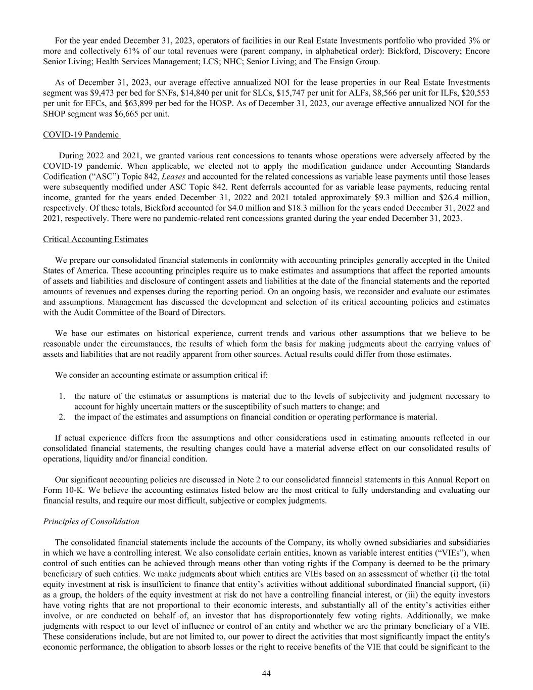 For the year ended December 31, 2023, operators of facilities in our Real Estate Investments portfolio who provided 3% or more and collectively 61% of our total revenues were (parent company, in alphabetical order): Bickford, Discovery; Encore Senior Living; Health Services Management; LCS; NHC; Senior Living; and The Ensign Group. As of December 31, 2023, our average effective annualized NOI for the lease properties in our Real Estate Investments segment was $9,473 per bed for SNFs, $14,840 per unit for SLCs, $15,747 per unit for ALFs, $8,566 per unit for ILFs, $20,553 per unit for EFCs, and $63,899 per bed for the HOSP. As of December 31, 2023, our average effective annualized NOI for the SHOP segment was $6,665 per unit. COVID-19 Pandemic During 2022 and 2021, we granted various rent concessions to tenants whose operations were adversely affected by the COVID-19 pandemic. When applicable, we elected not to apply the modification guidance under Accounting Standards Codification (“ASC”) Topic 842, Leases and accounted for the related concessions as variable lease payments until those leases were subsequently modified under ASC Topic 842. Rent deferrals accounted for as variable lease payments, reducing rental income, granted for the years ended December 31, 2022 and 2021 totaled approximately $9.3 million and $26.4 million, respectively. Of these totals, Bickford accounted for $4.0 million and $18.3 million for the years ended December 31, 2022 and 2021, respectively. There were no pandemic-related rent concessions granted during the year ended December 31, 2023. Critical Accounting Estimates We prepare our consolidated financial statements in conformity with accounting principles generally accepted in the United States of America. These accounting principles require us to make estimates and assumptions that affect the reported amounts of assets and liabilities and disclosure of contingent assets and liabilities at the date of the financial statements and the reported amounts of revenues and expenses during the reporting period. On an ongoing basis, we reconsider and evaluate our estimates and assumptions. Management has discussed the development and selection of its critical accounting policies and estimates with the Audit Committee of the Board of Directors. We base our estimates on historical experience, current trends and various other assumptions that we believe to be reasonable under the circumstances, the results of which form the basis for making judgments about the carrying values of assets and liabilities that are not readily apparent from other sources. Actual results could differ from those estimates. We consider an accounting estimate or assumption critical if: 1. the nature of the estimates or assumptions is material due to the levels of subjectivity and judgment necessary to account for highly uncertain matters or the susceptibility of such matters to change; and 2. the impact of the estimates and assumptions on financial condition or operating performance is material. If actual experience differs from the assumptions and other considerations used in estimating amounts reflected in our consolidated financial statements, the resulting changes could have a material adverse effect on our consolidated results of operations, liquidity and/or financial condition. Our significant accounting policies are discussed in Note 2 to our consolidated financial statements in this Annual Report on Form 10-K. We believe the accounting estimates listed below are the most critical to fully understanding and evaluating our financial results, and require our most difficult, subjective or complex judgments. Principles of Consolidation The consolidated financial statements include the accounts of the Company, its wholly owned subsidiaries and subsidiaries in which we have a controlling interest. We also consolidate certain entities, known as variable interest entities (“VIEs”), when control of such entities can be achieved through means other than voting rights if the Company is deemed to be the primary beneficiary of such entities. We make judgments about which entities are VIEs based on an assessment of whether (i) the total equity investment at risk is insufficient to finance that entity’s activities without additional subordinated financial support, (ii) as a group, the holders of the equity investment at risk do not have a controlling financial interest, or (iii) the equity investors have voting rights that are not proportional to their economic interests, and substantially all of the entity’s activities either involve, or are conducted on behalf of, an investor that has disproportionately few voting rights. Additionally, we make judgments with respect to our level of influence or control of an entity and whether we are the primary beneficiary of a VIE. These considerations include, but are not limited to, our power to direct the activities that most significantly impact the entity's economic performance, the obligation to absorb losses or the right to receive benefits of the VIE that could be significant to the 44