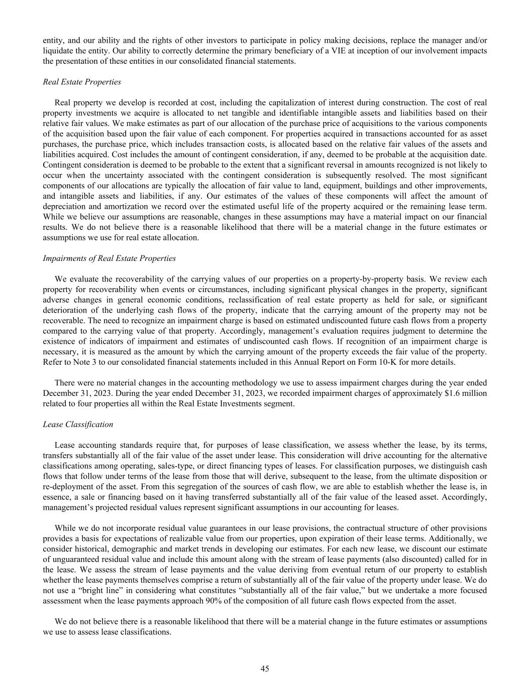entity, and our ability and the rights of other investors to participate in policy making decisions, replace the manager and/or liquidate the entity. Our ability to correctly determine the primary beneficiary of a VIE at inception of our involvement impacts the presentation of these entities in our consolidated financial statements. Real Estate Properties Real property we develop is recorded at cost, including the capitalization of interest during construction. The cost of real property investments we acquire is allocated to net tangible and identifiable intangible assets and liabilities based on their relative fair values. We make estimates as part of our allocation of the purchase price of acquisitions to the various components of the acquisition based upon the fair value of each component. For properties acquired in transactions accounted for as asset purchases, the purchase price, which includes transaction costs, is allocated based on the relative fair values of the assets and liabilities acquired. Cost includes the amount of contingent consideration, if any, deemed to be probable at the acquisition date. Contingent consideration is deemed to be probable to the extent that a significant reversal in amounts recognized is not likely to occur when the uncertainty associated with the contingent consideration is subsequently resolved. The most significant components of our allocations are typically the allocation of fair value to land, equipment, buildings and other improvements, and intangible assets and liabilities, if any. Our estimates of the values of these components will affect the amount of depreciation and amortization we record over the estimated useful life of the property acquired or the remaining lease term. While we believe our assumptions are reasonable, changes in these assumptions may have a material impact on our financial results. We do not believe there is a reasonable likelihood that there will be a material change in the future estimates or assumptions we use for real estate allocation. Impairments of Real Estate Properties We evaluate the recoverability of the carrying values of our properties on a property-by-property basis. We review each property for recoverability when events or circumstances, including significant physical changes in the property, significant adverse changes in general economic conditions, reclassification of real estate property as held for sale, or significant deterioration of the underlying cash flows of the property, indicate that the carrying amount of the property may not be recoverable. The need to recognize an impairment charge is based on estimated undiscounted future cash flows from a property compared to the carrying value of that property. Accordingly, management’s evaluation requires judgment to determine the existence of indicators of impairment and estimates of undiscounted cash flows. If recognition of an impairment charge is necessary, it is measured as the amount by which the carrying amount of the property exceeds the fair value of the property. Refer to Note 3 to our consolidated financial statements included in this Annual Report on Form 10-K for more details. There were no material changes in the accounting methodology we use to assess impairment charges during the year ended December 31, 2023. During the year ended December 31, 2023, we recorded impairment charges of approximately $1.6 million related to four properties all within the Real Estate Investments segment. Lease Classification Lease accounting standards require that, for purposes of lease classification, we assess whether the lease, by its terms, transfers substantially all of the fair value of the asset under lease. This consideration will drive accounting for the alternative classifications among operating, sales-type, or direct financing types of leases. For classification purposes, we distinguish cash flows that follow under terms of the lease from those that will derive, subsequent to the lease, from the ultimate disposition or re-deployment of the asset. From this segregation of the sources of cash flow, we are able to establish whether the lease is, in essence, a sale or financing based on it having transferred substantially all of the fair value of the leased asset. Accordingly, management’s projected residual values represent significant assumptions in our accounting for leases. While we do not incorporate residual value guarantees in our lease provisions, the contractual structure of other provisions provides a basis for expectations of realizable value from our properties, upon expiration of their lease terms. Additionally, we consider historical, demographic and market trends in developing our estimates. For each new lease, we discount our estimate of unguaranteed residual value and include this amount along with the stream of lease payments (also discounted) called for in the lease. We assess the stream of lease payments and the value deriving from eventual return of our property to establish whether the lease payments themselves comprise a return of substantially all of the fair value of the property under lease. We do not use a “bright line” in considering what constitutes “substantially all of the fair value,” but we undertake a more focused assessment when the lease payments approach 90% of the composition of all future cash flows expected from the asset. We do not believe there is a reasonable likelihood that there will be a material change in the future estimates or assumptions we use to assess lease classifications. 45