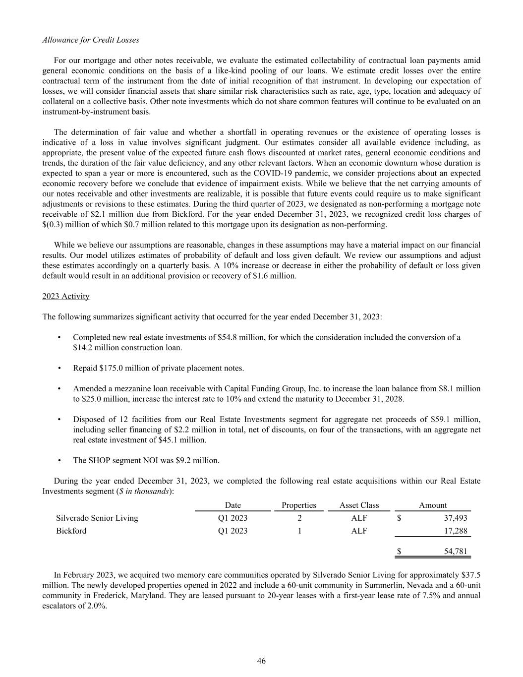 Allowance for Credit Losses For our mortgage and other notes receivable, we evaluate the estimated collectability of contractual loan payments amid general economic conditions on the basis of a like-kind pooling of our loans. We estimate credit losses over the entire contractual term of the instrument from the date of initial recognition of that instrument. In developing our expectation of losses, we will consider financial assets that share similar risk characteristics such as rate, age, type, location and adequacy of collateral on a collective basis. Other note investments which do not share common features will continue to be evaluated on an instrument-by-instrument basis. The determination of fair value and whether a shortfall in operating revenues or the existence of operating losses is indicative of a loss in value involves significant judgment. Our estimates consider all available evidence including, as appropriate, the present value of the expected future cash flows discounted at market rates, general economic conditions and trends, the duration of the fair value deficiency, and any other relevant factors. When an economic downturn whose duration is expected to span a year or more is encountered, such as the COVID-19 pandemic, we consider projections about an expected economic recovery before we conclude that evidence of impairment exists. While we believe that the net carrying amounts of our notes receivable and other investments are realizable, it is possible that future events could require us to make significant adjustments or revisions to these estimates. During the third quarter of 2023, we designated as non-performing a mortgage note receivable of $2.1 million due from Bickford. For the year ended December 31, 2023, we recognized credit loss charges of $(0.3) million of which $0.7 million related to this mortgage upon its designation as non-performing. While we believe our assumptions are reasonable, changes in these assumptions may have a material impact on our financial results. Our model utilizes estimates of probability of default and loss given default. We review our assumptions and adjust these estimates accordingly on a quarterly basis. A 10% increase or decrease in either the probability of default or loss given default would result in an additional provision or recovery of $1.6 million. 2023 Activity The following summarizes significant activity that occurred for the year ended December 31, 2023: • Completed new real estate investments of $54.8 million, for which the consideration included the conversion of a $14.2 million construction loan. • Repaid $175.0 million of private placement notes. • Amended a mezzanine loan receivable with Capital Funding Group, Inc. to increase the loan balance from $8.1 million to $25.0 million, increase the interest rate to 10% and extend the maturity to December 31, 2028. • Disposed of 12 facilities from our Real Estate Investments segment for aggregate net proceeds of $59.1 million, including seller financing of $2.2 million in total, net of discounts, on four of the transactions, with an aggregate net real estate investment of $45.1 million. • The SHOP segment NOI was $9.2 million. During the year ended December 31, 2023, we completed the following real estate acquisitions within our Real Estate Investments segment ($ in thousands): Date Properties Asset Class Amount Silverado Senior Living Q1 2023 2 ALF $ 37,493 Bickford Q1 2023 1 ALF 17,288 $ 54,781 In February 2023, we acquired two memory care communities operated by Silverado Senior Living for approximately $37.5 million. The newly developed properties opened in 2022 and include a 60-unit community in Summerlin, Nevada and a 60-unit community in Frederick, Maryland. They are leased pursuant to 20-year leases with a first-year lease rate of 7.5% and annual escalators of 2.0%. 46