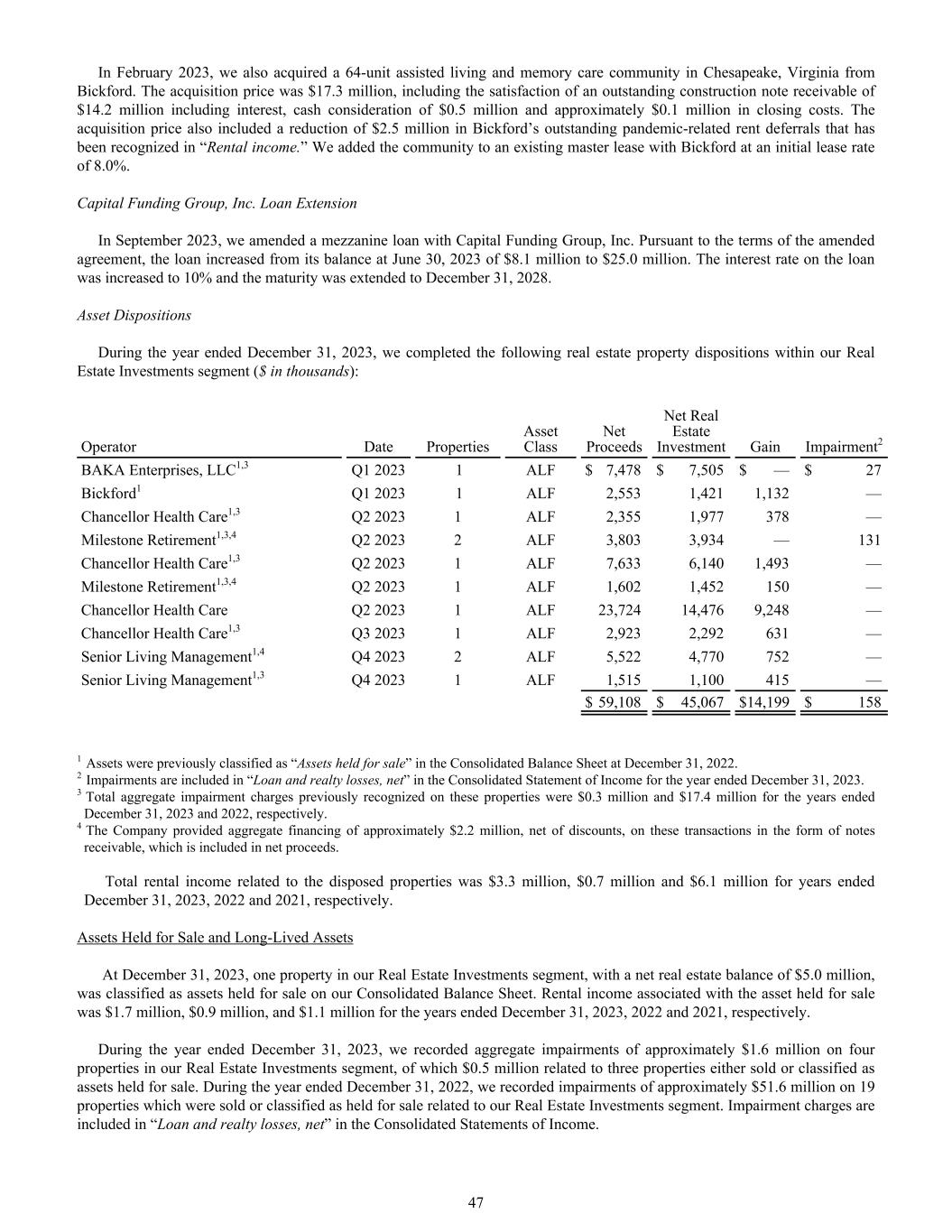 In February 2023, we also acquired a 64-unit assisted living and memory care community in Chesapeake, Virginia from Bickford. The acquisition price was $17.3 million, including the satisfaction of an outstanding construction note receivable of $14.2 million including interest, cash consideration of $0.5 million and approximately $0.1 million in closing costs. The acquisition price also included a reduction of $2.5 million in Bickford’s outstanding pandemic-related rent deferrals that has been recognized in “Rental income.” We added the community to an existing master lease with Bickford at an initial lease rate of 8.0%. Capital Funding Group, Inc. Loan Extension In September 2023, we amended a mezzanine loan with Capital Funding Group, Inc. Pursuant to the terms of the amended agreement, the loan increased from its balance at June 30, 2023 of $8.1 million to $25.0 million. The interest rate on the loan was increased to 10% and the maturity was extended to December 31, 2028. Asset Dispositions During the year ended December 31, 2023, we completed the following real estate property dispositions within our Real Estate Investments segment ($ in thousands): Operator Date Properties Asset Class Net Proceeds Net Real Estate Investment Gain Impairment2 BAKA Enterprises, LLC1,3 Q1 2023 1 ALF $ 7,478 $ 7,505 $ — $ 27 Bickford1 Q1 2023 1 ALF 2,553 1,421 1,132 — Chancellor Health Care1,3 Q2 2023 1 ALF 2,355 1,977 378 — Milestone Retirement1,3,4 Q2 2023 2 ALF 3,803 3,934 — 131 Chancellor Health Care1,3 Q2 2023 1 ALF 7,633 6,140 1,493 — Milestone Retirement1,3,4 Q2 2023 1 ALF 1,602 1,452 150 — Chancellor Health Care Q2 2023 1 ALF 23,724 14,476 9,248 — Chancellor Health Care1,3 Q3 2023 1 ALF 2,923 2,292 631 — Senior Living Management1,4 Q4 2023 2 ALF 5,522 4,770 752 — Senior Living Management1,3 Q4 2023 1 ALF 1,515 1,100 415 — $ 59,108 $ 45,067 $ 14,199 $ 158 1 Assets were previously classified as “Assets held for sale” in the Consolidated Balance Sheet at December 31, 2022. 2 Impairments are included in “Loan and realty losses, net” in the Consolidated Statement of Income for the year ended December 31, 2023. 3 Total aggregate impairment charges previously recognized on these properties were $0.3 million and $17.4 million for the years ended December 31, 2023 and 2022, respectively. 4 The Company provided aggregate financing of approximately $2.2 million, net of discounts, on these transactions in the form of notes receivable, which is included in net proceeds. Total rental income related to the disposed properties was $3.3 million, $0.7 million and $6.1 million for years ended December 31, 2023, 2022 and 2021, respectively. Assets Held for Sale and Long-Lived Assets At December 31, 2023, one property in our Real Estate Investments segment, with a net real estate balance of $5.0 million, was classified as assets held for sale on our Consolidated Balance Sheet. Rental income associated with the asset held for sale was $1.7 million, $0.9 million, and $1.1 million for the years ended December 31, 2023, 2022 and 2021, respectively. During the year ended December 31, 2023, we recorded aggregate impairments of approximately $1.6 million on four properties in our Real Estate Investments segment, of which $0.5 million related to three properties either sold or classified as assets held for sale. During the year ended December 31, 2022, we recorded impairments of approximately $51.6 million on 19 properties which were sold or classified as held for sale related to our Real Estate Investments segment. Impairment charges are included in “Loan and realty losses, net” in the Consolidated Statements of Income. 47