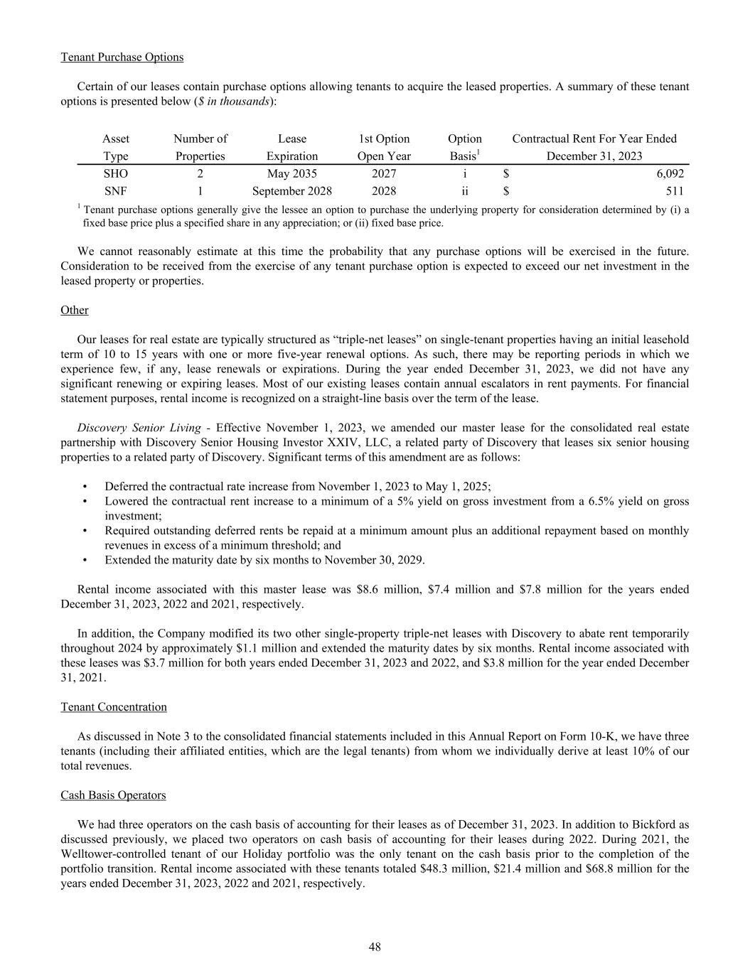 Tenant Purchase Options Certain of our leases contain purchase options allowing tenants to acquire the leased properties. A summary of these tenant options is presented below ($ in thousands): Asset Number of Lease 1st Option Option Contractual Rent For Year Ended Type Properties Expiration Open Year Basis1 December 31, 2023 SHO 2 May 2035 2027 i $ 6,092 SNF 1 September 2028 2028 ii $ 511 1 Tenant purchase options generally give the lessee an option to purchase the underlying property for consideration determined by (i) a fixed base price plus a specified share in any appreciation; or (ii) fixed base price. We cannot reasonably estimate at this time the probability that any purchase options will be exercised in the future. Consideration to be received from the exercise of any tenant purchase option is expected to exceed our net investment in the leased property or properties. Other Our leases for real estate are typically structured as “triple-net leases” on single-tenant properties having an initial leasehold term of 10 to 15 years with one or more five-year renewal options. As such, there may be reporting periods in which we experience few, if any, lease renewals or expirations. During the year ended December 31, 2023, we did not have any significant renewing or expiring leases. Most of our existing leases contain annual escalators in rent payments. For financial statement purposes, rental income is recognized on a straight-line basis over the term of the lease. Discovery Senior Living - Effective November 1, 2023, we amended our master lease for the consolidated real estate partnership with Discovery Senior Housing Investor XXIV, LLC, a related party of Discovery that leases six senior housing properties to a related party of Discovery. Significant terms of this amendment are as follows: • Deferred the contractual rate increase from November 1, 2023 to May 1, 2025; • Lowered the contractual rent increase to a minimum of a 5% yield on gross investment from a 6.5% yield on gross investment; • Required outstanding deferred rents be repaid at a minimum amount plus an additional repayment based on monthly revenues in excess of a minimum threshold; and • Extended the maturity date by six months to November 30, 2029. Rental income associated with this master lease was $8.6 million, $7.4 million and $7.8 million for the years ended December 31, 2023, 2022 and 2021, respectively. In addition, the Company modified its two other single-property triple-net leases with Discovery to abate rent temporarily throughout 2024 by approximately $1.1 million and extended the maturity dates by six months. Rental income associated with these leases was $3.7 million for both years ended December 31, 2023 and 2022, and $3.8 million for the year ended December 31, 2021. Tenant Concentration As discussed in Note 3 to the consolidated financial statements included in this Annual Report on Form 10-K, we have three tenants (including their affiliated entities, which are the legal tenants) from whom we individually derive at least 10% of our total revenues. Cash Basis Operators We had three operators on the cash basis of accounting for their leases as of December 31, 2023. In addition to Bickford as discussed previously, we placed two operators on cash basis of accounting for their leases during 2022. During 2021, the Welltower-controlled tenant of our Holiday portfolio was the only tenant on the cash basis prior to the completion of the portfolio transition. Rental income associated with these tenants totaled $48.3 million, $21.4 million and $68.8 million for the years ended December 31, 2023, 2022 and 2021, respectively. 48