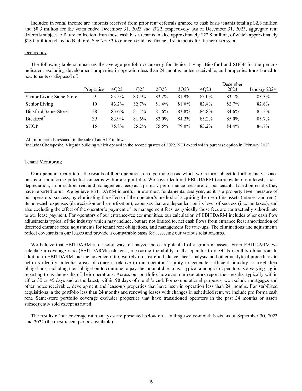 Included in rental income are amounts received from prior rent deferrals granted to cash basis tenants totaling $2.8 million and $0.3 million for the years ended December 31, 2023 and 2022, respectively. As of December 31, 2023, aggregate rent deferrals subject to future collection from these cash basis tenants totaled approximately $22.8 million, of which approximately $18.0 million related to Bickford. See Note 3 to our consolidated financial statements for further discussion. Occupancy The following table summarizes the average portfolio occupancy for Senior Living, Bickford and SHOP for the periods indicated, excluding development properties in operation less than 24 months, notes receivable, and properties transitioned to new tenants or disposed of. Properties 4Q22 1Q23 2Q23 3Q23 4Q23 December 2023 January 2024 Senior Living Same-Store 9 83.5% 83.5% 82.2% 81.9% 83.0% 83.1% 83.3% Senior Living 10 83.2% 82.7% 81.4% 81.0% 82.4% 82.7% 82.8% Bickford Same-Store1 38 83.6% 81.3% 81.6% 83.8% 84.8% 84.6% 85.3% Bickford2 39 83.9% 81.6% 82.0% 84.2% 85.2% 85.0% 85.7% SHOP 15 75.8% 75.2% 75.5% 79.0% 83.2% 84.4% 84.7% 1All prior periods restated for the sale of an ALF in Iowa. 2Includes Chesapeake, Virginia building which opened in the second quarter of 2022. NHI exercised its purchase option in February 2023. Tenant Monitoring Our operators report to us the results of their operations on a periodic basis, which we in turn subject to further analysis as a means of monitoring potential concerns within our portfolio. We have identified EBITDARM (earnings before interest, taxes, depreciation, amortization, rent and management fees) as a primary performance measure for our tenants, based on results they have reported to us. We believe EBITDARM is useful in our most fundamental analyses, as it is a property-level measure of our operators’ success, by eliminating the effects of the operator’s method of acquiring the use of its assets (interest and rent), its non-cash expenses (depreciation and amortization), expenses that are dependent on its level of success (income taxes), and also excluding the effect of the operator’s payment of its management fees, as typically those fees are contractually subordinate to our lease payment. For operators of our entrance-fee communities, our calculation of EBITDARM includes other cash flow adjustments typical of the industry which may include, but are not limited to, net cash flows from entrance fees; amortization of deferred entrance fees; adjustments for tenant rent obligations, and management fee true-ups. The eliminations and adjustments reflect covenants in our leases and provide a comparable basis for assessing our various relationships. We believe that EBITDARM is a useful way to analyze the cash potential of a group of assets. From EBITDARM we calculate a coverage ratio (EBITDARM/cash rent), measuring the ability of the operator to meet its monthly obligation. In addition to EBITDARM and the coverage ratio, we rely on a careful balance sheet analysis, and other analytical procedures to help us identify potential areas of concern relative to our operators’ ability to generate sufficient liquidity to meet their obligations, including their obligation to continue to pay the amount due to us. Typical among our operators is a varying lag in reporting to us the results of their operations. Across our portfolio, however, our operators report their results, typically within either 30 or 45 days and at the latest, within 90 days of month’s end. For computational purposes, we exclude mortgages and other notes receivable, development and lease-up properties that have been in operation less than 24 months. For stabilized acquisitions in the portfolio less than 24 months and renewing leases with changes in scheduled rent, we include pro forma cash rent. Same-store portfolio coverage excludes properties that have transitioned operators in the past 24 months or assets subsequently sold except as noted. The results of our coverage ratio analysis are presented below on a trailing twelve-month basis, as of September 30, 2023 and 2022 (the most recent periods available). 49