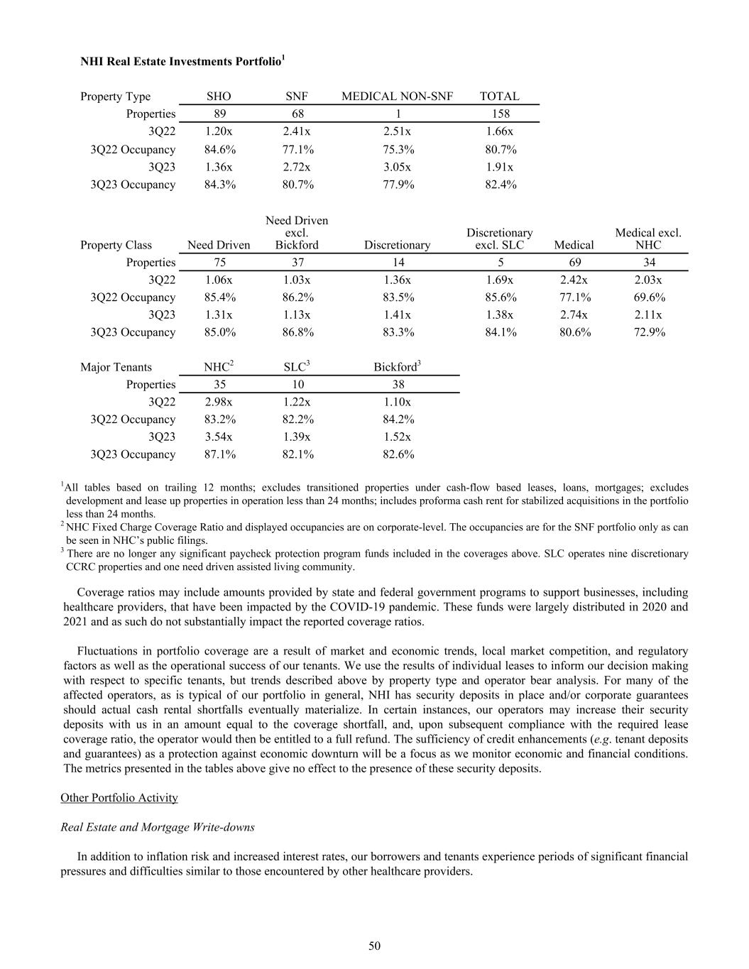 NHI Real Estate Investments Portfolio1 Property Type SHO SNF MEDICAL NON-SNF TOTAL Properties 89 68 1 158 3Q22 1.20x 2.41x 2.51x 1.66x 3Q22 Occupancy 84.6% 77.1% 75.3% 80.7% 3Q23 1.36x 2.72x 3.05x 1.91x 3Q23 Occupancy 84.3% 80.7% 77.9% 82.4% Property Class Need Driven Need Driven excl. Bickford Discretionary Discretionary excl. SLC Medical Medical excl. NHC Properties 75 37 14 5 69 34 3Q22 1.06x 1.03x 1.36x 1.69x 2.42x 2.03x 3Q22 Occupancy 85.4% 86.2% 83.5% 85.6% 77.1% 69.6% 3Q23 1.31x 1.13x 1.41x 1.38x 2.74x 2.11x 3Q23 Occupancy 85.0% 86.8% 83.3% 84.1% 80.6% 72.9% Major Tenants NHC2 SLC3 Bickford3 Properties 35 10 38 3Q22 2.98x 1.22x 1.10x 3Q22 Occupancy 83.2% 82.2% 84.2% 3Q23 3.54x 1.39x 1.52x 3Q23 Occupancy 87.1% 82.1% 82.6% 1All tables based on trailing 12 months; excludes transitioned properties under cash-flow based leases, loans, mortgages; excludes development and lease up properties in operation less than 24 months; includes proforma cash rent for stabilized acquisitions in the portfolio less than 24 months. 2 NHC Fixed Charge Coverage Ratio and displayed occupancies are on corporate-level. The occupancies are for the SNF portfolio only as can be seen in NHC’s public filings. 3 There are no longer any significant paycheck protection program funds included in the coverages above. SLC operates nine discretionary CCRC properties and one need driven assisted living community. Coverage ratios may include amounts provided by state and federal government programs to support businesses, including healthcare providers, that have been impacted by the COVID-19 pandemic. These funds were largely distributed in 2020 and 2021 and as such do not substantially impact the reported coverage ratios. Fluctuations in portfolio coverage are a result of market and economic trends, local market competition, and regulatory factors as well as the operational success of our tenants. We use the results of individual leases to inform our decision making with respect to specific tenants, but trends described above by property type and operator bear analysis. For many of the affected operators, as is typical of our portfolio in general, NHI has security deposits in place and/or corporate guarantees should actual cash rental shortfalls eventually materialize. In certain instances, our operators may increase their security deposits with us in an amount equal to the coverage shortfall, and, upon subsequent compliance with the required lease coverage ratio, the operator would then be entitled to a full refund. The sufficiency of credit enhancements (e.g. tenant deposits and guarantees) as a protection against economic downturn will be a focus as we monitor economic and financial conditions. The metrics presented in the tables above give no effect to the presence of these security deposits. Other Portfolio Activity Real Estate and Mortgage Write-downs In addition to inflation risk and increased interest rates, our borrowers and tenants experience periods of significant financial pressures and difficulties similar to those encountered by other healthcare providers. 50