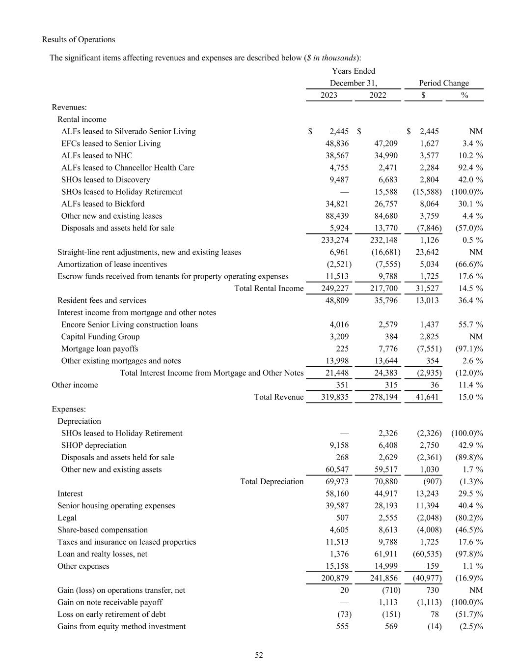 Results of Operations The significant items affecting revenues and expenses are described below ($ in thousands): Years Ended December 31, Period Change 2023 2022 $ % Revenues: Rental income ALFs leased to Silverado Senior Living $ 2,445 $ — $ 2,445 NM EFCs leased to Senior Living 48,836 47,209 1,627 3.4 % ALFs leased to NHC 38,567 34,990 3,577 10.2 % ALFs leased to Chancellor Health Care 4,755 2,471 2,284 92.4 % SHOs leased to Discovery 9,487 6,683 2,804 42.0 % SHOs leased to Holiday Retirement — 15,588 (15,588) (100.0) % ALFs leased to Bickford 34,821 26,757 8,064 30.1 % Other new and existing leases 88,439 84,680 3,759 4.4 % Disposals and assets held for sale 5,924 13,770 (7,846) (57.0) % 233,274 232,148 1,126 0.5 % Straight-line rent adjustments, new and existing leases 6,961 (16,681) 23,642 NM Amortization of lease incentives (2,521) (7,555) 5,034 (66.6) % Escrow funds received from tenants for property operating expenses 11,513 9,788 1,725 17.6 % Total Rental Income 249,227 217,700 31,527 14.5 % Resident fees and services 48,809 35,796 13,013 36.4 % Interest income from mortgage and other notes Encore Senior Living construction loans 4,016 2,579 1,437 55.7 % Capital Funding Group 3,209 384 2,825 NM Mortgage loan payoffs 225 7,776 (7,551) (97.1) % Other existing mortgages and notes 13,998 13,644 354 2.6 % Total Interest Income from Mortgage and Other Notes 21,448 24,383 (2,935) (12.0) % Other income 351 315 36 11.4 % Total Revenue 319,835 278,194 41,641 15.0 % Expenses: Depreciation SHOs leased to Holiday Retirement — 2,326 (2,326) (100.0) % SHOP depreciation 9,158 6,408 2,750 42.9 % Disposals and assets held for sale 268 2,629 (2,361) (89.8) % Other new and existing assets 60,547 59,517 1,030 1.7 % Total Depreciation 69,973 70,880 (907) (1.3) % Interest 58,160 44,917 13,243 29.5 % Senior housing operating expenses 39,587 28,193 11,394 40.4 % Legal 507 2,555 (2,048) (80.2) % Share-based compensation 4,605 8,613 (4,008) (46.5) % Taxes and insurance on leased properties 11,513 9,788 1,725 17.6 % Loan and realty losses, net 1,376 61,911 (60,535) (97.8) % Other expenses 15,158 14,999 159 1.1 % 200,879 241,856 (40,977) (16.9) % Gain (loss) on operations transfer, net 20 (710) 730 NM Gain on note receivable payoff — 1,113 (1,113) (100.0) % Loss on early retirement of debt (73) (151) 78 (51.7) % Gains from equity method investment 555 569 (14) (2.5) % 52