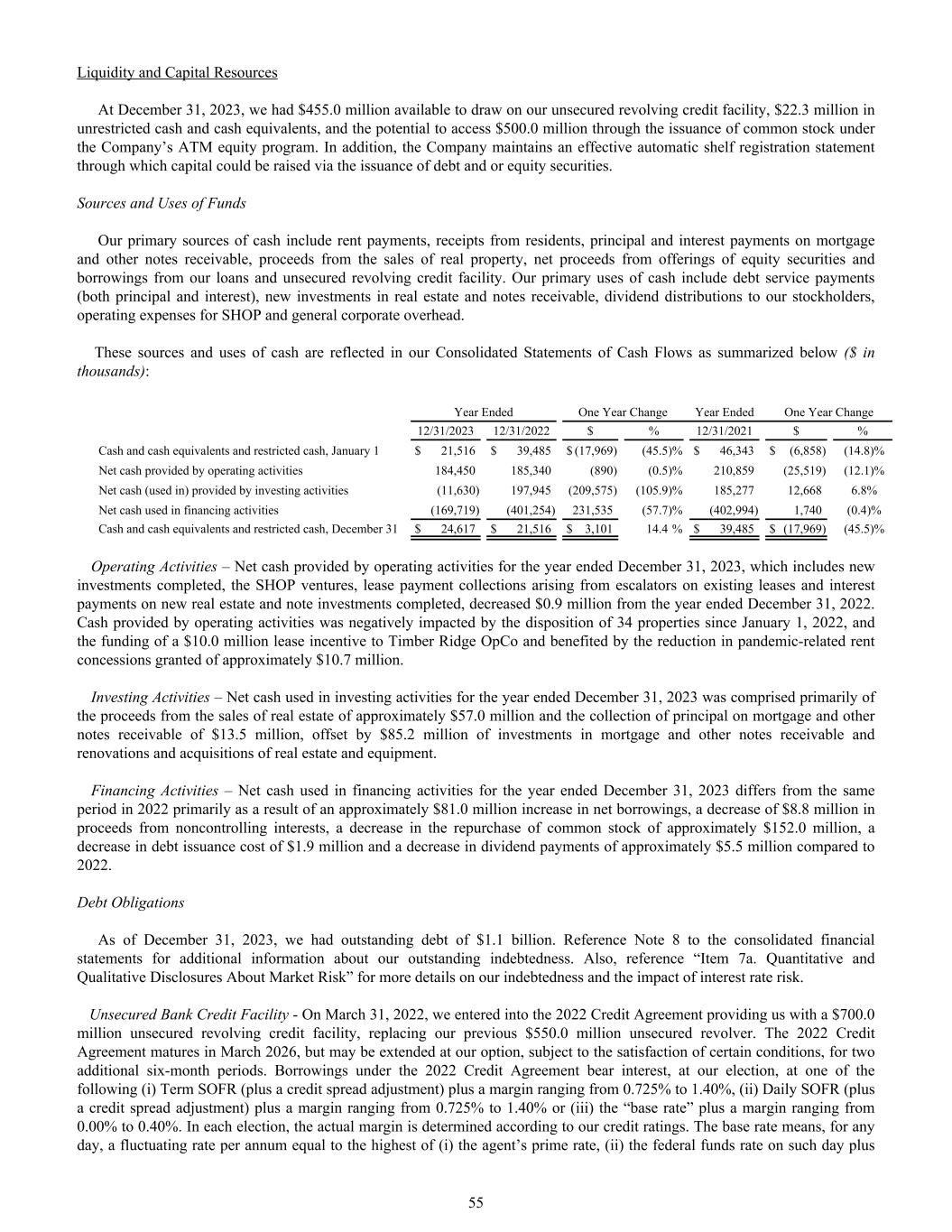 Liquidity and Capital Resources At December 31, 2023, we had $455.0 million available to draw on our unsecured revolving credit facility, $22.3 million in unrestricted cash and cash equivalents, and the potential to access $500.0 million through the issuance of common stock under the Company’s ATM equity program. In addition, the Company maintains an effective automatic shelf registration statement through which capital could be raised via the issuance of debt and or equity securities. Sources and Uses of Funds Our primary sources of cash include rent payments, receipts from residents, principal and interest payments on mortgage and other notes receivable, proceeds from the sales of real property, net proceeds from offerings of equity securities and borrowings from our loans and unsecured revolving credit facility. Our primary uses of cash include debt service payments (both principal and interest), new investments in real estate and notes receivable, dividend distributions to our stockholders, operating expenses for SHOP and general corporate overhead. These sources and uses of cash are reflected in our Consolidated Statements of Cash Flows as summarized below ($ in thousands): Year Ended One Year Change Year Ended One Year Change 12/31/2023 12/31/2022 $ % 12/31/2021 $ % Cash and cash equivalents and restricted cash, January 1 $ 21,516 $ 39,485 $ (17,969) (45.5) % $ 46,343 $ (6,858) (14.8)% Net cash provided by operating activities 184,450 185,340 (890) (0.5) % 210,859 (25,519) (12.1)% Net cash (used in) provided by investing activities (11,630) 197,945 (209,575) (105.9) % 185,277 12,668 6.8% Net cash used in financing activities (169,719) (401,254) 231,535 (57.7) % (402,994) 1,740 (0.4)% Cash and cash equivalents and restricted cash, December 31 $ 24,617 $ 21,516 $ 3,101 14.4 % $ 39,485 $ (17,969) (45.5)% Operating Activities – Net cash provided by operating activities for the year ended December 31, 2023, which includes new investments completed, the SHOP ventures, lease payment collections arising from escalators on existing leases and interest payments on new real estate and note investments completed, decreased $0.9 million from the year ended December 31, 2022. Cash provided by operating activities was negatively impacted by the disposition of 34 properties since January 1, 2022, and the funding of a $10.0 million lease incentive to Timber Ridge OpCo and benefited by the reduction in pandemic-related rent concessions granted of approximately $10.7 million. Investing Activities – Net cash used in investing activities for the year ended December 31, 2023 was comprised primarily of the proceeds from the sales of real estate of approximately $57.0 million and the collection of principal on mortgage and other notes receivable of $13.5 million, offset by $85.2 million of investments in mortgage and other notes receivable and renovations and acquisitions of real estate and equipment. Financing Activities – Net cash used in financing activities for the year ended December 31, 2023 differs from the same period in 2022 primarily as a result of an approximately $81.0 million increase in net borrowings, a decrease of $8.8 million in proceeds from noncontrolling interests, a decrease in the repurchase of common stock of approximately $152.0 million, a decrease in debt issuance cost of $1.9 million and a decrease in dividend payments of approximately $5.5 million compared to 2022. Debt Obligations As of December 31, 2023, we had outstanding debt of $1.1 billion. Reference Note 8 to the consolidated financial statements for additional information about our outstanding indebtedness. Also, reference “Item 7a. Quantitative and Qualitative Disclosures About Market Risk” for more details on our indebtedness and the impact of interest rate risk. Unsecured Bank Credit Facility - On March 31, 2022, we entered into the 2022 Credit Agreement providing us with a $700.0 million unsecured revolving credit facility, replacing our previous $550.0 million unsecured revolver. The 2022 Credit Agreement matures in March 2026, but may be extended at our option, subject to the satisfaction of certain conditions, for two additional six-month periods. Borrowings under the 2022 Credit Agreement bear interest, at our election, at one of the following (i) Term SOFR (plus a credit spread adjustment) plus a margin ranging from 0.725% to 1.40%, (ii) Daily SOFR (plus a credit spread adjustment) plus a margin ranging from 0.725% to 1.40% or (iii) the “base rate” plus a margin ranging from 0.00% to 0.40%. In each election, the actual margin is determined according to our credit ratings. The base rate means, for any day, a fluctuating rate per annum equal to the highest of (i) the agent’s prime rate, (ii) the federal funds rate on such day plus 55