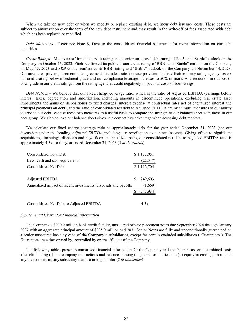 When we take on new debt or when we modify or replace existing debt, we incur debt issuance costs. These costs are subject to amortization over the term of the new debt instrument and may result in the write-off of fees associated with debt which has been replaced or modified. Debt Maturities - Reference Note 8, Debt to the consolidated financial statements for more information on our debt maturities. Credit Ratings - Moody's reaffirmed its credit rating and a senior unsecured debt rating of Baa3 and “Stable” outlook on the Company on October 16, 2023. Fitch reaffirmed its public issuer credit rating of BBB- and “Stable” outlook on the Company on May 15, 2023 and S&P Global reaffirmed its BBB- rating and “Stable” outlook on the Company on November 14, 2023. Our unsecured private placement note agreements include a rate increase provision that is effective if any rating agency lowers our credit rating below investment grade and our compliance leverage increases to 50% or more. Any reduction in outlook or downgrade in our credit ratings from the rating agencies could negatively impact our costs of borrowings. Debt Metrics - We believe that our fixed charge coverage ratio, which is the ratio of Adjusted EBITDA (earnings before interest, taxes, depreciation and amortization, including amounts in discontinued operations, excluding real estate asset impairments and gains on dispositions) to fixed charges (interest expense at contractual rates net of capitalized interest and principal payments on debt), and the ratio of consolidated net debt to Adjusted EBITDA are meaningful measures of our ability to service our debt. We use these two measures as a useful basis to compare the strength of our balance sheet with those in our peer group. We also believe our balance sheet gives us a competitive advantage when accessing debt markets. We calculate our fixed charge coverage ratio as approximately 4.5x for the year ended December 31, 2023 (see our discussion under the heading Adjusted EBITDA including a reconciliation to our net income). Giving effect to significant acquisitions, financings, disposals and payoffs on an annualized basis, our consolidated net debt to Adjusted EBITDA ratio is approximately 4.5x for the year ended December 31, 2023 ($ in thousands): Consolidated Total Debt $ 1,135,051 Less: cash and cash equivalents (22,347) Consolidated Net Debt $ 1,112,704 Adjusted EBITDA $ 249,603 Annualized impact of recent investments, disposals and payoffs (1,669) $ 247,934 Consolidated Net Debt to Adjusted EBITDA 4.5x Supplemental Guarantor Financial Information The Company’s $900.0 million bank credit facility, unsecured private placement notes due September 2024 through January 2027 with an aggregate principal amount of $225.0 million and 2031 Senior Notes are fully and unconditionally guaranteed on a senior unsecured basis by each of the Company’s subsidiaries, except for certain excluded subsidiaries (“Guarantors”). The Guarantors are either owned by, controlled by or are affiliates of the Company. The following tables present summarized financial information for the Company and the Guarantors, on a combined basis after eliminating (i) intercompany transactions and balances among the guarantor entities and (ii) equity in earnings from, and any investments in, any subsidiary that is a non-guarantor ($ in thousands): 57