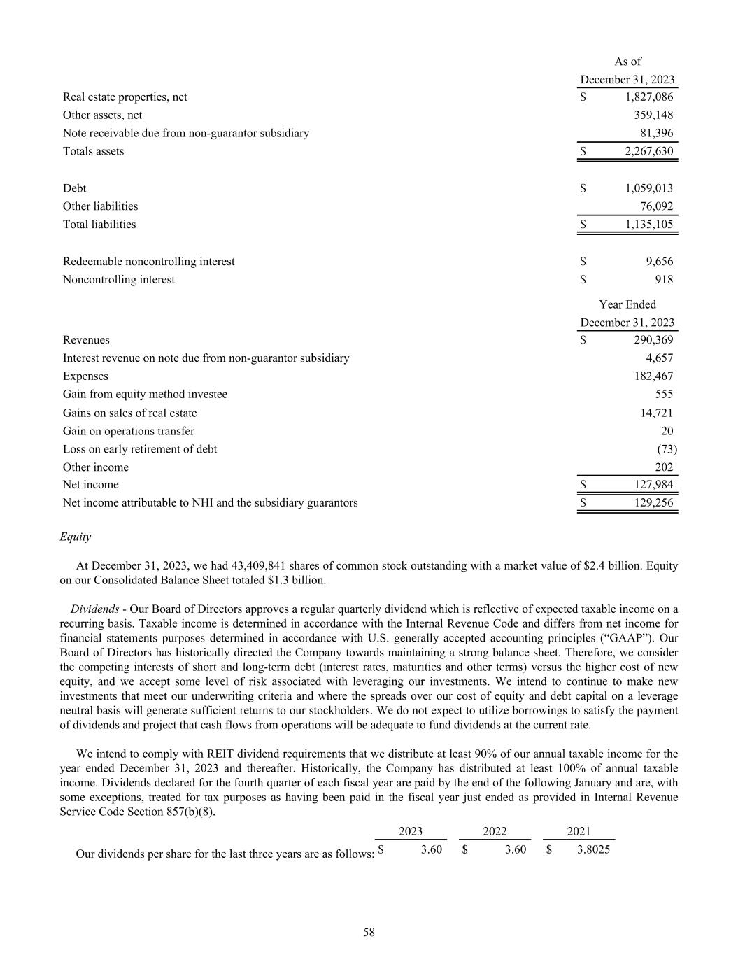 As of December 31, 2023 Real estate properties, net $ 1,827,086 Other assets, net 359,148 Note receivable due from non-guarantor subsidiary 81,396 Totals assets $ 2,267,630 Debt $ 1,059,013 Other liabilities 76,092 Total liabilities $ 1,135,105 Redeemable noncontrolling interest $ 9,656 Noncontrolling interest $ 918 Year Ended December 31, 2023 Revenues $ 290,369 Interest revenue on note due from non-guarantor subsidiary 4,657 Expenses 182,467 Gain from equity method investee 555 Gains on sales of real estate 14,721 Gain on operations transfer 20 Loss on early retirement of debt (73) Other income 202 Net income $ 127,984 Net income attributable to NHI and the subsidiary guarantors $ 129,256 Equity At December 31, 2023, we had 43,409,841 shares of common stock outstanding with a market value of $2.4 billion. Equity on our Consolidated Balance Sheet totaled $1.3 billion. Dividends - Our Board of Directors approves a regular quarterly dividend which is reflective of expected taxable income on a recurring basis. Taxable income is determined in accordance with the Internal Revenue Code and differs from net income for financial statements purposes determined in accordance with U.S. generally accepted accounting principles (“GAAP”). Our Board of Directors has historically directed the Company towards maintaining a strong balance sheet. Therefore, we consider the competing interests of short and long-term debt (interest rates, maturities and other terms) versus the higher cost of new equity, and we accept some level of risk associated with leveraging our investments. We intend to continue to make new investments that meet our underwriting criteria and where the spreads over our cost of equity and debt capital on a leverage neutral basis will generate sufficient returns to our stockholders. We do not expect to utilize borrowings to satisfy the payment of dividends and project that cash flows from operations will be adequate to fund dividends at the current rate. We intend to comply with REIT dividend requirements that we distribute at least 90% of our annual taxable income for the year ended December 31, 2023 and thereafter. Historically, the Company has distributed at least 100% of annual taxable income. Dividends declared for the fourth quarter of each fiscal year are paid by the end of the following January and are, with some exceptions, treated for tax purposes as having been paid in the fiscal year just ended as provided in Internal Revenue Service Code Section 857(b)(8). Our dividends per share for the last three years are as follows: 2023 2022 2021 $ 3.60 $ 3.60 $ 3.8025 58