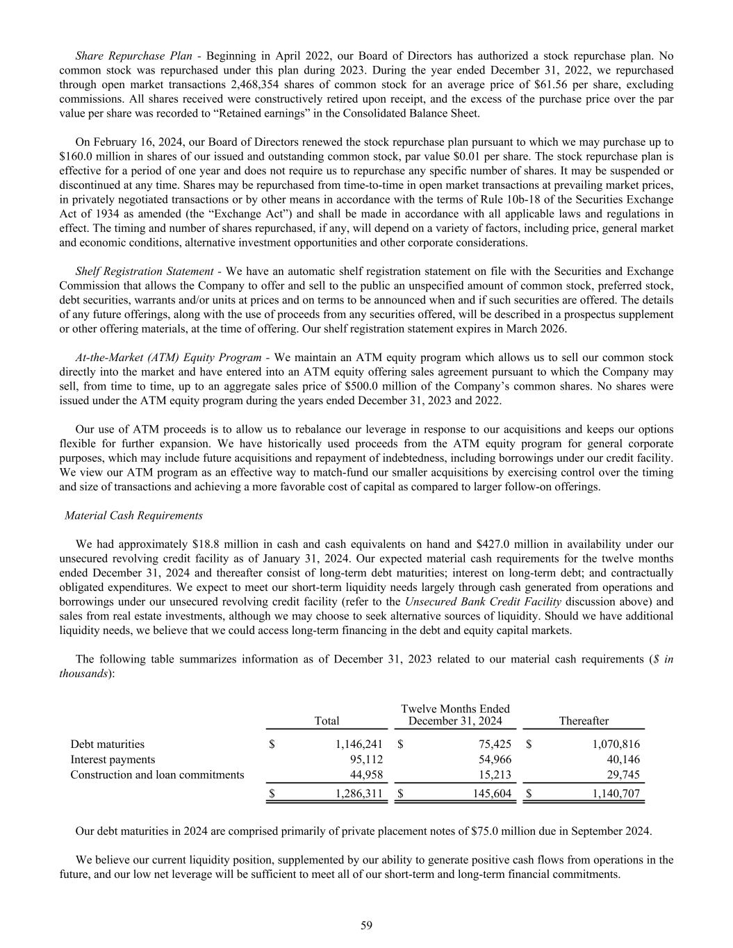 Share Repurchase Plan - Beginning in April 2022, our Board of Directors has authorized a stock repurchase plan. No common stock was repurchased under this plan during 2023. During the year ended December 31, 2022, we repurchased through open market transactions 2,468,354 shares of common stock for an average price of $61.56 per share, excluding commissions. All shares received were constructively retired upon receipt, and the excess of the purchase price over the par value per share was recorded to “Retained earnings” in the Consolidated Balance Sheet. On February 16, 2024, our Board of Directors renewed the stock repurchase plan pursuant to which we may purchase up to $160.0 million in shares of our issued and outstanding common stock, par value $0.01 per share. The stock repurchase plan is effective for a period of one year and does not require us to repurchase any specific number of shares. It may be suspended or discontinued at any time. Shares may be repurchased from time-to-time in open market transactions at prevailing market prices, in privately negotiated transactions or by other means in accordance with the terms of Rule 10b-18 of the Securities Exchange Act of 1934 as amended (the “Exchange Act”) and shall be made in accordance with all applicable laws and regulations in effect. The timing and number of shares repurchased, if any, will depend on a variety of factors, including price, general market and economic conditions, alternative investment opportunities and other corporate considerations. Shelf Registration Statement - We have an automatic shelf registration statement on file with the Securities and Exchange Commission that allows the Company to offer and sell to the public an unspecified amount of common stock, preferred stock, debt securities, warrants and/or units at prices and on terms to be announced when and if such securities are offered. The details of any future offerings, along with the use of proceeds from any securities offered, will be described in a prospectus supplement or other offering materials, at the time of offering. Our shelf registration statement expires in March 2026. At-the-Market (ATM) Equity Program - We maintain an ATM equity program which allows us to sell our common stock directly into the market and have entered into an ATM equity offering sales agreement pursuant to which the Company may sell, from time to time, up to an aggregate sales price of $500.0 million of the Company’s common shares. No shares were issued under the ATM equity program during the years ended December 31, 2023 and 2022. Our use of ATM proceeds is to allow us to rebalance our leverage in response to our acquisitions and keeps our options flexible for further expansion. We have historically used proceeds from the ATM equity program for general corporate purposes, which may include future acquisitions and repayment of indebtedness, including borrowings under our credit facility. We view our ATM program as an effective way to match-fund our smaller acquisitions by exercising control over the timing and size of transactions and achieving a more favorable cost of capital as compared to larger follow-on offerings. Material Cash Requirements We had approximately $18.8 million in cash and cash equivalents on hand and $427.0 million in availability under our unsecured revolving credit facility as of January 31, 2024. Our expected material cash requirements for the twelve months ended December 31, 2024 and thereafter consist of long-term debt maturities; interest on long-term debt; and contractually obligated expenditures. We expect to meet our short-term liquidity needs largely through cash generated from operations and borrowings under our unsecured revolving credit facility (refer to the Unsecured Bank Credit Facility discussion above) and sales from real estate investments, although we may choose to seek alternative sources of liquidity. Should we have additional liquidity needs, we believe that we could access long-term financing in the debt and equity capital markets. The following table summarizes information as of December 31, 2023 related to our material cash requirements ($ in thousands): Total Twelve Months Ended December 31, 2024 Thereafter Debt maturities $ 1,146,241 $ 75,425 $ 1,070,816 Interest payments 95,112 54,966 40,146 Construction and loan commitments 44,958 15,213 29,745 $ 1,286,311 $ 145,604 $ 1,140,707 Our debt maturities in 2024 are comprised primarily of private placement notes of $75.0 million due in September 2024. We believe our current liquidity position, supplemented by our ability to generate positive cash flows from operations in the future, and our low net leverage will be sufficient to meet all of our short-term and long-term financial commitments. 59