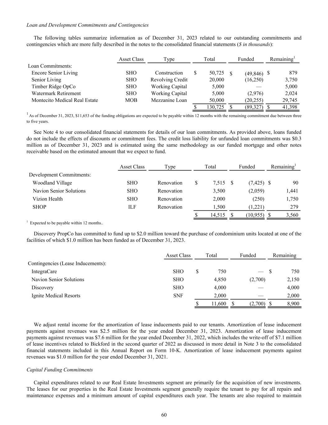 Loan and Development Commitments and Contingencies The following tables summarize information as of December 31, 2023 related to our outstanding commitments and contingencies which are more fully described in the notes to the consolidated financial statements ($ in thousands): Asset Class Type Total Funded Remaining1 Loan Commitments: Encore Senior Living SHO Construction $ 50,725 $ (49,846) $ 879 Senior Living SHO Revolving Credit 20,000 (16,250) 3,750 Timber Ridge OpCo SHO Working Capital 5,000 — 5,000 Watermark Retirement SHO Working Capital 5,000 (2,976) 2,024 Montecito Medical Real Estate MOB Mezzanine Loan 50,000 (20,255) 29,745 $ 130,725 $ (89,327) $ 41,398 1 As of December 31, 2023, $11,653 of the funding obligations are expected to be payable within 12 months with the remaining commitment due between three to five years. See Note 4 to our consolidated financial statements for details of our loan commitments. As provided above, loans funded do not include the effects of discounts or commitment fees. The credit loss liability for unfunded loan commitments was $0.3 million as of December 31, 2023 and is estimated using the same methodology as our funded mortgage and other notes receivable based on the estimated amount that we expect to fund. Asset Class Type Total Funded Remaining1 Development Commitments: Woodland Village SHO Renovation $ 7,515 $ (7,425) $ 90 Navion Senior Solutions SHO Renovation 3,500 (2,059) 1,441 Vizion Health SHO Renovation 2,000 (250) 1,750 SHOP ILF Renovation 1,500 (1,221) 279 $ 14,515 $ (10,955) $ 3,560 1 Expected to be payable within 12 months.. Discovery PropCo has committed to fund up to $2.0 million toward the purchase of condominium units located at one of the facilities of which $1.0 million has been funded as of December 31, 2023. Asset Class Total Funded Remaining Contingencies (Lease Inducements): IntegraCare SHO $ 750 — $ 750 Navion Senior Solutions SHO 4,850 (2,700) 2,150 Discovery SHO 4,000 — 4,000 Ignite Medical Resorts SNF 2,000 — 2,000 $ 11,600 $ (2,700) $ 8,900 We adjust rental income for the amortization of lease inducements paid to our tenants. Amortization of lease inducement payments against revenues was $2.5 million for the year ended December 31, 2023. Amortization of lease inducement payments against revenues was $7.6 million for the year ended December 31, 2022, which includes the write-off of $7.1 million of lease incentives related to Bickford in the second quarter of 2022 as discussed in more detail in Note 3 to the consolidated financial statements included in this Annual Report on Form 10-K. Amortization of lease inducement payments against revenues was $1.0 million for the year ended December 31, 2021. Capital Funding Commitments Capital expenditures related to our Real Estate Investments segment are primarily for the acquisition of new investments. The leases for our properties in the Real Estate Investments segment generally require the tenant to pay for all repairs and maintenance expenses and a minimum amount of capital expenditures each year. The tenants are also required to maintain 60
