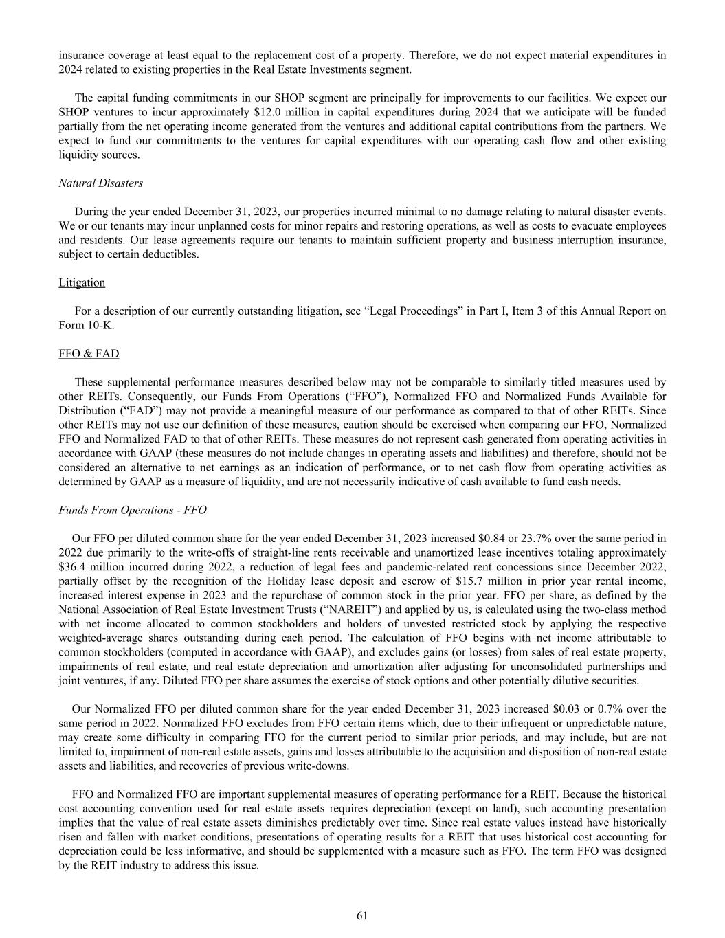 insurance coverage at least equal to the replacement cost of a property. Therefore, we do not expect material expenditures in 2024 related to existing properties in the Real Estate Investments segment. The capital funding commitments in our SHOP segment are principally for improvements to our facilities. We expect our SHOP ventures to incur approximately $12.0 million in capital expenditures during 2024 that we anticipate will be funded partially from the net operating income generated from the ventures and additional capital contributions from the partners. We expect to fund our commitments to the ventures for capital expenditures with our operating cash flow and other existing liquidity sources. Natural Disasters During the year ended December 31, 2023, our properties incurred minimal to no damage relating to natural disaster events. We or our tenants may incur unplanned costs for minor repairs and restoring operations, as well as costs to evacuate employees and residents. Our lease agreements require our tenants to maintain sufficient property and business interruption insurance, subject to certain deductibles. Litigation For a description of our currently outstanding litigation, see “Legal Proceedings” in Part I, Item 3 of this Annual Report on Form 10-K. FFO & FAD These supplemental performance measures described below may not be comparable to similarly titled measures used by other REITs. Consequently, our Funds From Operations (“FFO”), Normalized FFO and Normalized Funds Available for Distribution (“FAD”) may not provide a meaningful measure of our performance as compared to that of other REITs. Since other REITs may not use our definition of these measures, caution should be exercised when comparing our FFO, Normalized FFO and Normalized FAD to that of other REITs. These measures do not represent cash generated from operating activities in accordance with GAAP (these measures do not include changes in operating assets and liabilities) and therefore, should not be considered an alternative to net earnings as an indication of performance, or to net cash flow from operating activities as determined by GAAP as a measure of liquidity, and are not necessarily indicative of cash available to fund cash needs. Funds From Operations - FFO Our FFO per diluted common share for the year ended December 31, 2023 increased $0.84 or 23.7% over the same period in 2022 due primarily to the write-offs of straight-line rents receivable and unamortized lease incentives totaling approximately $36.4 million incurred during 2022, a reduction of legal fees and pandemic-related rent concessions since December 2022, partially offset by the recognition of the Holiday lease deposit and escrow of $15.7 million in prior year rental income, increased interest expense in 2023 and the repurchase of common stock in the prior year. FFO per share, as defined by the National Association of Real Estate Investment Trusts (“NAREIT”) and applied by us, is calculated using the two-class method with net income allocated to common stockholders and holders of unvested restricted stock by applying the respective weighted-average shares outstanding during each period. The calculation of FFO begins with net income attributable to common stockholders (computed in accordance with GAAP), and excludes gains (or losses) from sales of real estate property, impairments of real estate, and real estate depreciation and amortization after adjusting for unconsolidated partnerships and joint ventures, if any. Diluted FFO per share assumes the exercise of stock options and other potentially dilutive securities. Our Normalized FFO per diluted common share for the year ended December 31, 2023 increased $0.03 or 0.7% over the same period in 2022. Normalized FFO excludes from FFO certain items which, due to their infrequent or unpredictable nature, may create some difficulty in comparing FFO for the current period to similar prior periods, and may include, but are not limited to, impairment of non-real estate assets, gains and losses attributable to the acquisition and disposition of non-real estate assets and liabilities, and recoveries of previous write-downs. FFO and Normalized FFO are important supplemental measures of operating performance for a REIT. Because the historical cost accounting convention used for real estate assets requires depreciation (except on land), such accounting presentation implies that the value of real estate assets diminishes predictably over time. Since real estate values instead have historically risen and fallen with market conditions, presentations of operating results for a REIT that uses historical cost accounting for depreciation could be less informative, and should be supplemented with a measure such as FFO. The term FFO was designed by the REIT industry to address this issue. 61