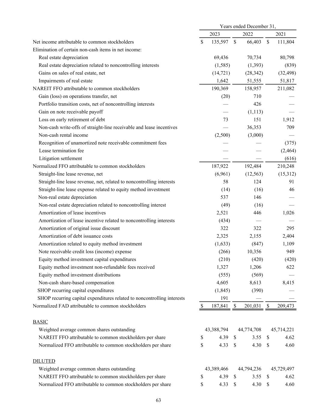 Years ended December 31, 2023 2022 2021 Net income attributable to common stockholders $ 135,597 $ 66,403 $ 111,804 Elimination of certain non-cash items in net income: Real estate depreciation 69,436 70,734 80,798 Real estate depreciation related to noncontrolling interests (1,585) (1,393) (839) Gains on sales of real estate, net (14,721) (28,342) (32,498) Impairments of real estate 1,642 51,555 51,817 NAREIT FFO attributable to common stockholders 190,369 158,957 211,082 Gain (loss) on operations transfer, net (20) 710 — Portfolio transition costs, net of noncontrolling interests — 426 — Gain on note receivable payoff — (1,113) — Loss on early retirement of debt 73 151 1,912 Non-cash write-offs of straight-line receivable and lease incentives — 36,353 709 Non-cash rental income (2,500) (3,000) — Recognition of unamortized note receivable commitment fees — — (375) Lease termination fee — — (2,464) Litigation settlement — — (616) Normalized FFO attributable to common stockholders 187,922 192,484 210,248 Straight-line lease revenue, net (6,961) (12,563) (15,312) Straight-line lease revenue, net, related to noncontrolling interests 58 124 91 Straight-line lease expense related to equity method investment (14) (16) 46 Non-real estate depreciation 537 146 — Non-real estate depreciation related to noncontrolling interest (49) (16) — Amortization of lease incentives 2,521 446 1,026 Amortization of lease incentive related to noncontrolling interests (434) — — Amortization of original issue discount 322 322 295 Amortization of debt issuance costs 2,325 2,155 2,404 Amortization related to equity method investment (1,633) (847) 1,109 Note receivable credit loss (income) expense (266) 10,356 949 Equity method investment capital expenditures (210) (420) (420) Equity method investment non-refundable fees received 1,327 1,206 622 Equity method investment distributions (555) (569) — Non-cash share-based compensation 4,605 8,613 8,415 SHOP recurring capital expenditures (1,845) (390) — SHOP recurring capital expenditures related to noncontrolling interests 191 — — Normalized FAD attributable to common stockholders $ 187,841 $ 201,031 $ 209,473 BASIC Weighted average common shares outstanding 43,388,794 44,774,708 45,714,221 NAREIT FFO attributable to common stockholders per share $ 4.39 $ 3.55 $ 4.62 Normalized FFO attributable to common stockholders per share $ 4.33 $ 4.30 $ 4.60 DILUTED Weighted average common shares outstanding 43,389,466 44,794,236 45,729,497 NAREIT FFO attributable to common stockholders per share $ 4.39 $ 3.55 $ 4.62 Normalized FFO attributable to common stockholders per share $ 4.33 $ 4.30 $ 4.60 63